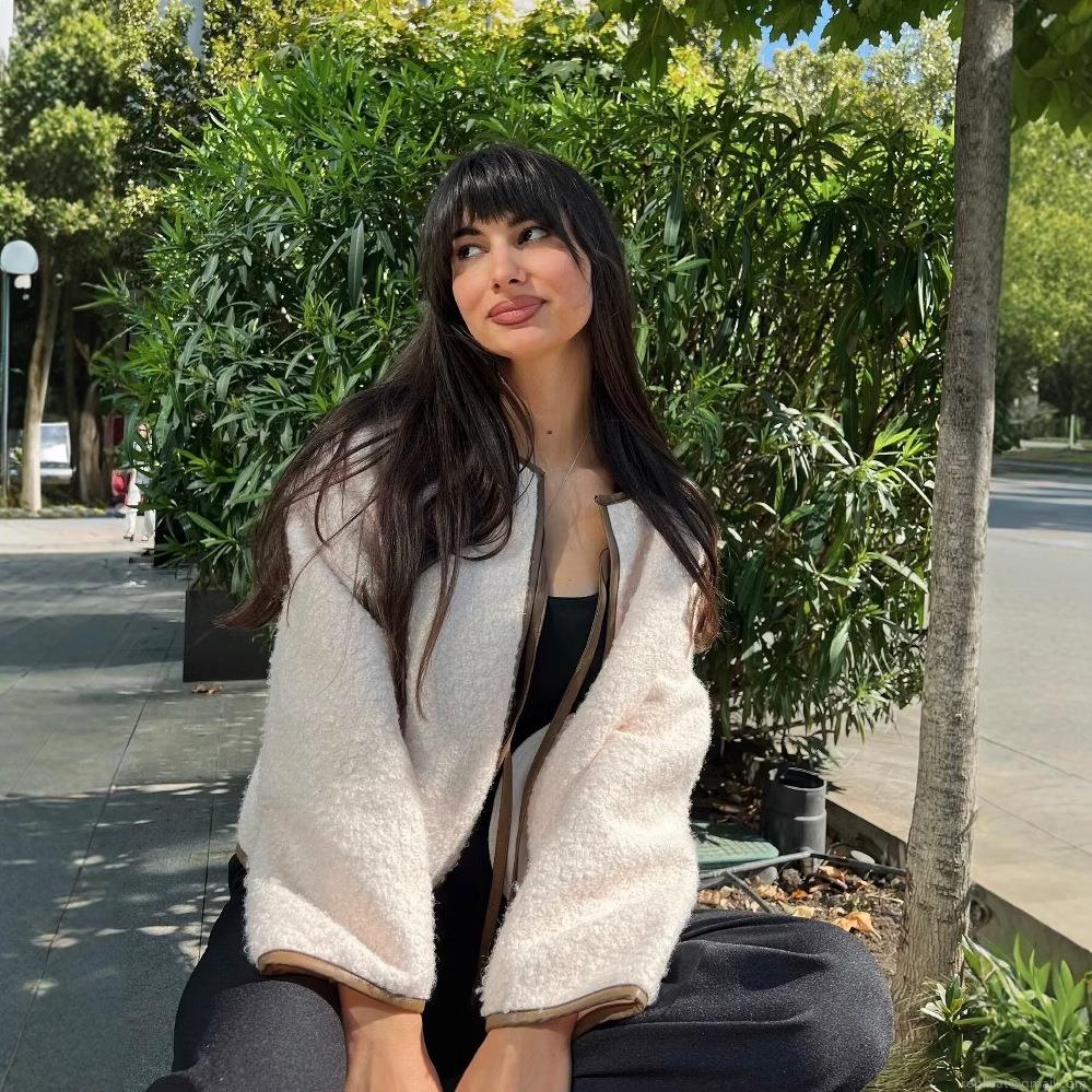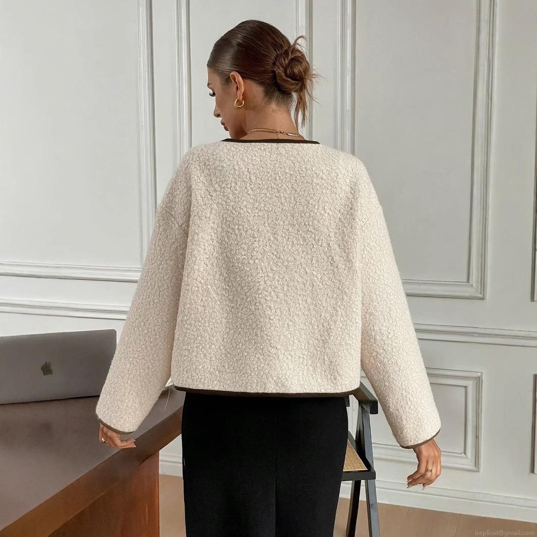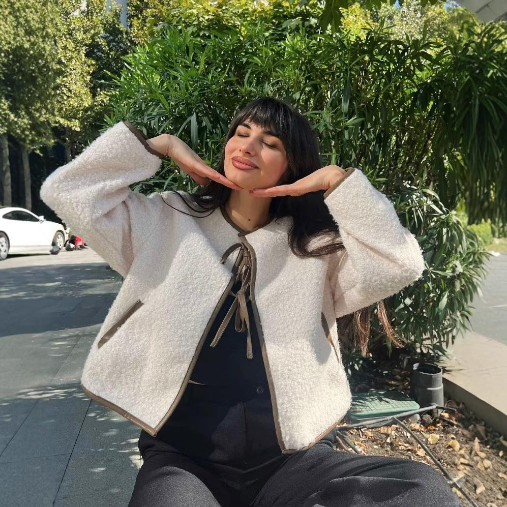 • Women's Casual Polar Fleece Short Jacket With Contrast Piping And Bow Tie Lace-up Round Neck Loose Long Sleeve Coat For Daily Winter Fashion