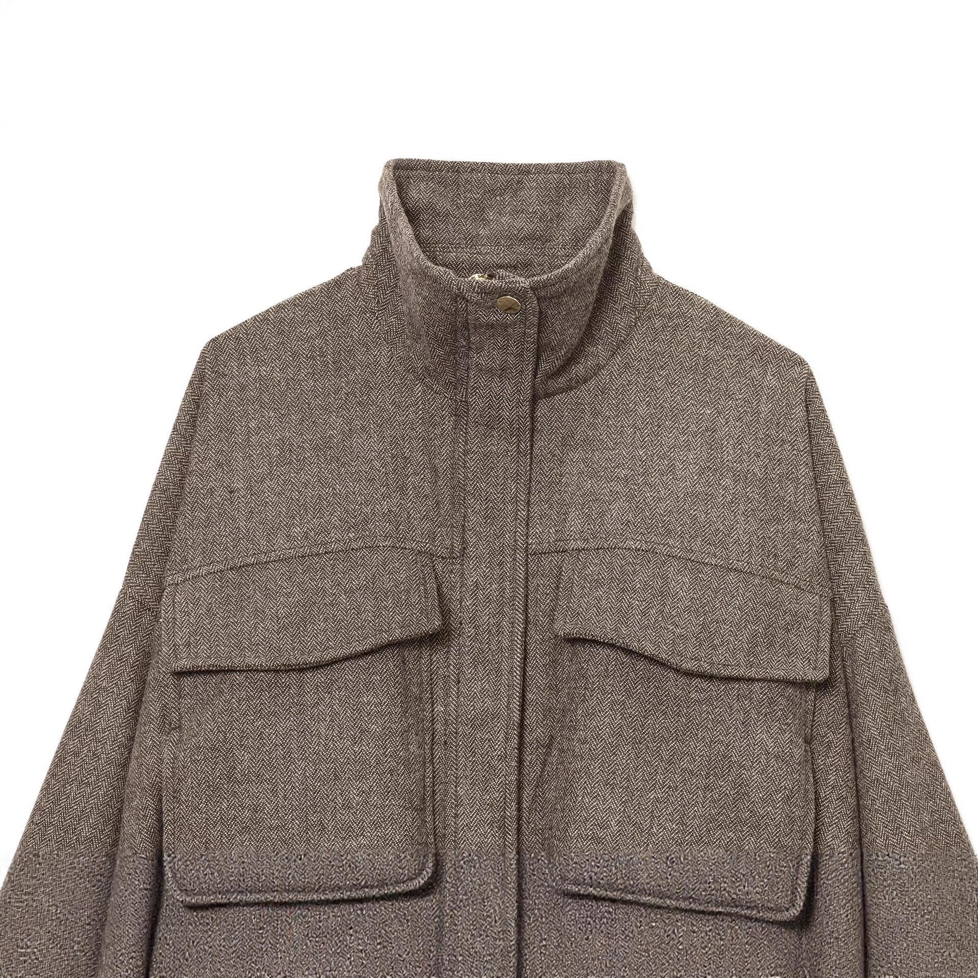• Women's Casual Polyester Herringbone Pattern Jacket Stand Collar Short Outerwear Loose Fit Bomber Baseball Uniform Coat With Big Pockets For Autumn Winter