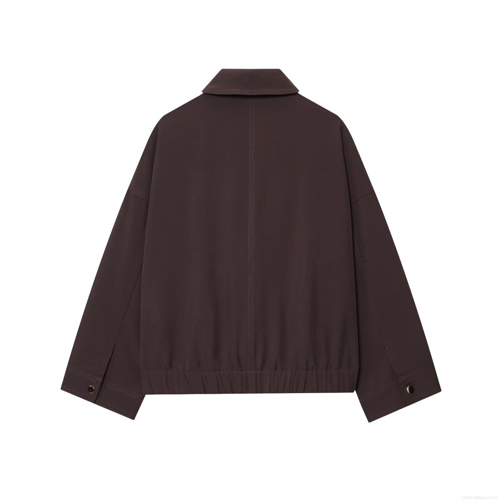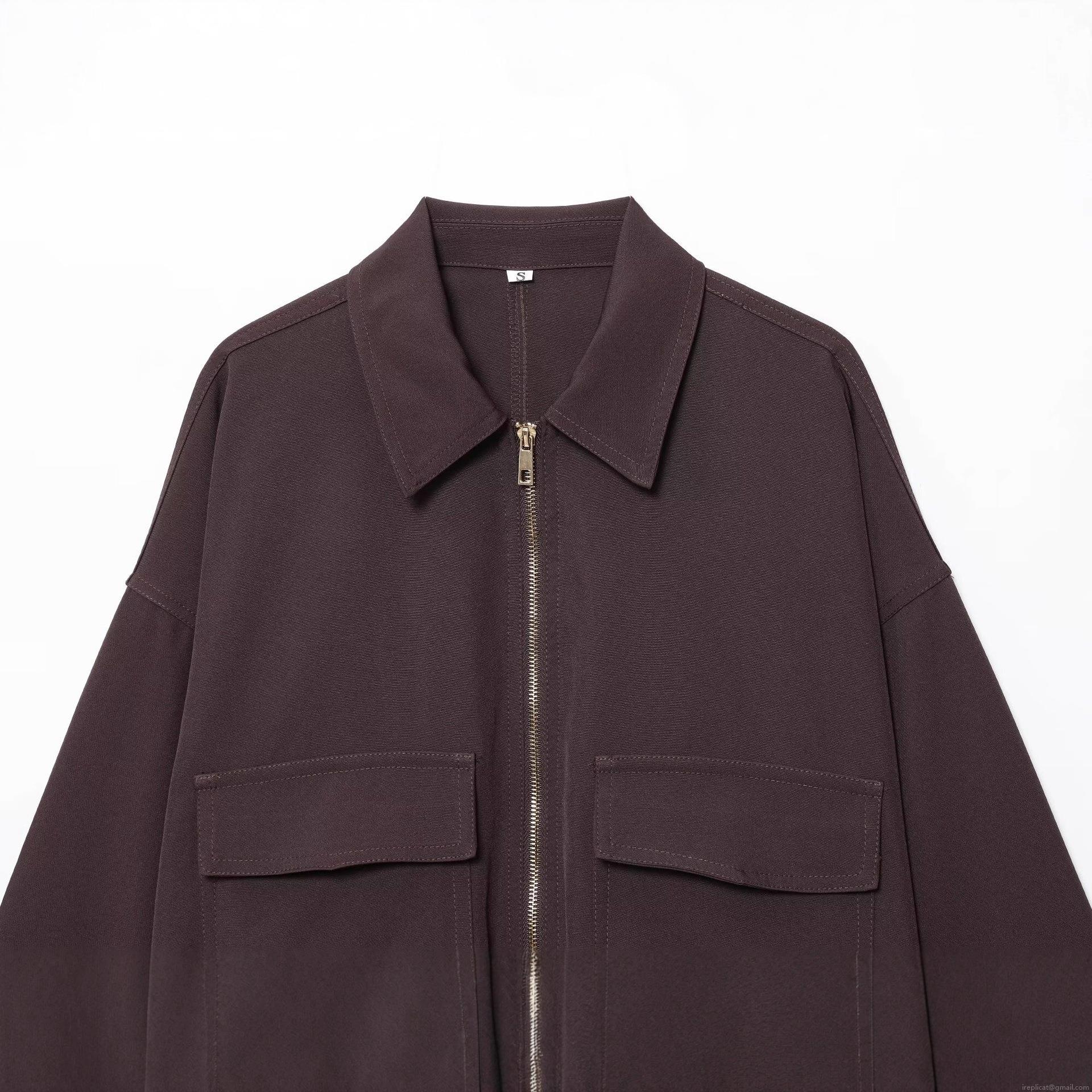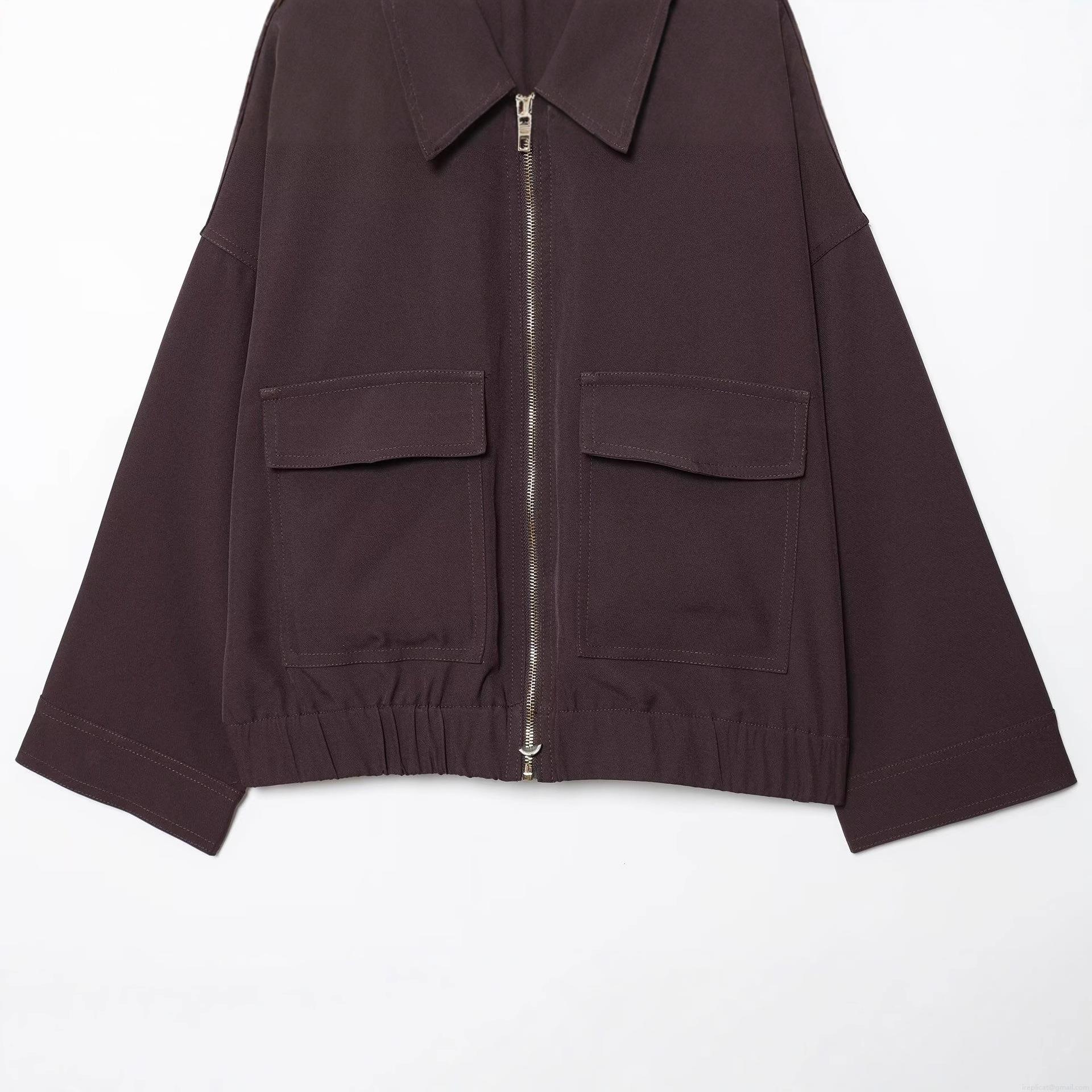 • Women's Casual Polyester Jacket Lapel Collar Metal Zipper Dual Large Flap Pockets Loose Fit Streetwear Espresso Brown Long Sleeve Solid Color Outerwear With Elastic Hem