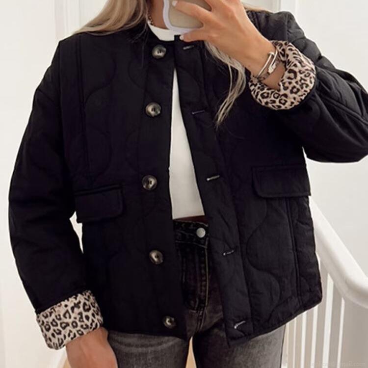 Solid Color, Leopard Print Patchwork, Single-breasted, Quilting, Wavy Stitching, Leopard Print Lining, Ribbed Collar