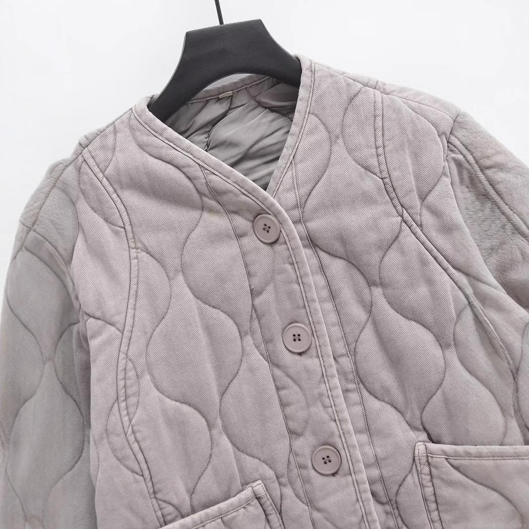 • Women's Casual Quilted Jacket Washed Cotton Polyester Blend Wave Quilted Padded Coat Long Sleeve Button Down Outerwear With Pockets For Winter Autumn Ladies