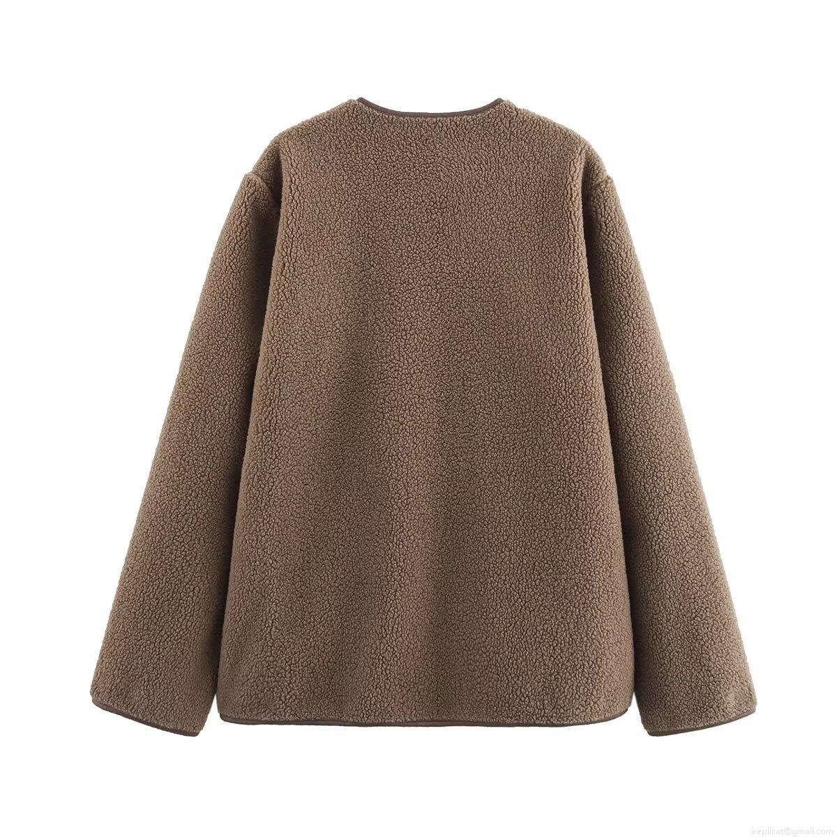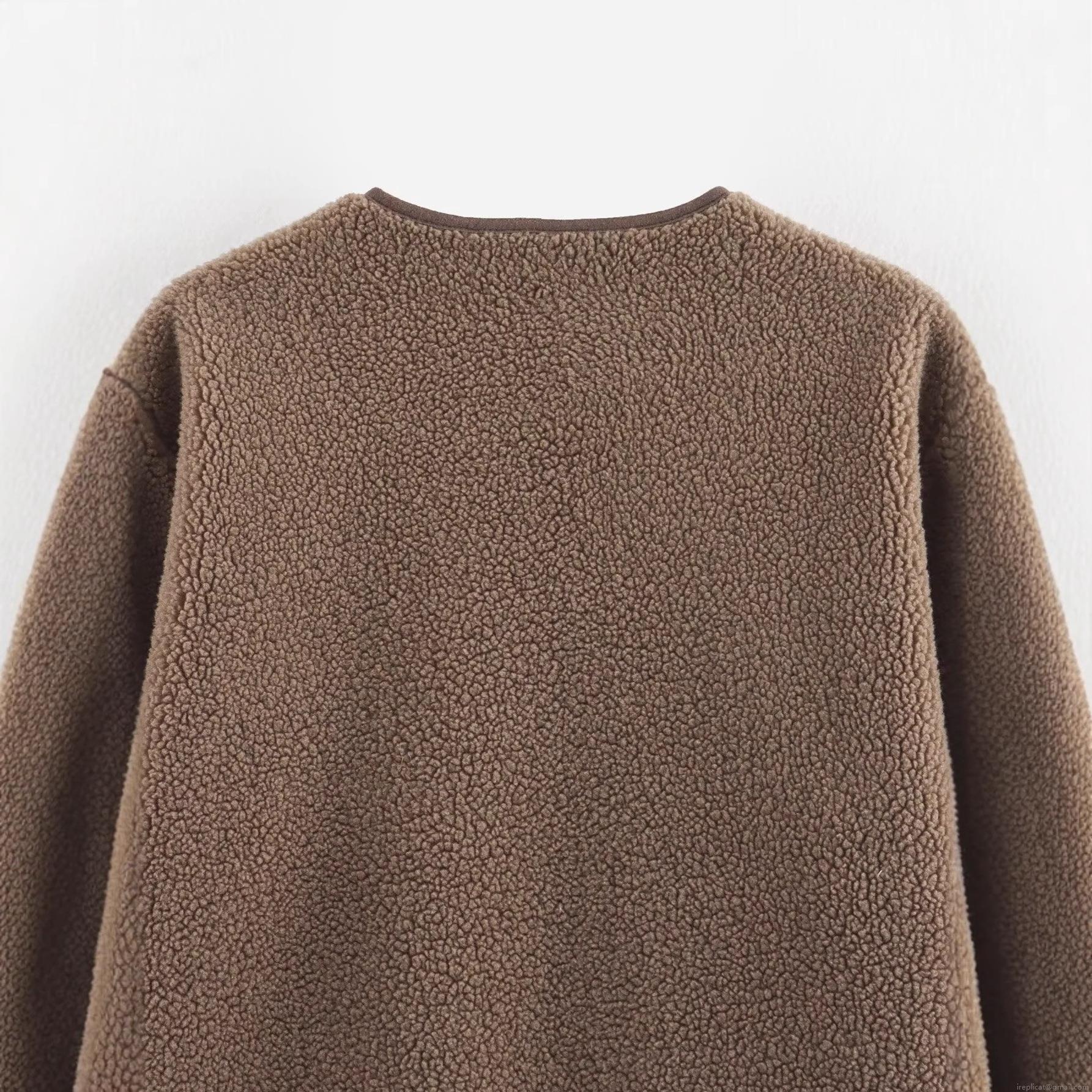 Women's Casual Sherpa Fleece Jacket Loose Turn-down Collar Button Down Short Coat with Pockets Autumn Winter Solid Color Warm Outwear for Ladies