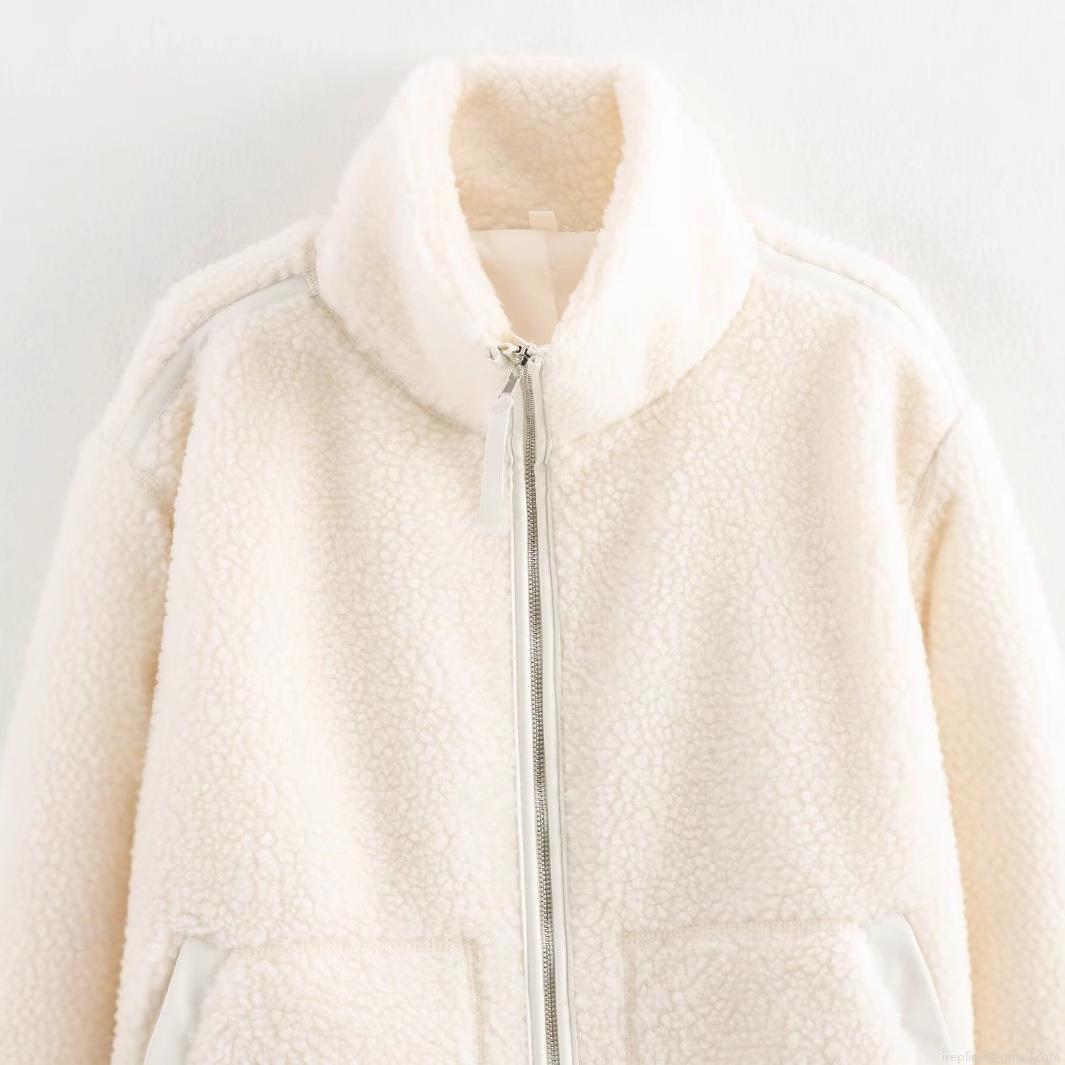 • Women's Casual Sherpa Fleece Jacket Warm Solid Color Full Zipper Mock Neck Outerwear With Pockets 100% Polyester Cream White Winter Autumn Coat