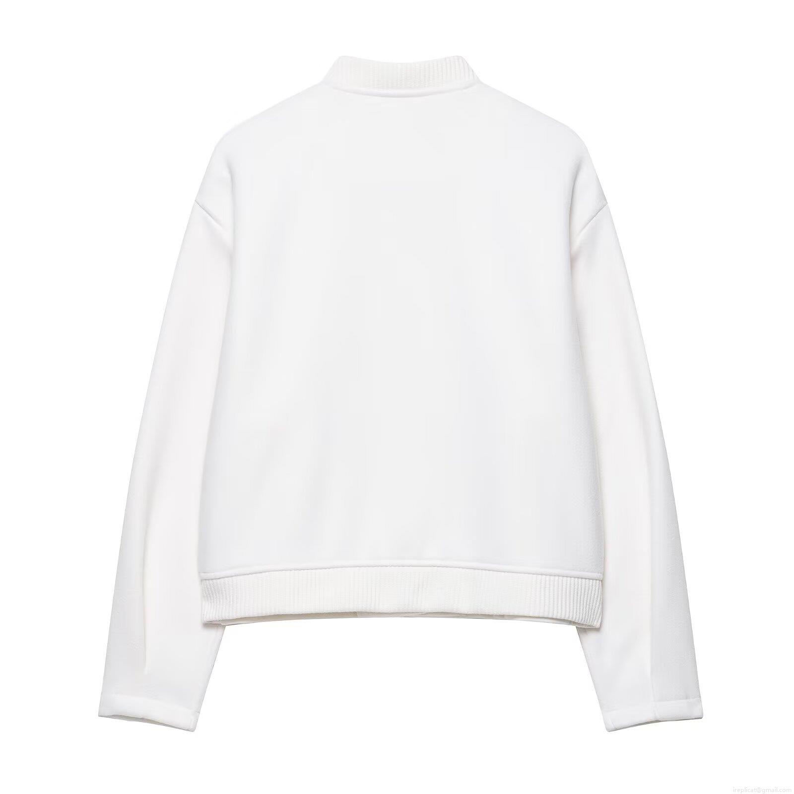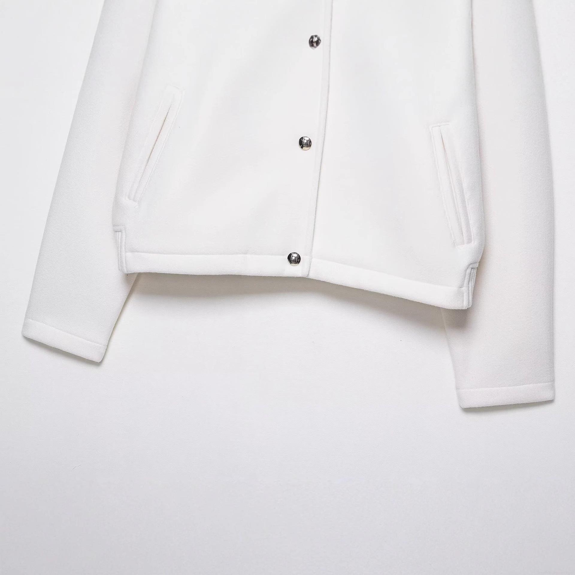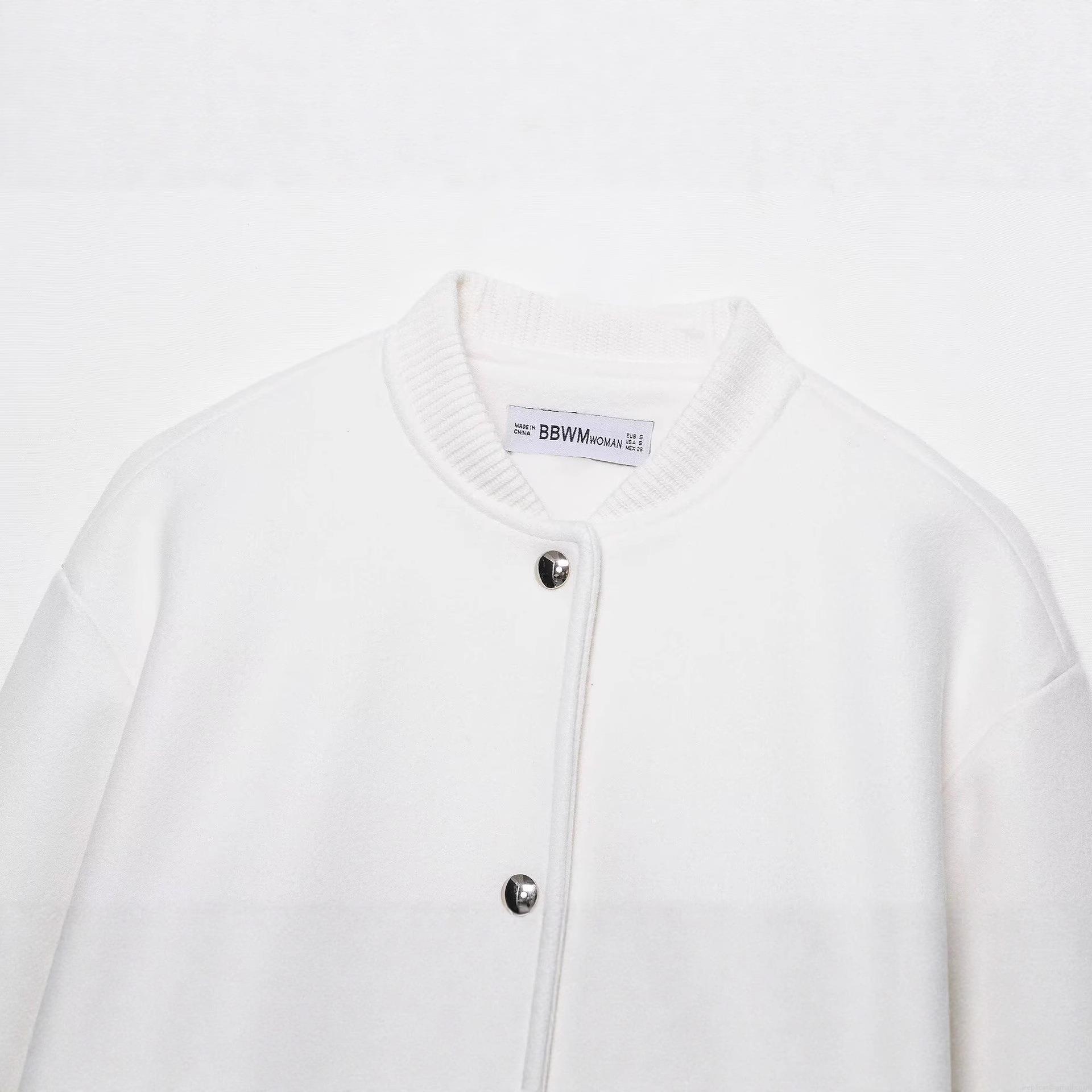 • Women's Casual Short Bomber Jacket 100% Polyester Solid White Flight Jacket With Metallic Buttons Ribbed Trim Baseball Collar Streetwear Outerwear For Women