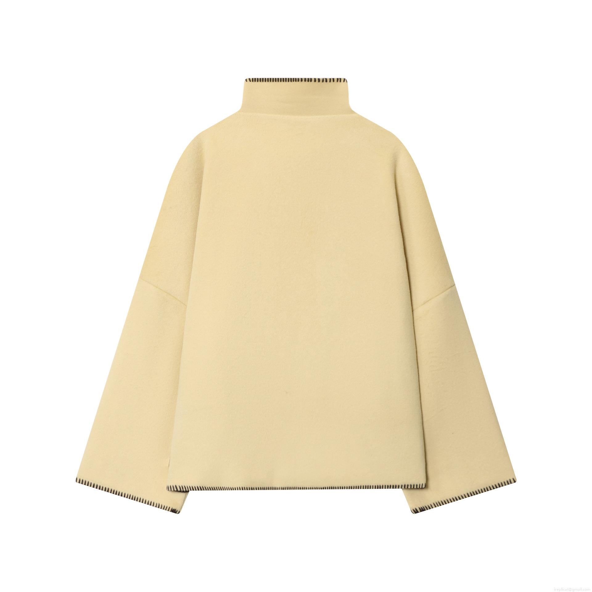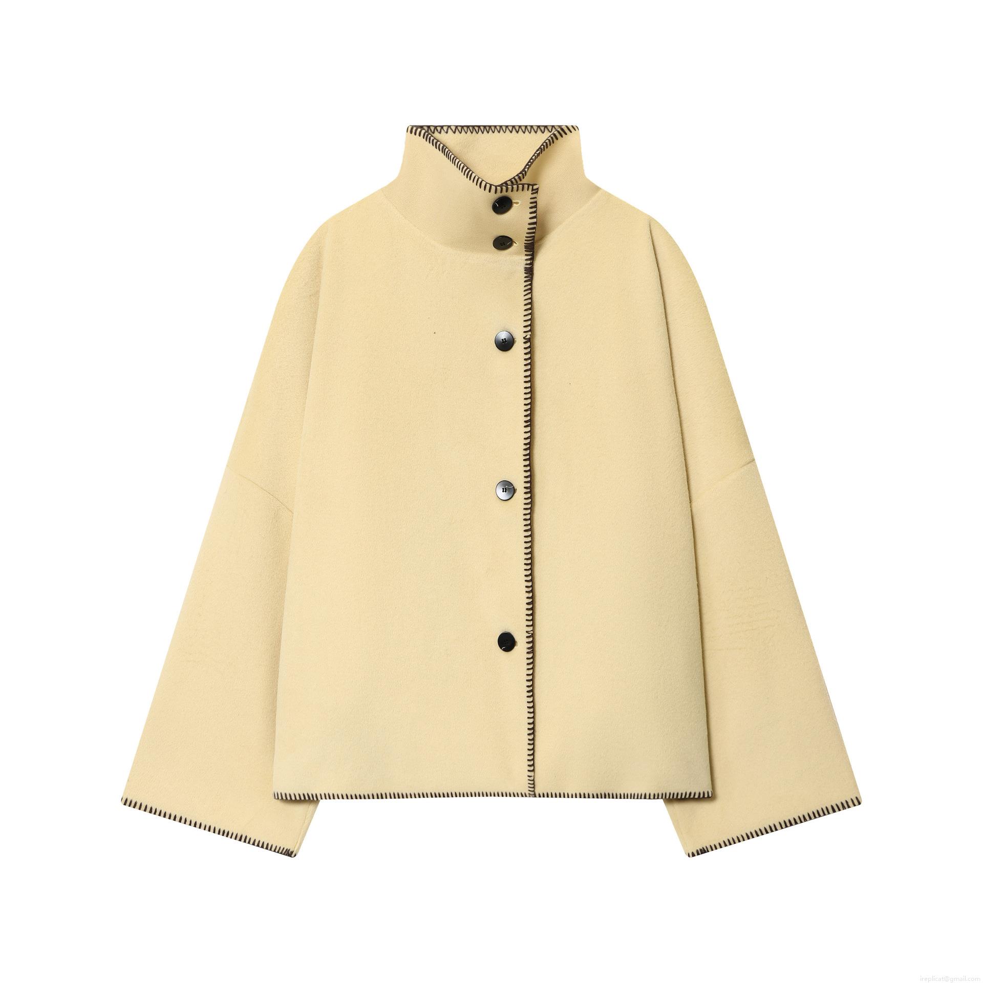 Women's Casual Short Coat Contrast Stitching Wool-like Polyester Jacket Stand Collar Single Breasted Loose Outerwear For Daily Wear