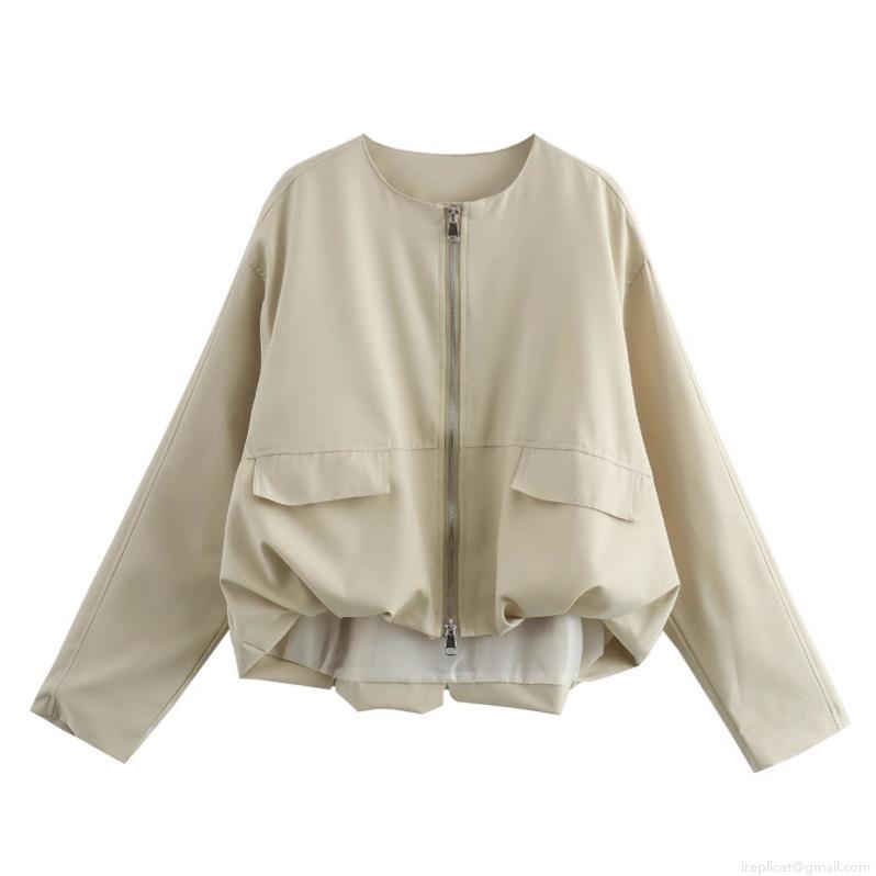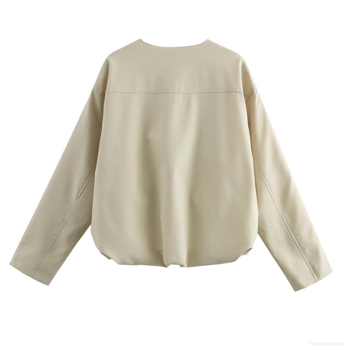 • Women's Casual Solid Color Polyester Zip Up Jacket Round Neck Loose Fit Long Sleeve Coat With Pockets For Spring Autumn Streetwear
