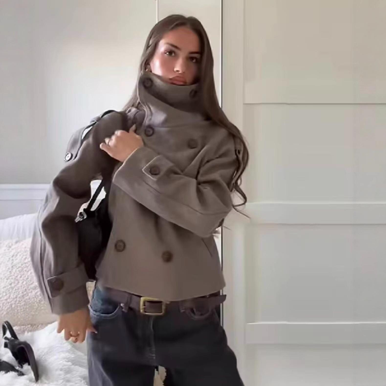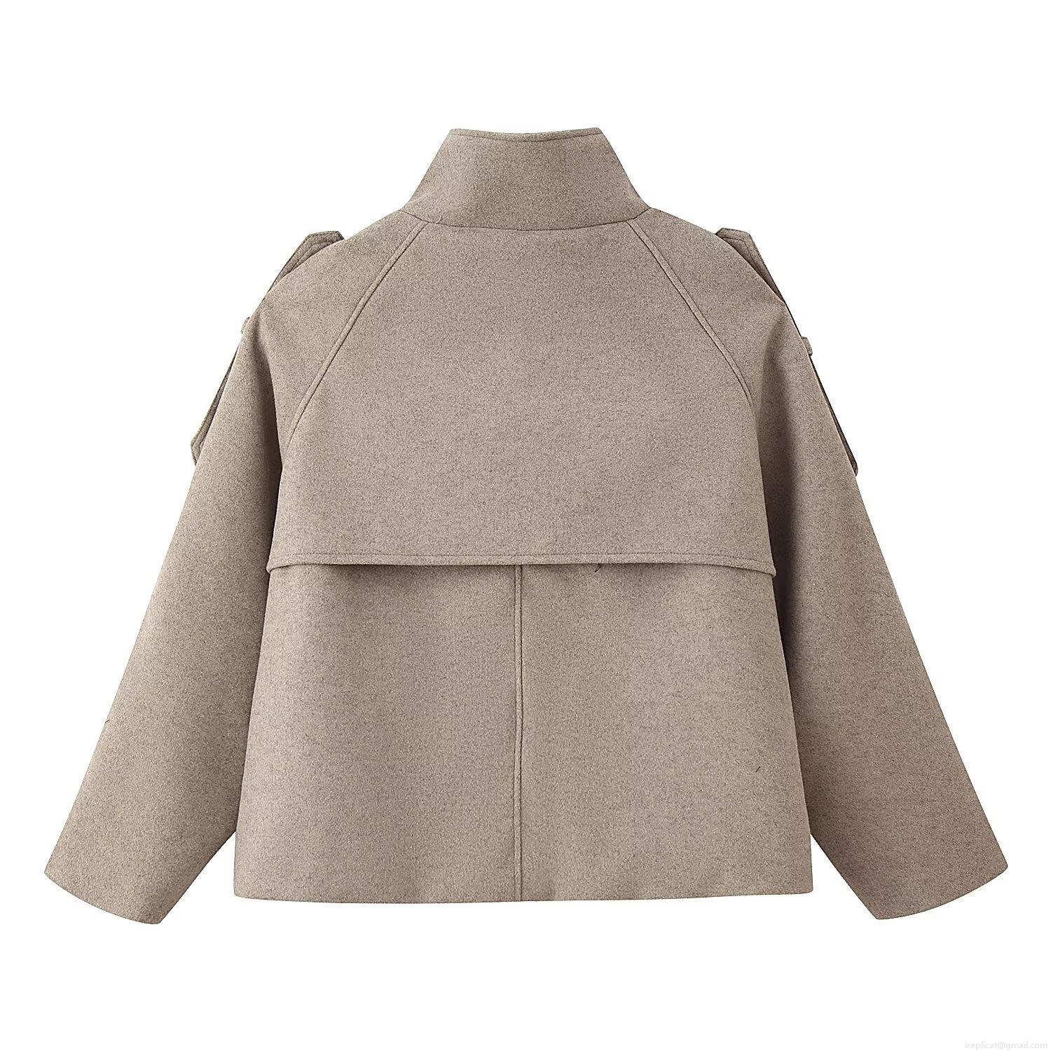 • Women's Casual Stand Collar Double Breasted Short Woolen Jacket With Shoulder Tabs Loose Fit Polyester Outerwear Coat For Autumn Winter