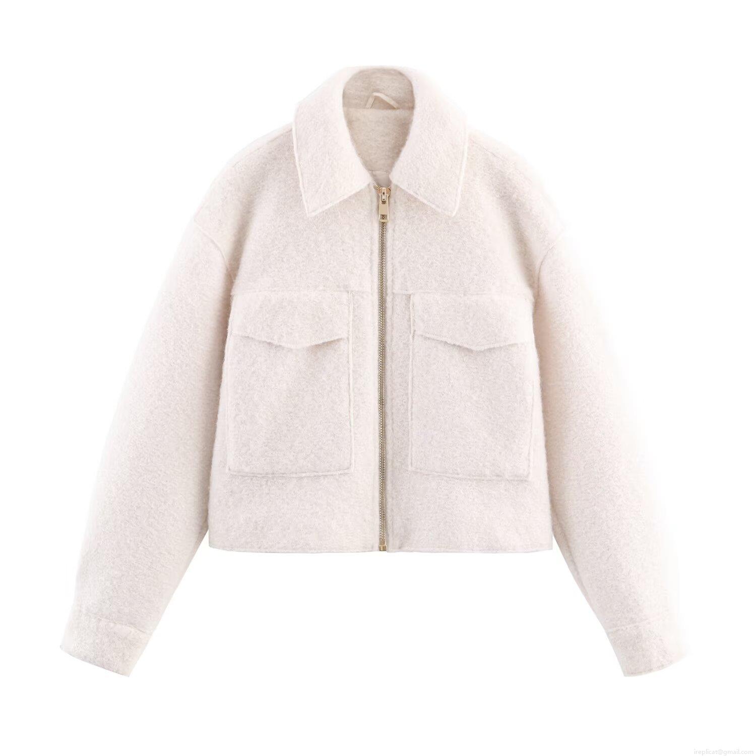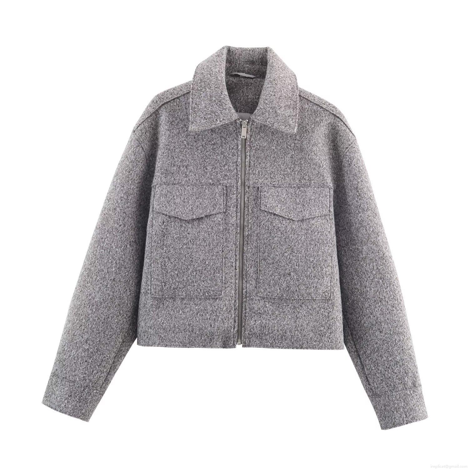 • Women's Casual Woolen Crop Jacket With Front Zipper And Double Pockets Streetwear Lapel Long Sleeve Solid Color Outerwear Coat For Women