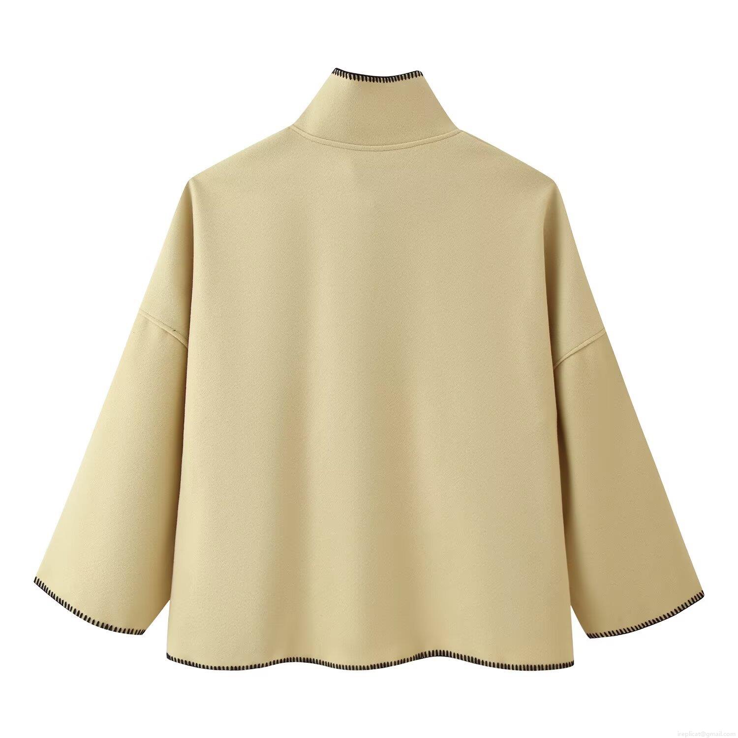 • Women's Casual Woolen Jacket Stand Collar Single Breasted Coat Contrast Stitching Loose Batwing Sleeve Outerwear For Autumn Winter Fashion