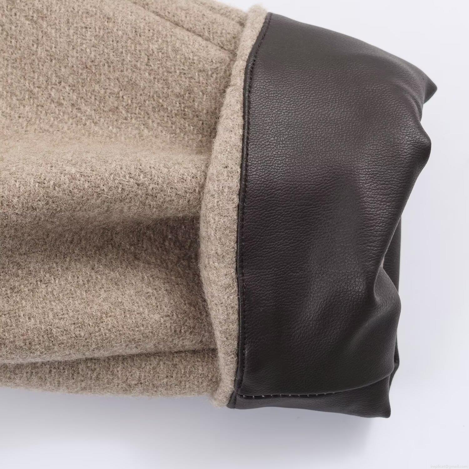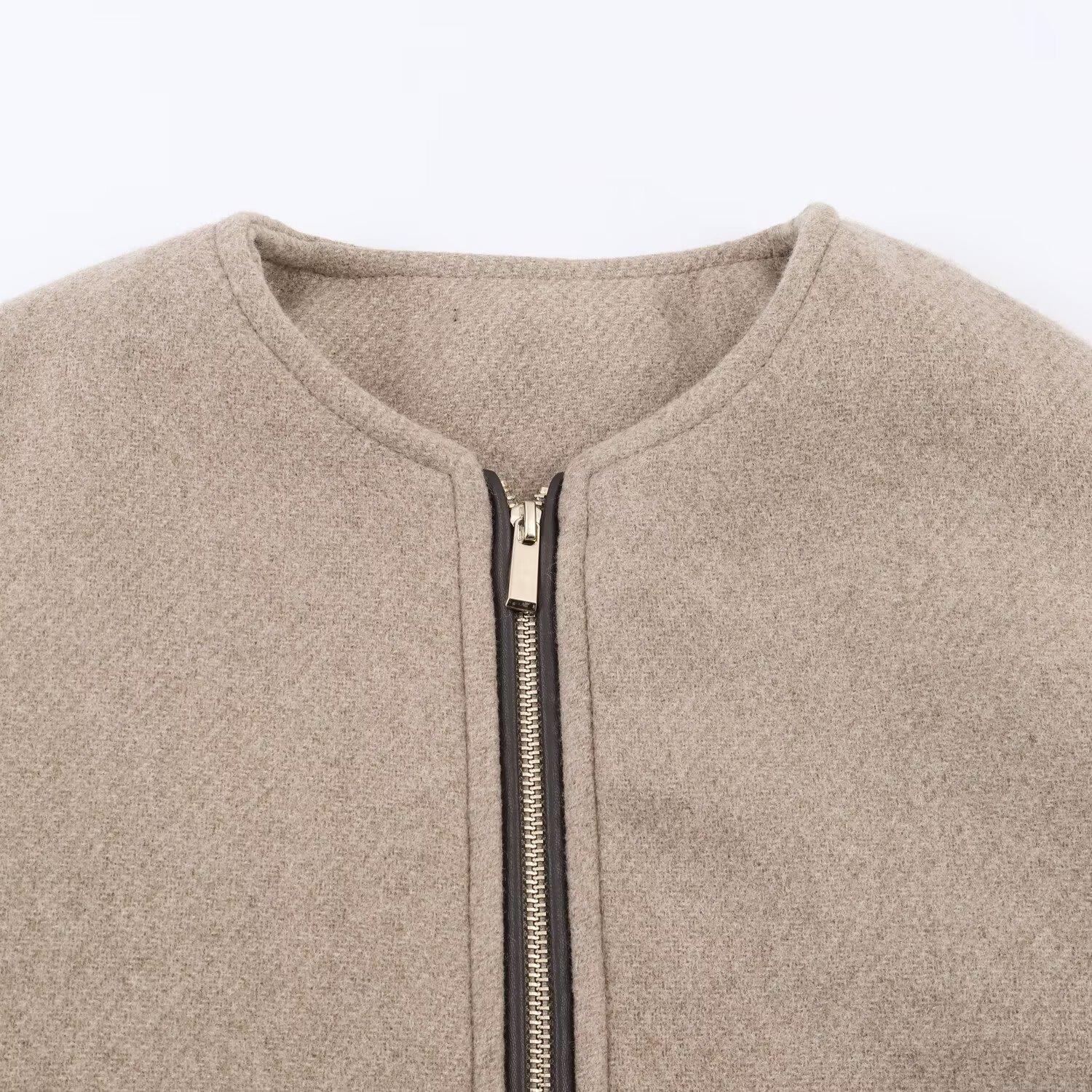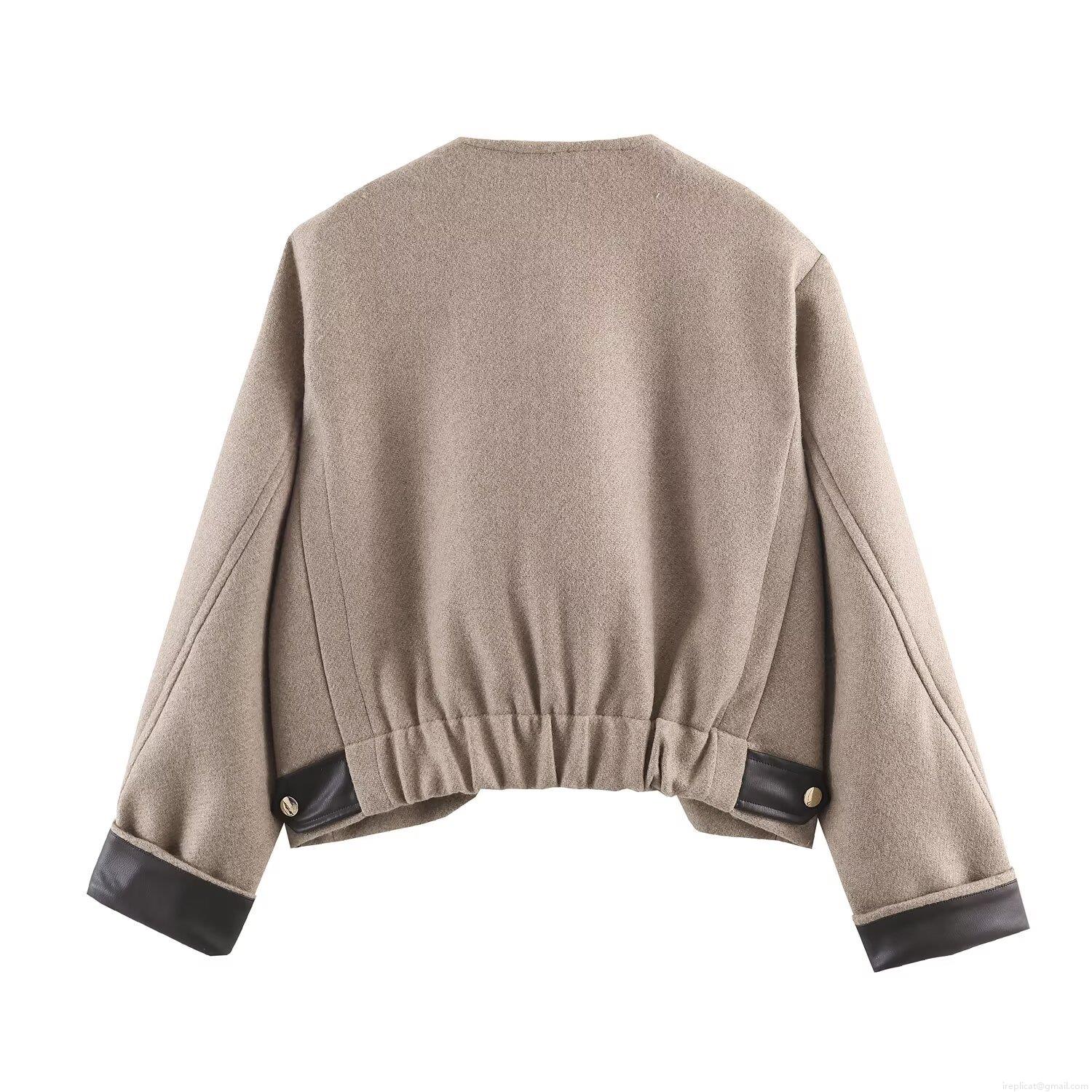 • Women's Casual Woolen Jacket With Leather Patch Sleeves Round Neck Metal Zipper Short Coat For Winter Outerwear Fashion Solid Color Camel Ladies Streetwear Outercoat