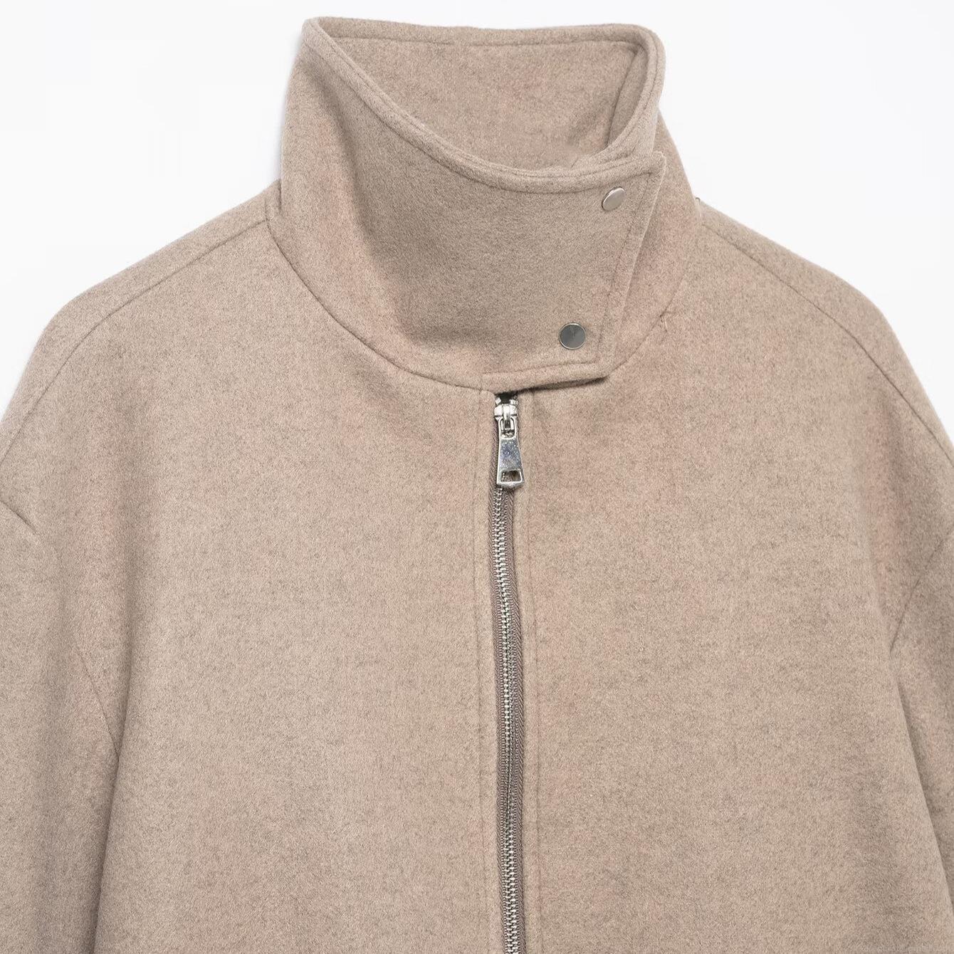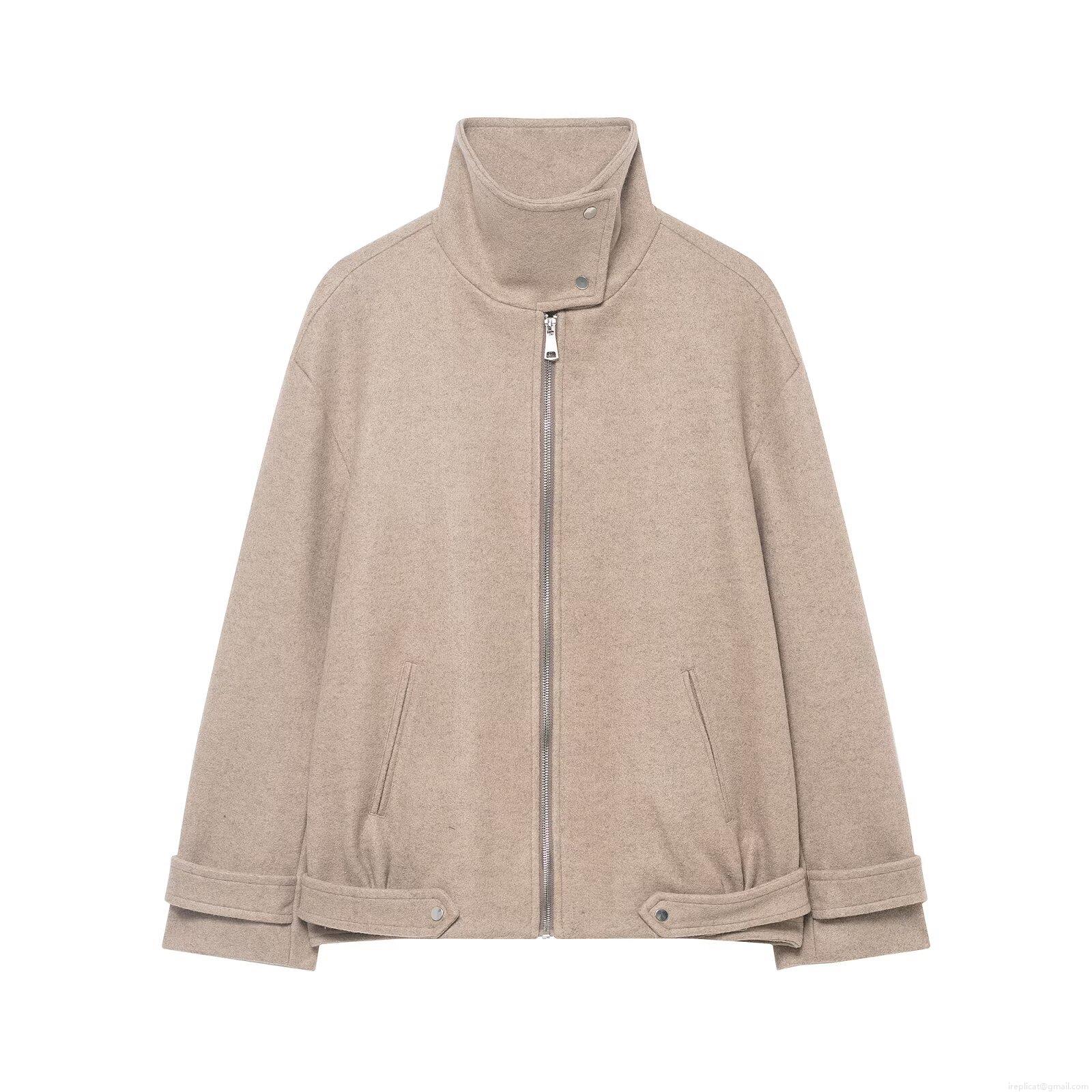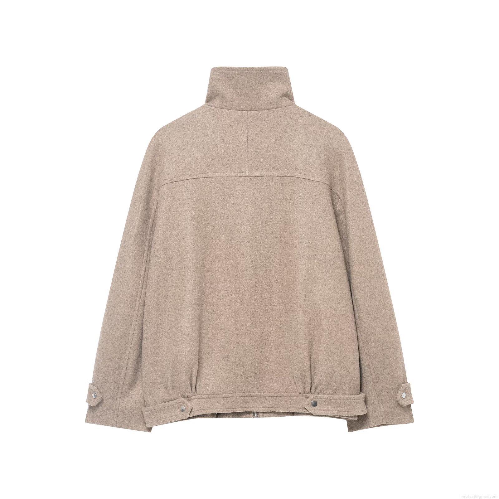 • Women's Casual Woolen Like Polyester Bomber Jacket High Stand Collar Full Zip Up Windproof Loose Fit Solid Color Warm Outerwear For Women Ladies Daily Work Office