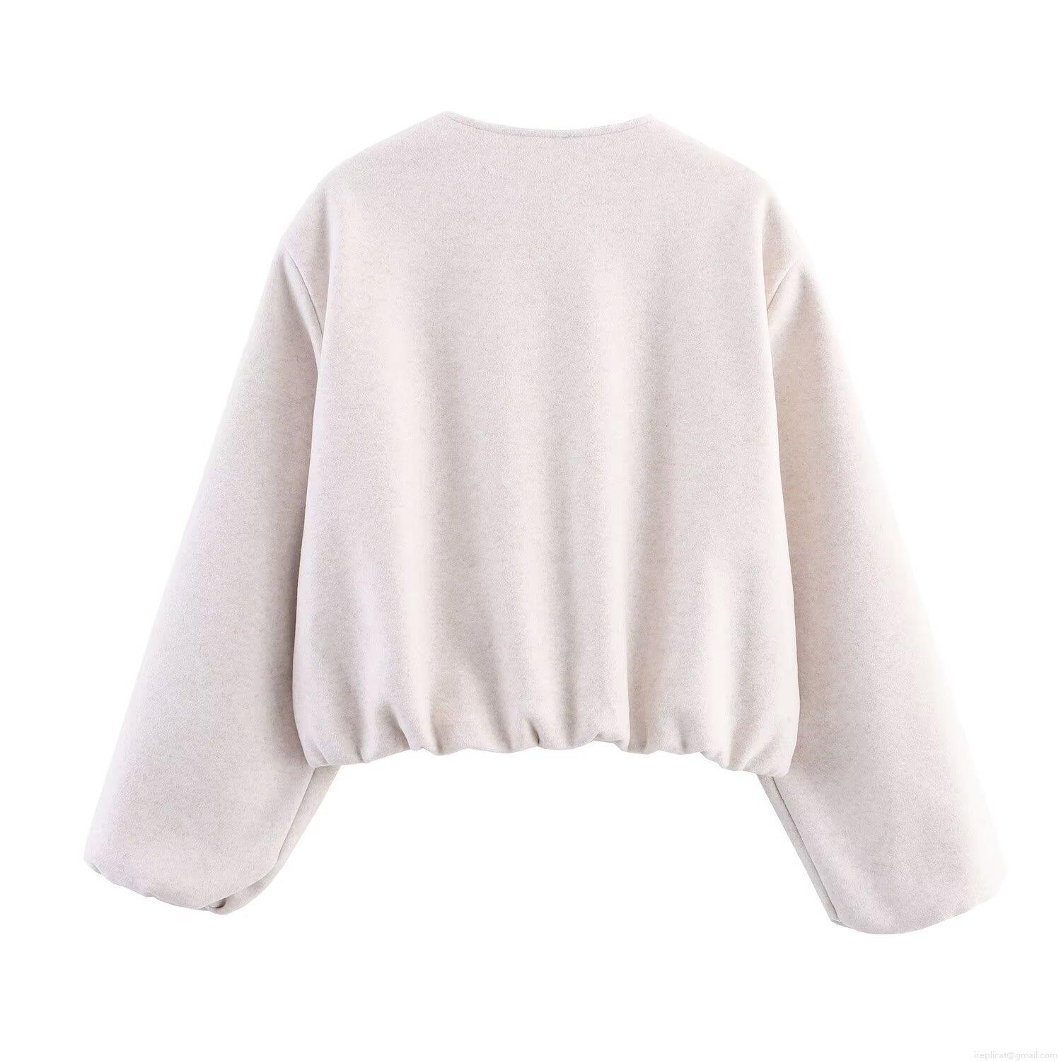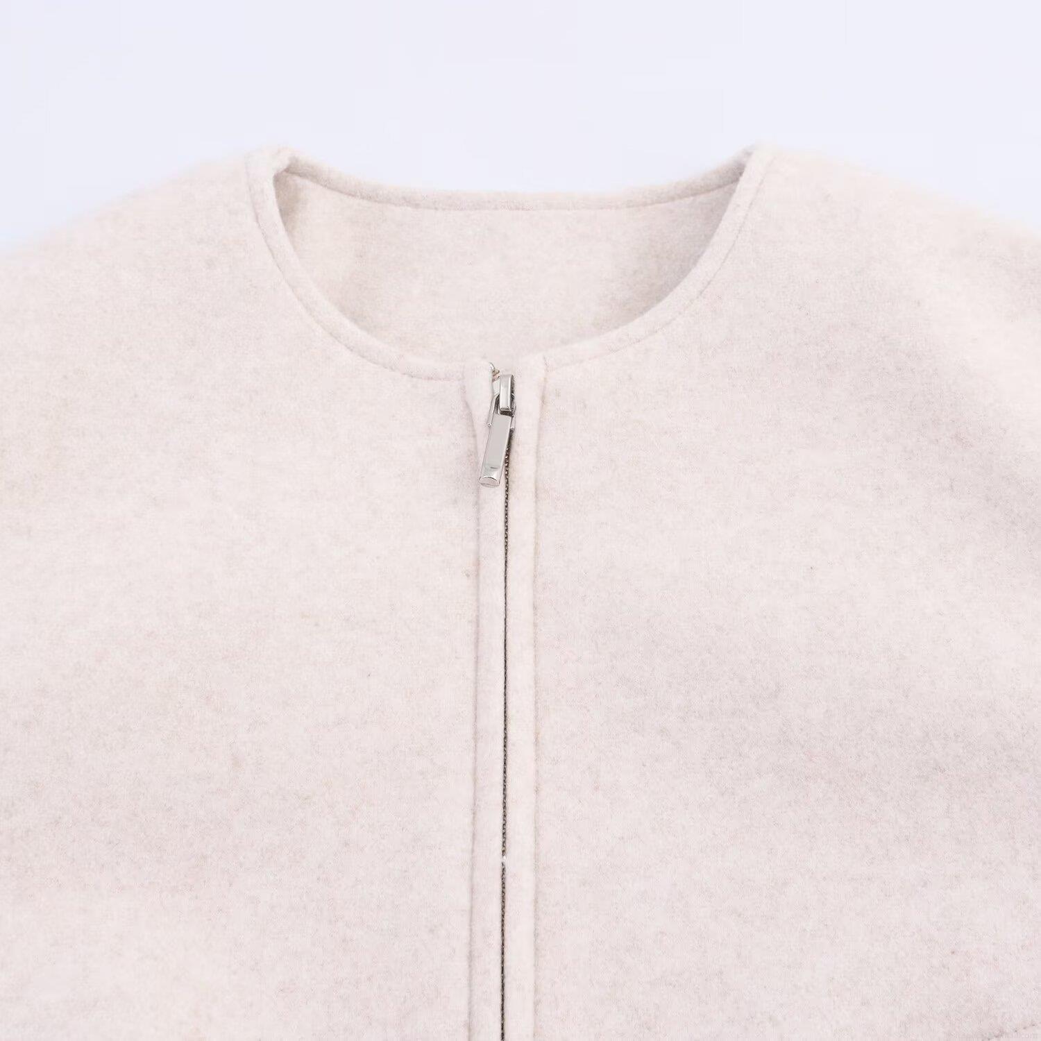 • Women's Casual Woolen Soft Bomber Jacket Loose Fit Round Neck Zip Up Outerwear Solid Color Long Sleeve Ribbed Trim Short Coat for Fall Winter