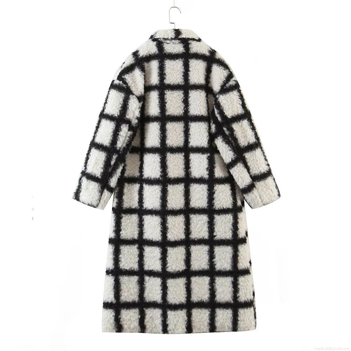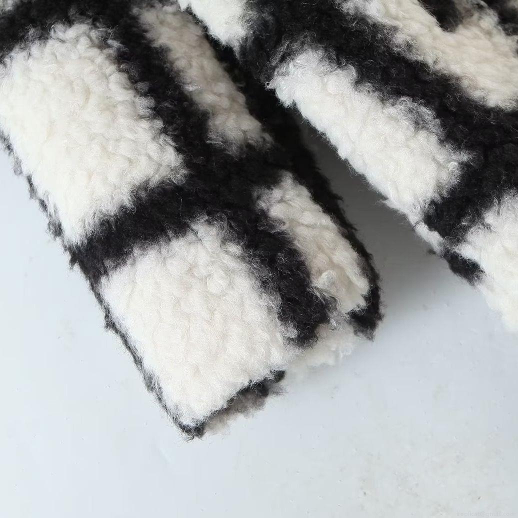• Women's Checkered Plush Long Coat Fashion Black White Plaid Faux Lambswool Overcoat Loose Lapel Thick Warm Streetwear Outerwear For Women