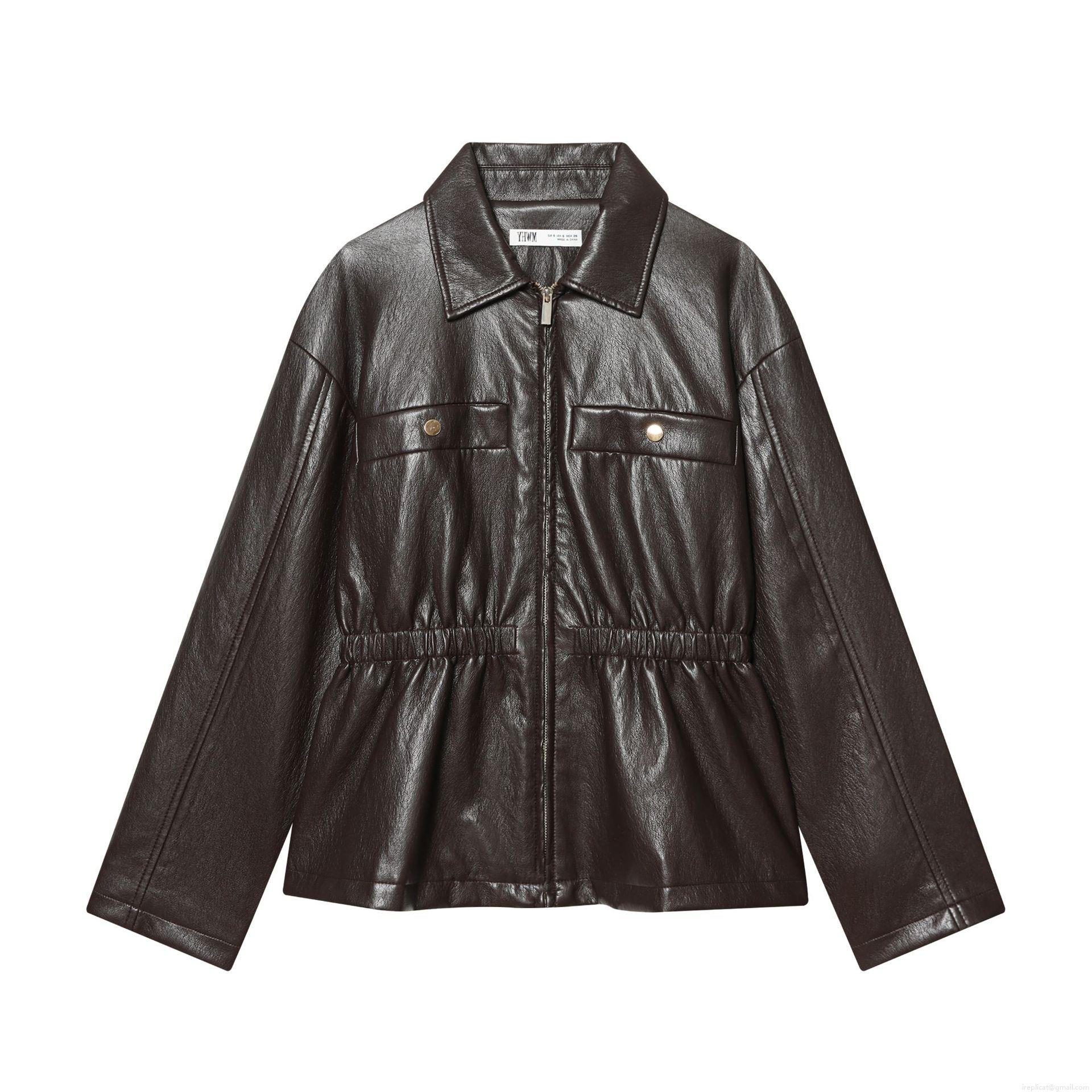 Women's Chic Faux PU Leather Jacket Turn-Down Collar Slim Fit Biker Coat With Waist Folds Zipper Short Outerwear For Women Elegant Casual Streetwear Top