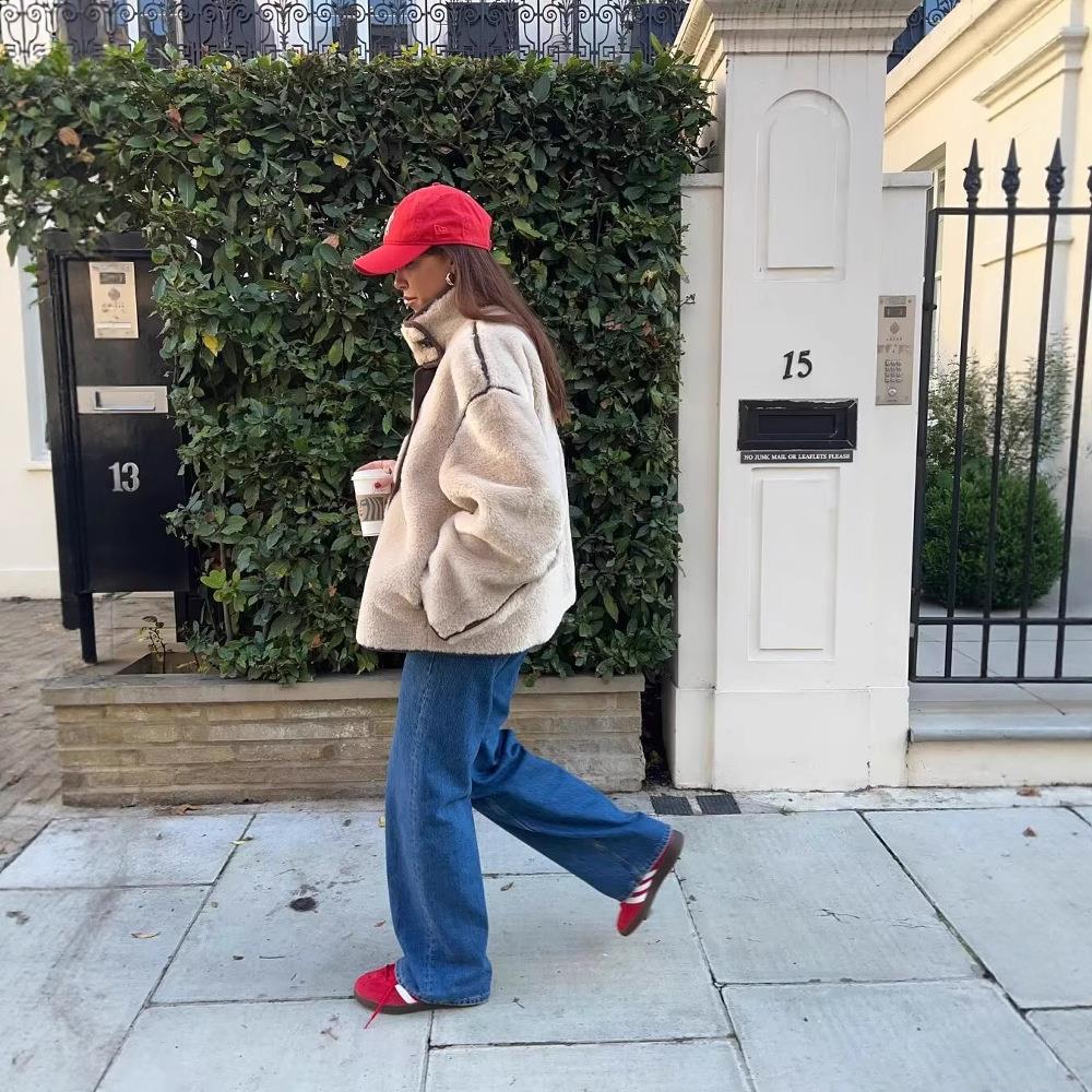 • Women's Chic Faux Shearling Jacket Standing Collar Faux Leather Trim 100% Polyester Faux Fur Coat Loose Fit Casual Warm Short Outerwear Streetwear For Fall Winter