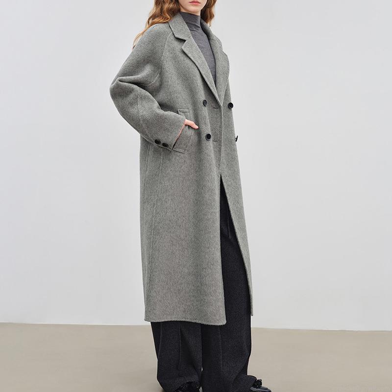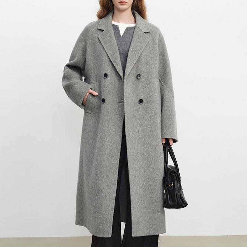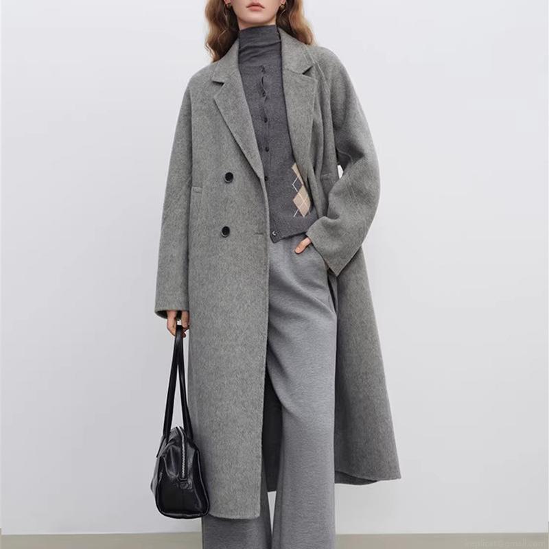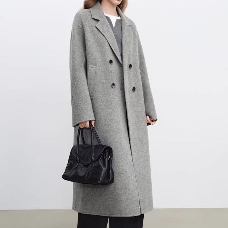 • Women's Classic Double Breasted Long Woolen Overcoat Elegant Light Grey Lapel Collar Autumn Winter Outerwear Jacket Coat For Office Lady