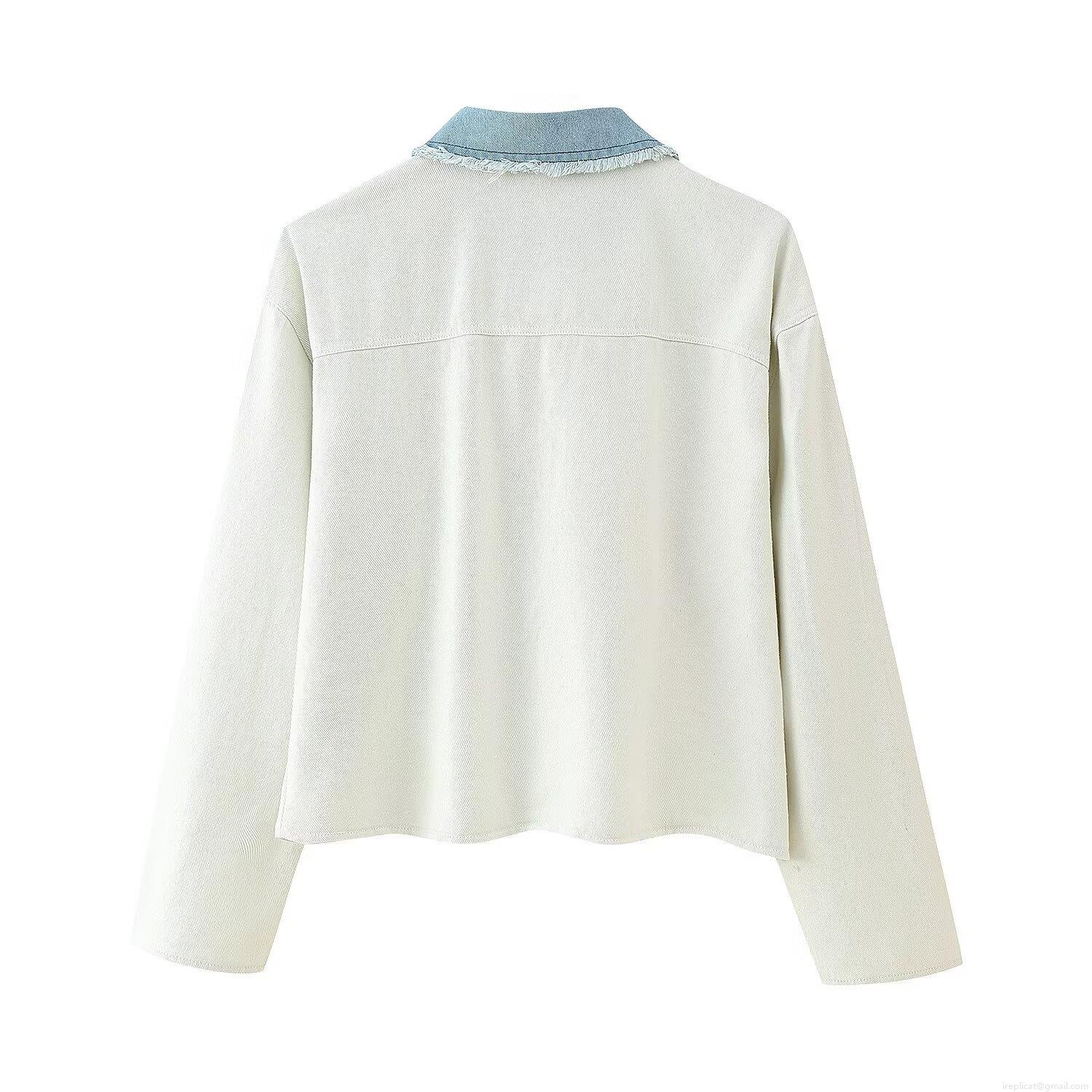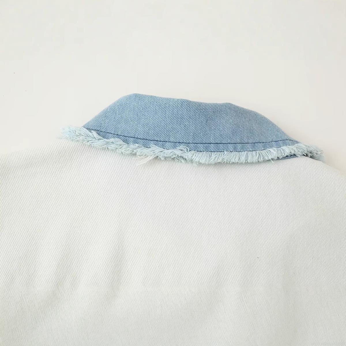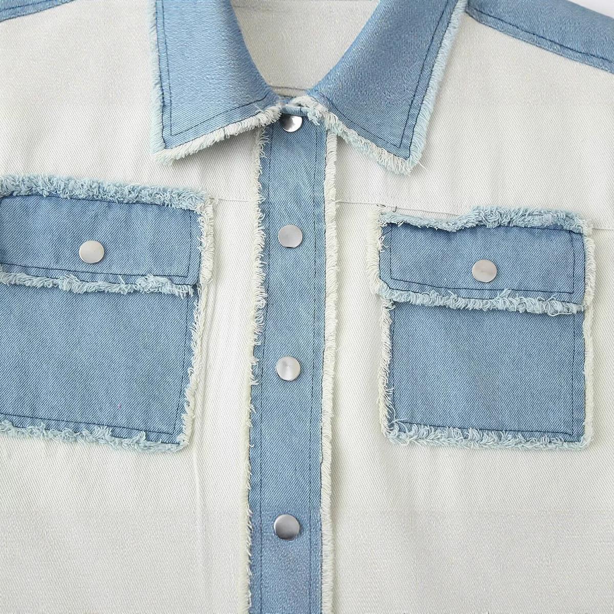 Women's Color Block Denim Jacket Short Knit Stitching Frayed Hem Turn-down Collar Button Down Coat Casual Streetwear Outerwear