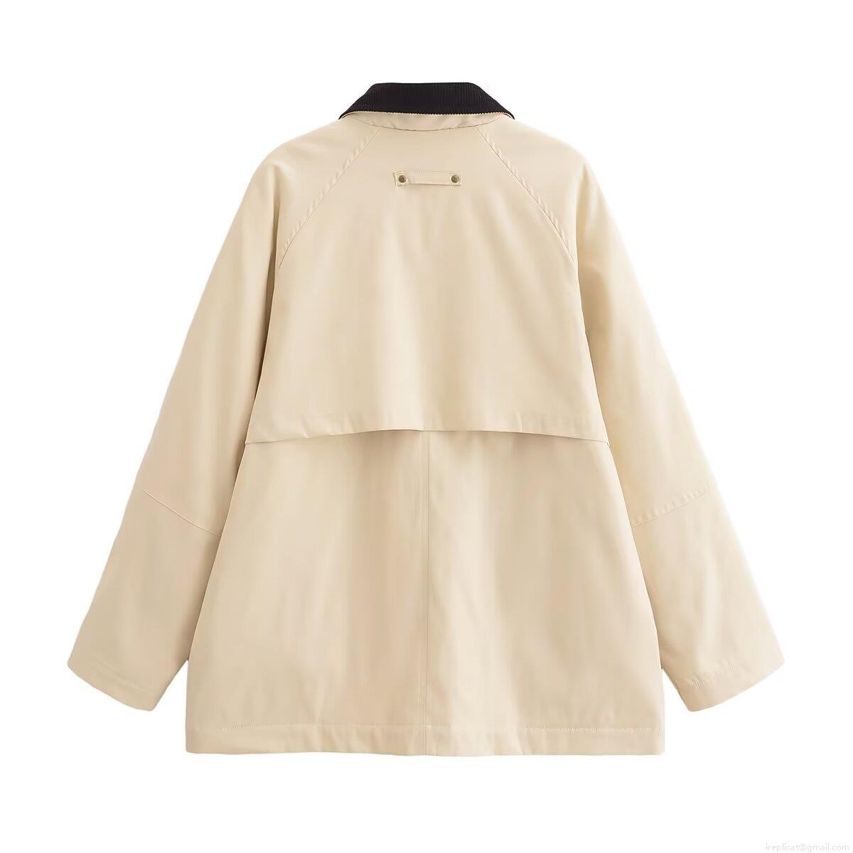Women's Corduroy Collar Padded Jacket Contrast Stitching Mid-length Long Sleeve Warm Outerwear Streetwear Casual Cargo Pocket Coat Beige