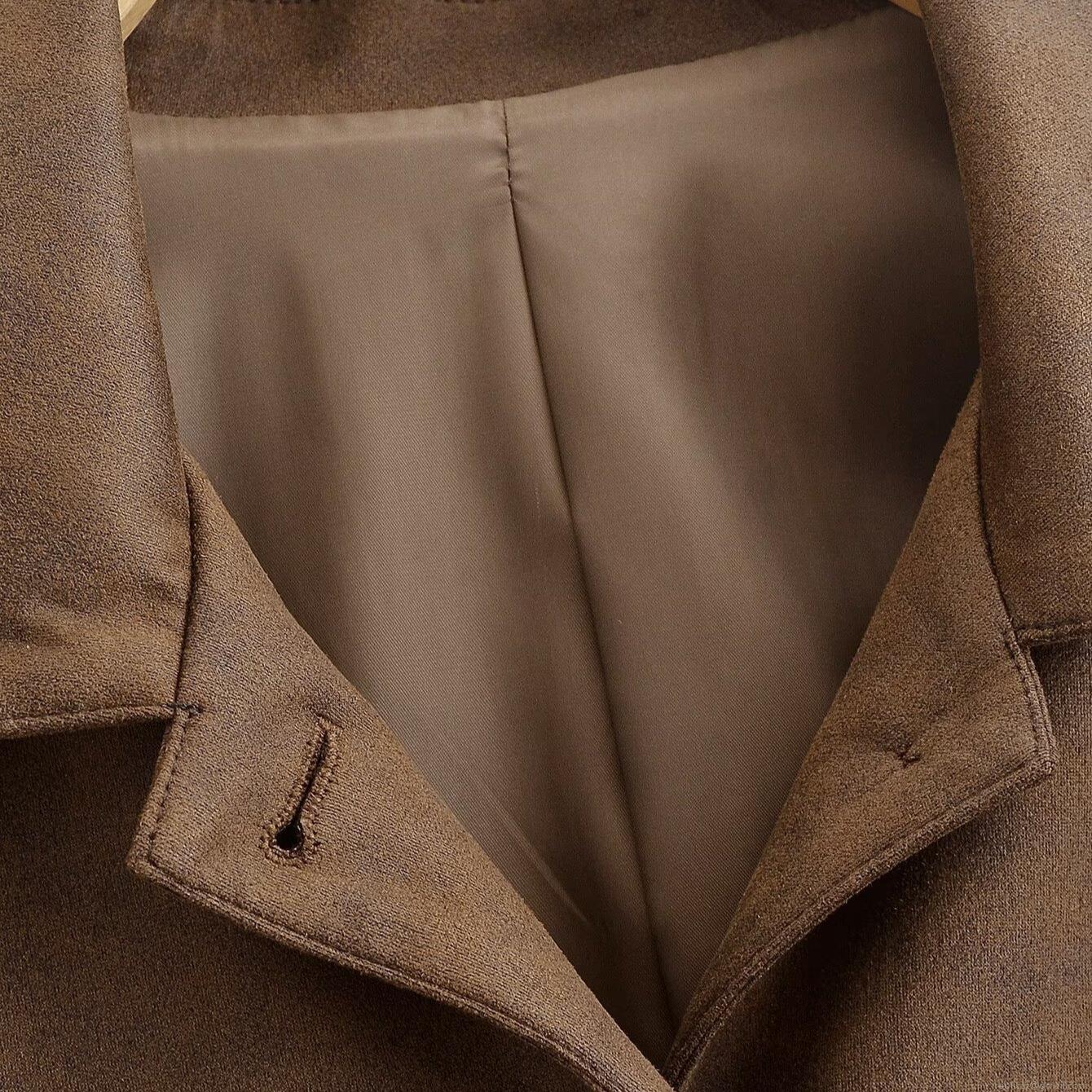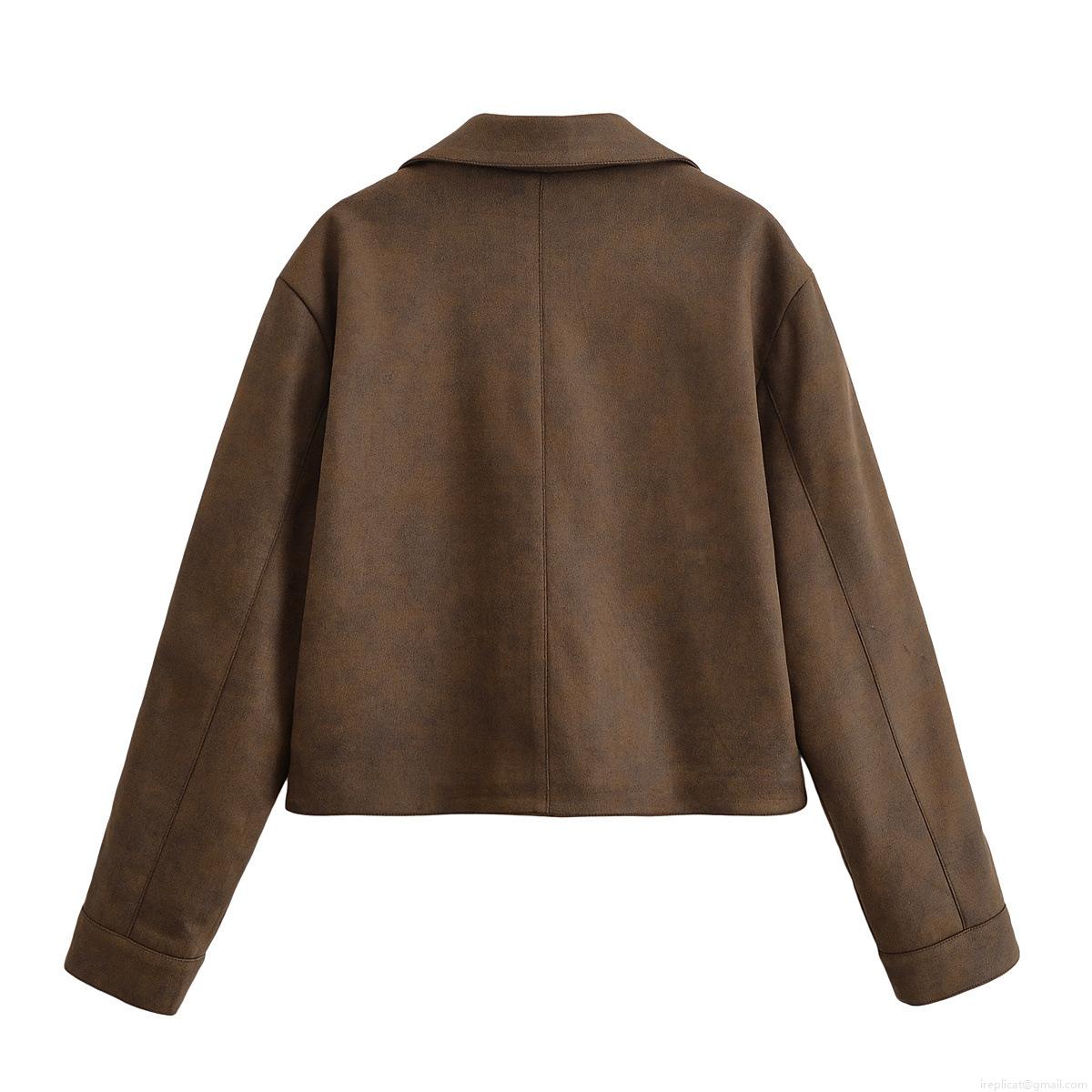 • Women's Cropped Faux Suede Jacket Retro Moto Style Button Down Lapel Long Sleeve Short Coat For Autumn Winter Streetwear Brown Outwear