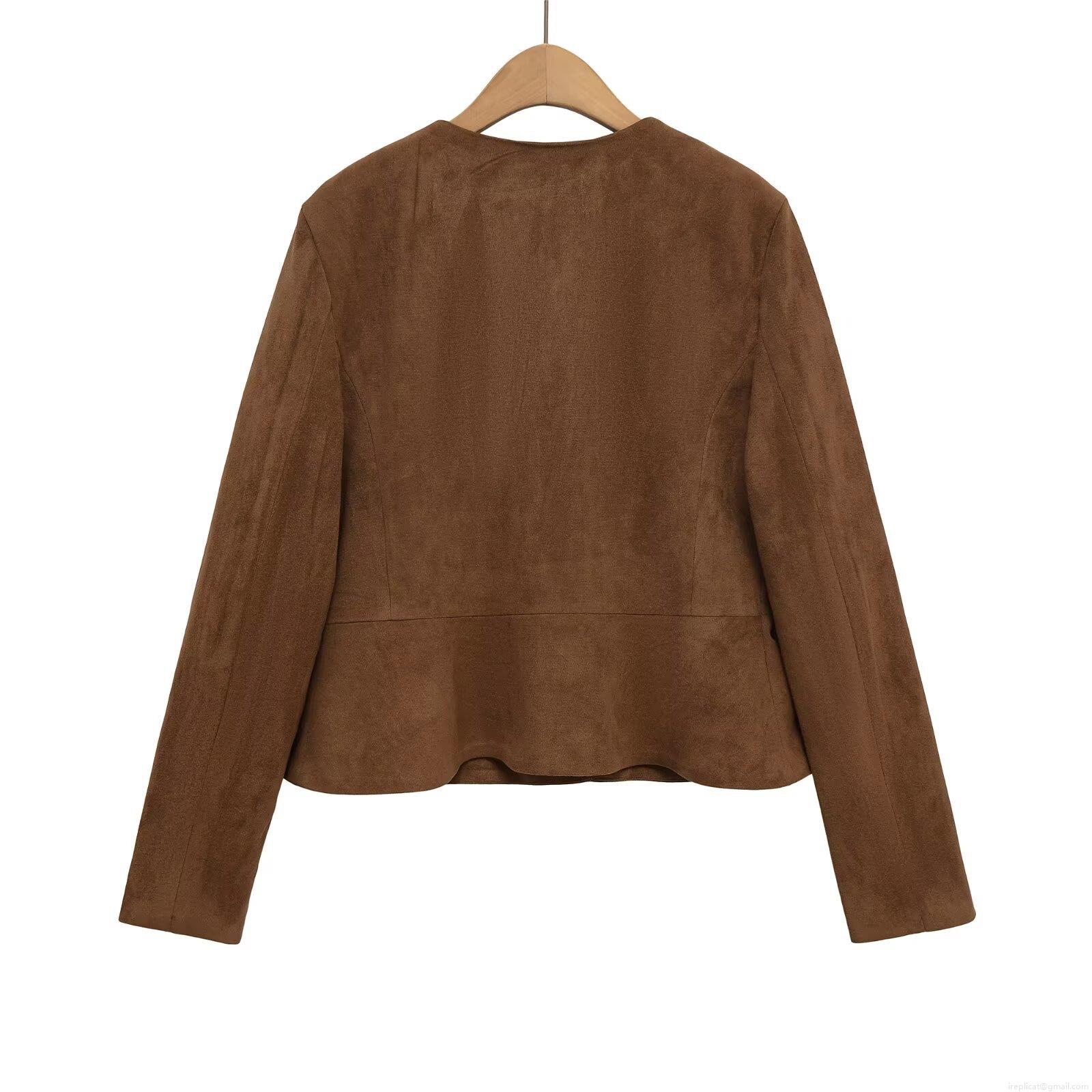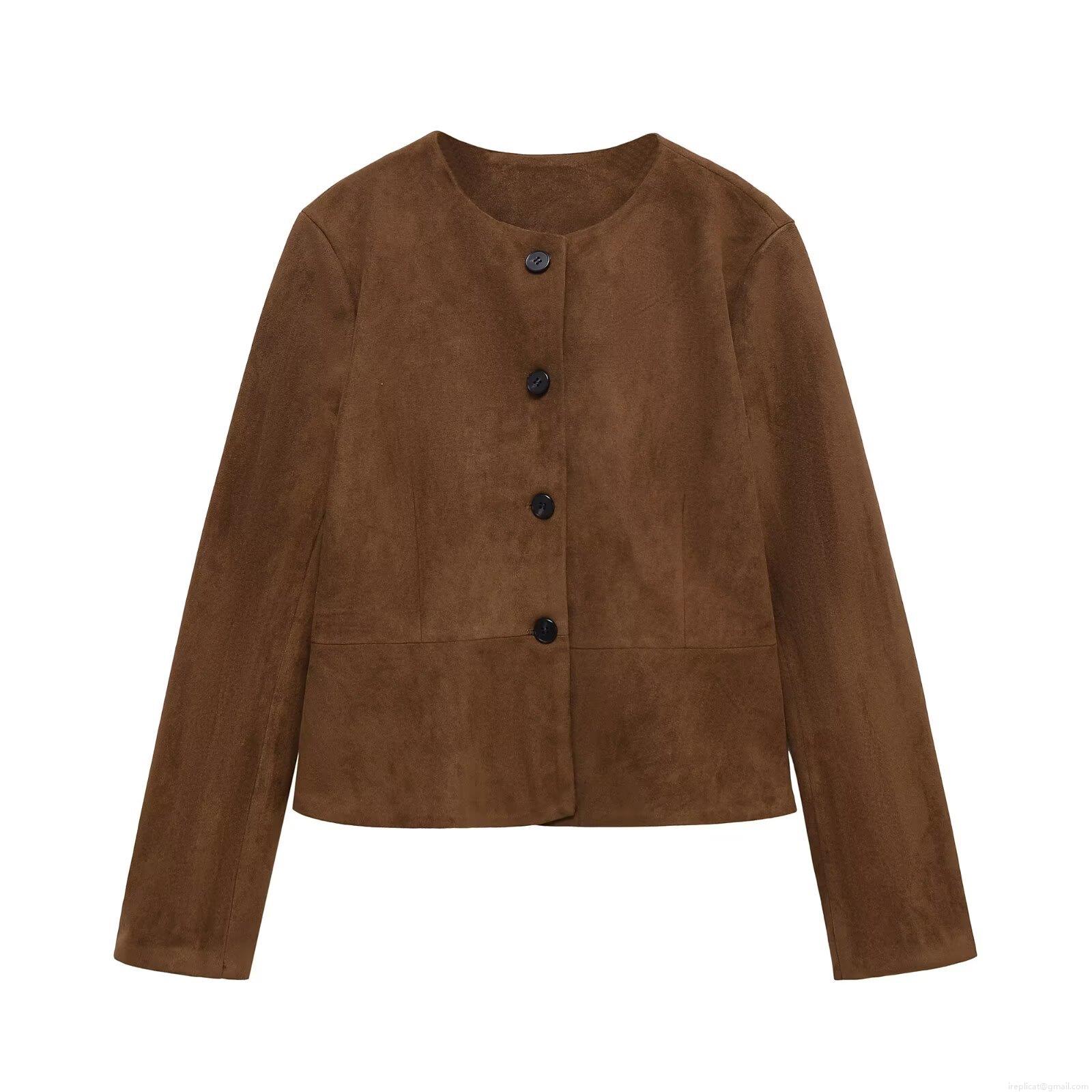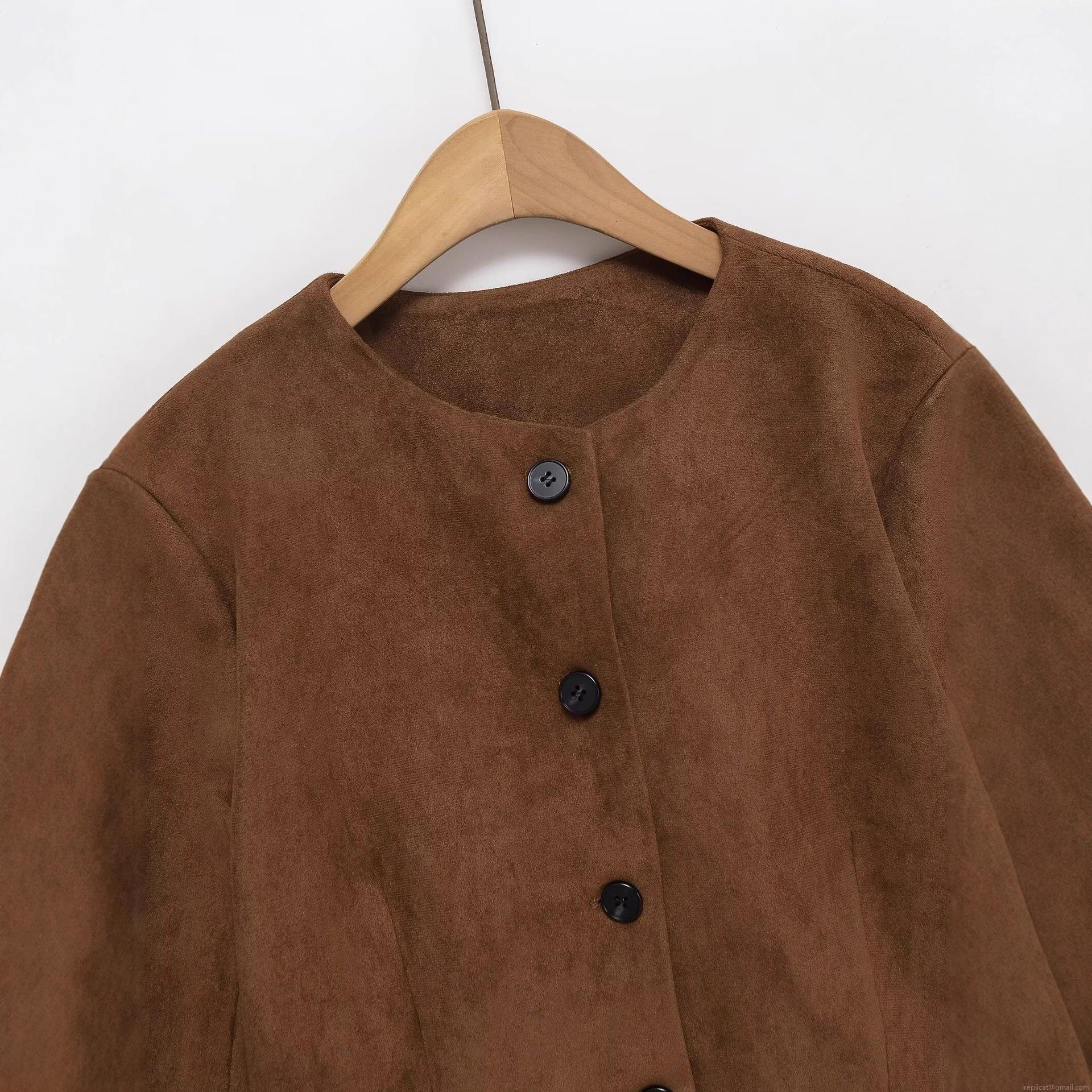 • Women's Dark Brown Suede Jacket Fashion Round Neck Single Breasted Long Sleeve Loose Baseball Jacket For Autumn Winter Casual Streetwear Ladies Outwear