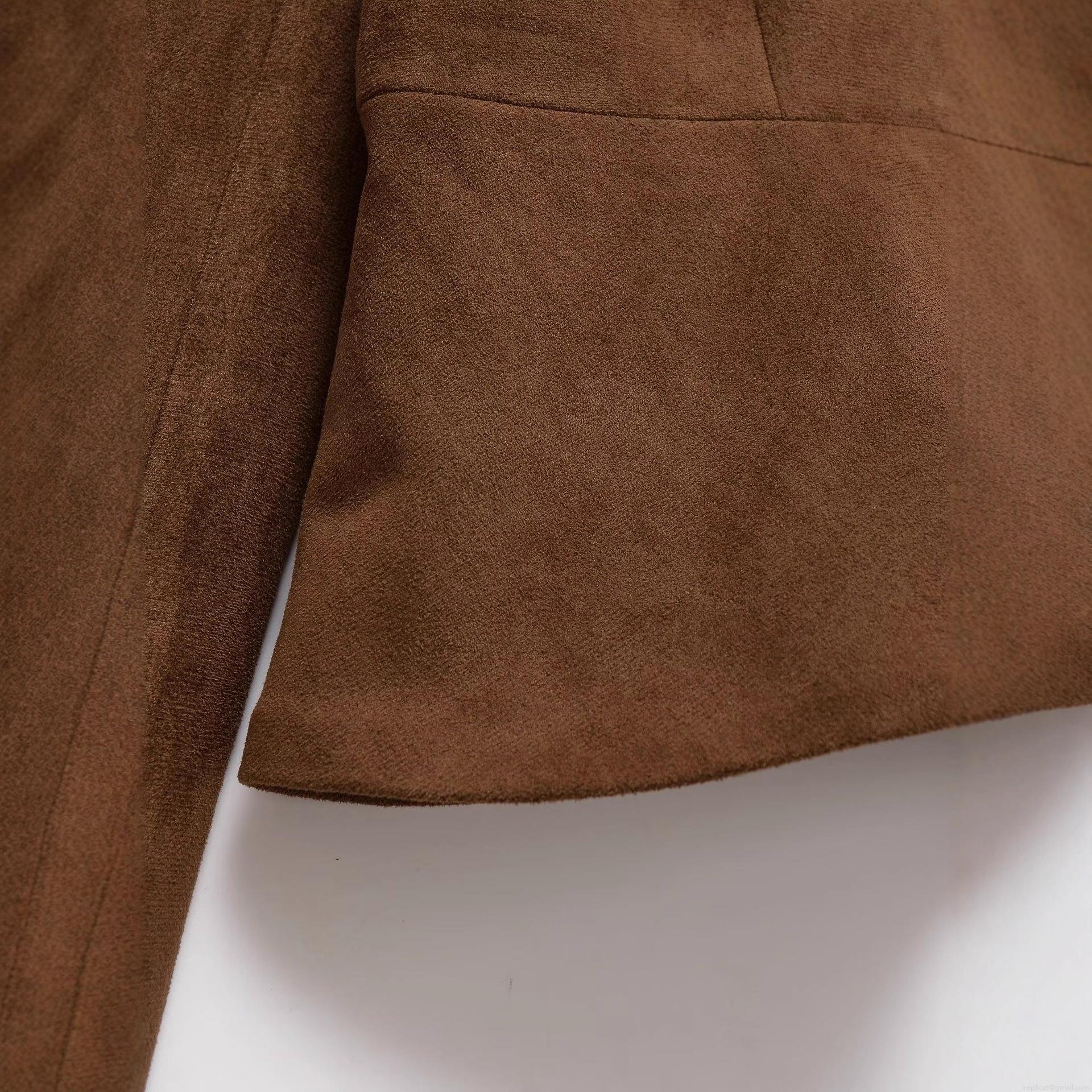 Women's Dark Brown Suede Jacket Fashion Round Neck Single Breasted Long Sleeve Loose Baseball Jacket For Autumn Winter Casual Streetwear Ladies Outwear