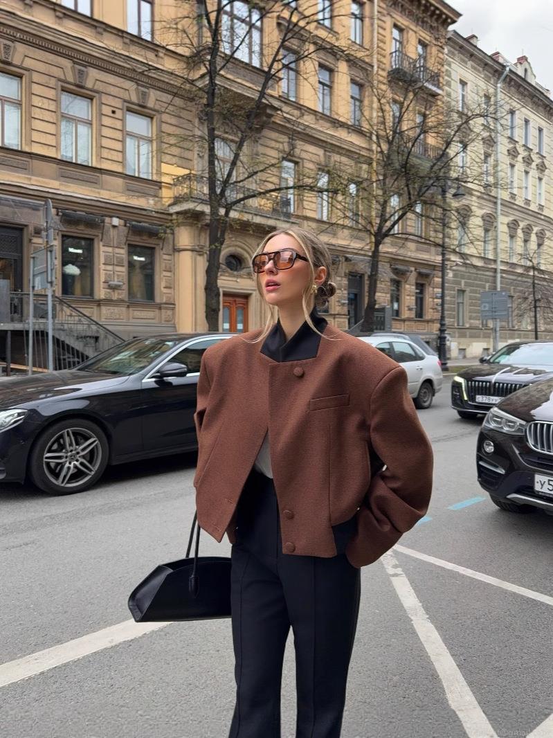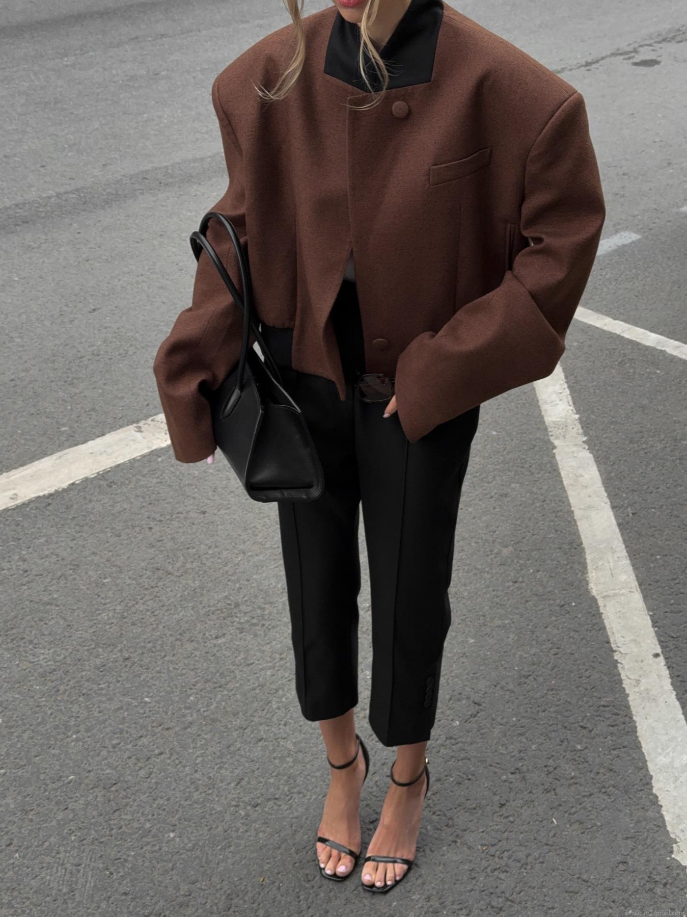 • Women's Dark Brown Wool Blend Stiff Shoulder Pad Jacket Elegant Casual Oversized Short Coat For Streetwear Office Ladies Stylish Autumn Outerwear