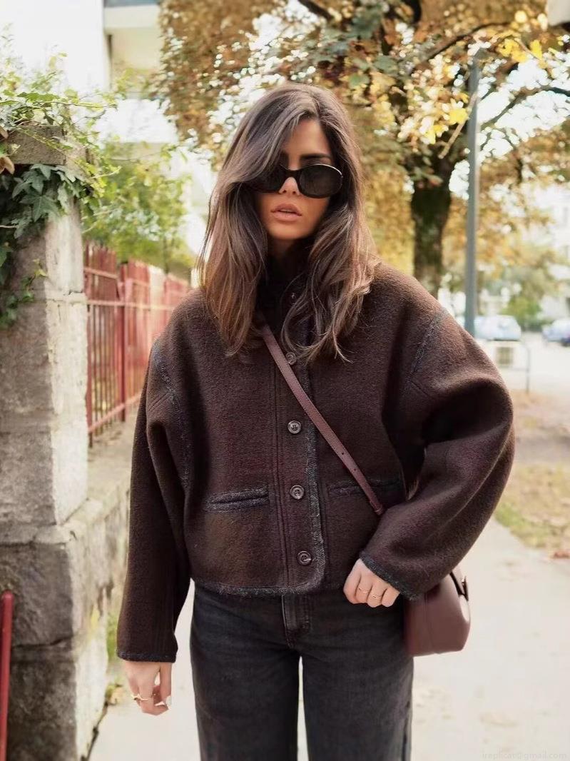 • Women's Dark Brown Woolen Look Jacket Single Breasted Round Neck Contrast Piping Long Sleeve Coat For Autumn Winter Streetwear Casual Outerwear