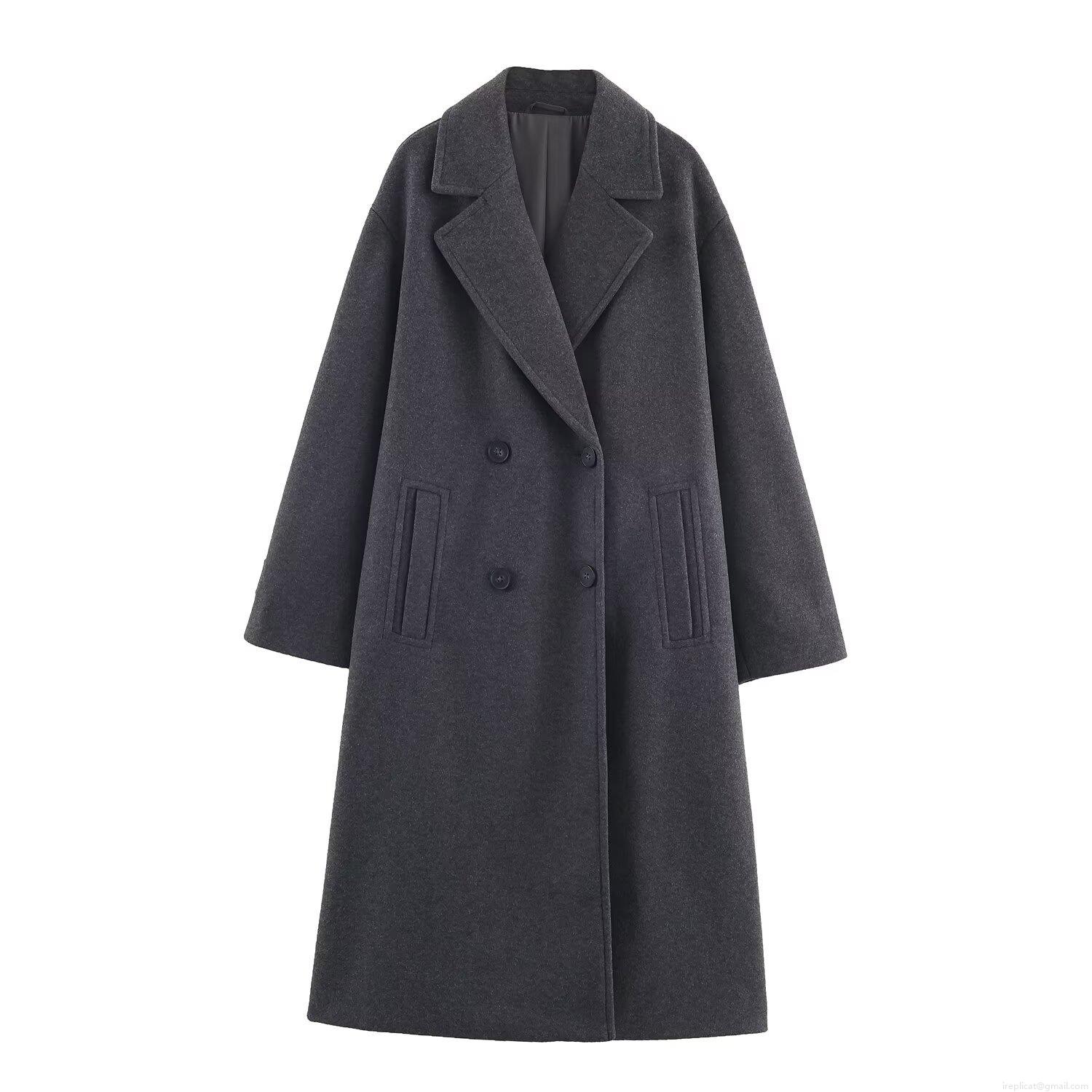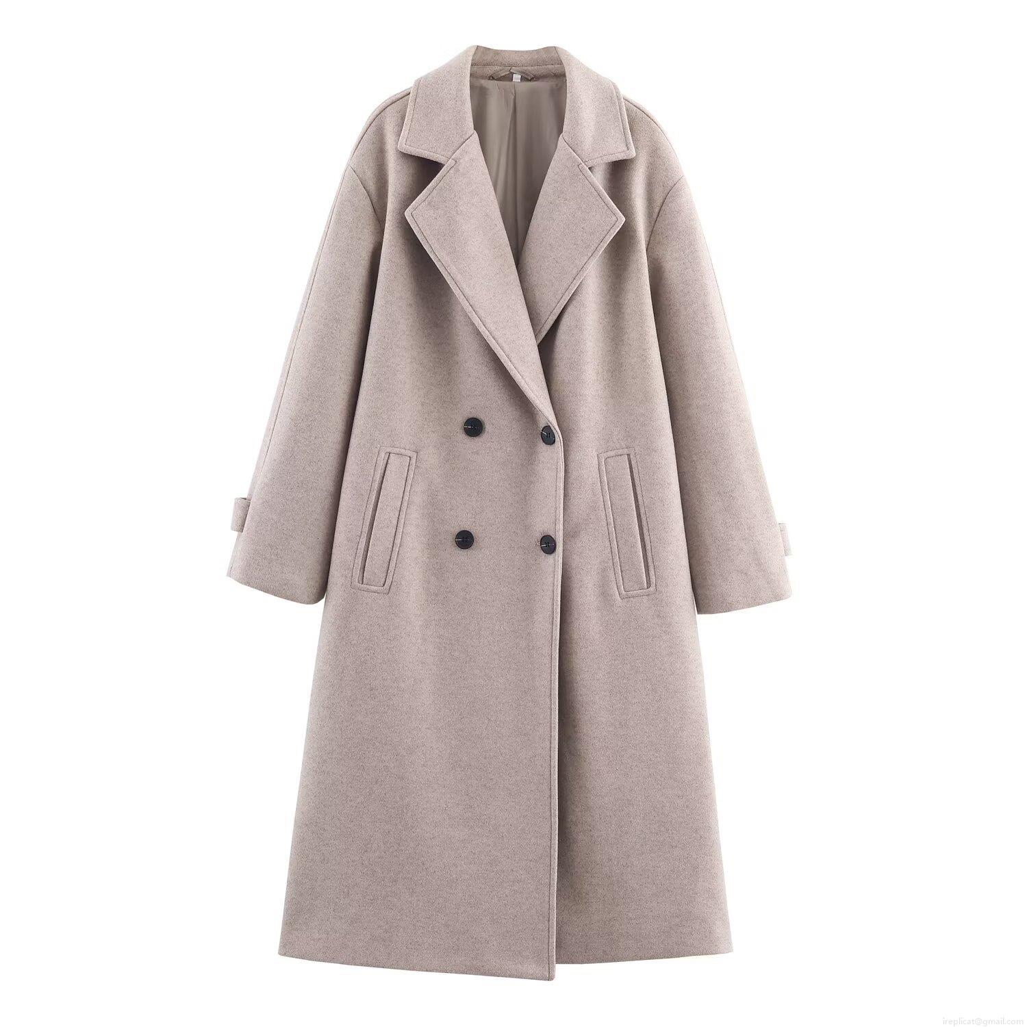 • Women's Double Breasted Long Woolen Coat Elegant Lapel Overcoat Solid Color Winter Warm Loose Jacket For Ladies