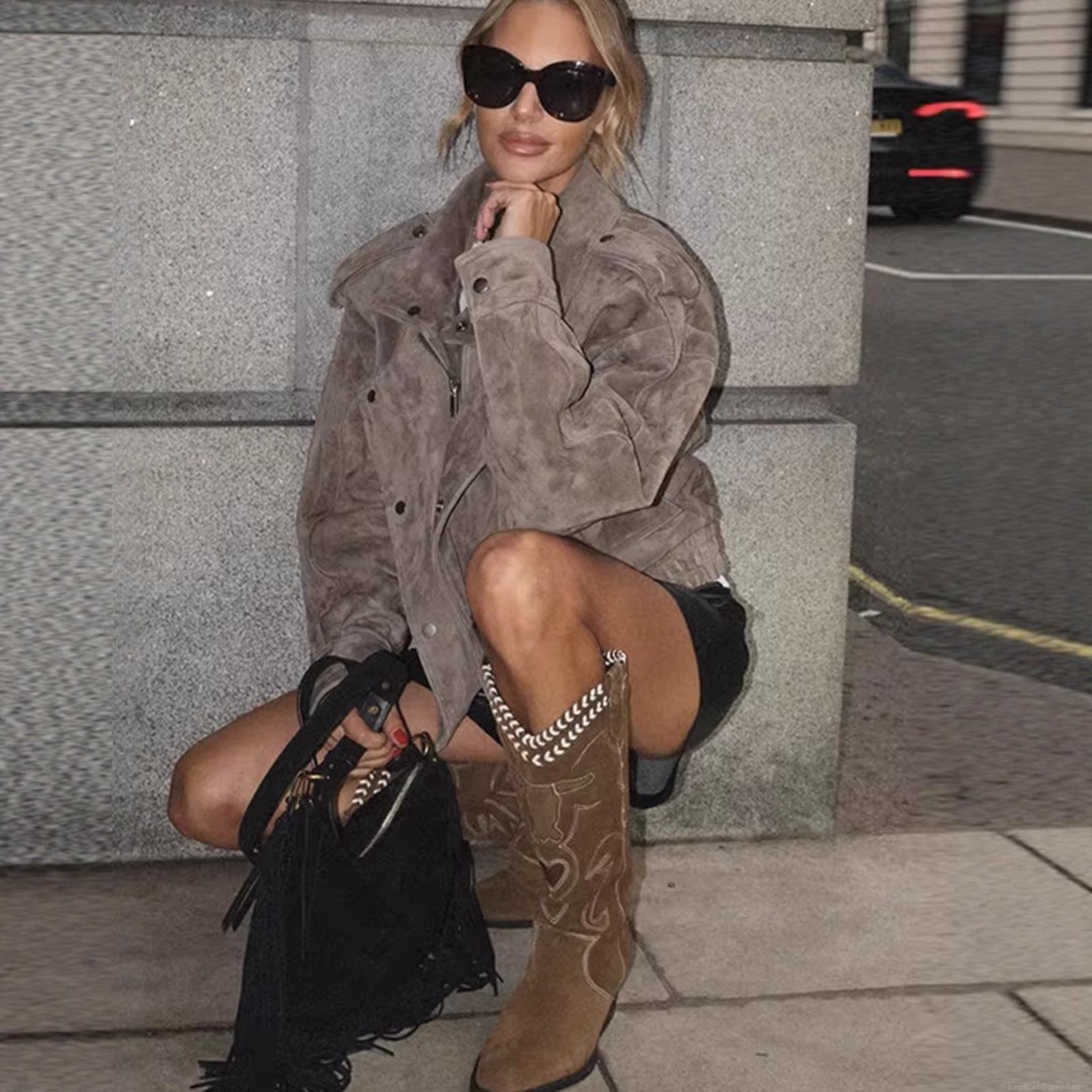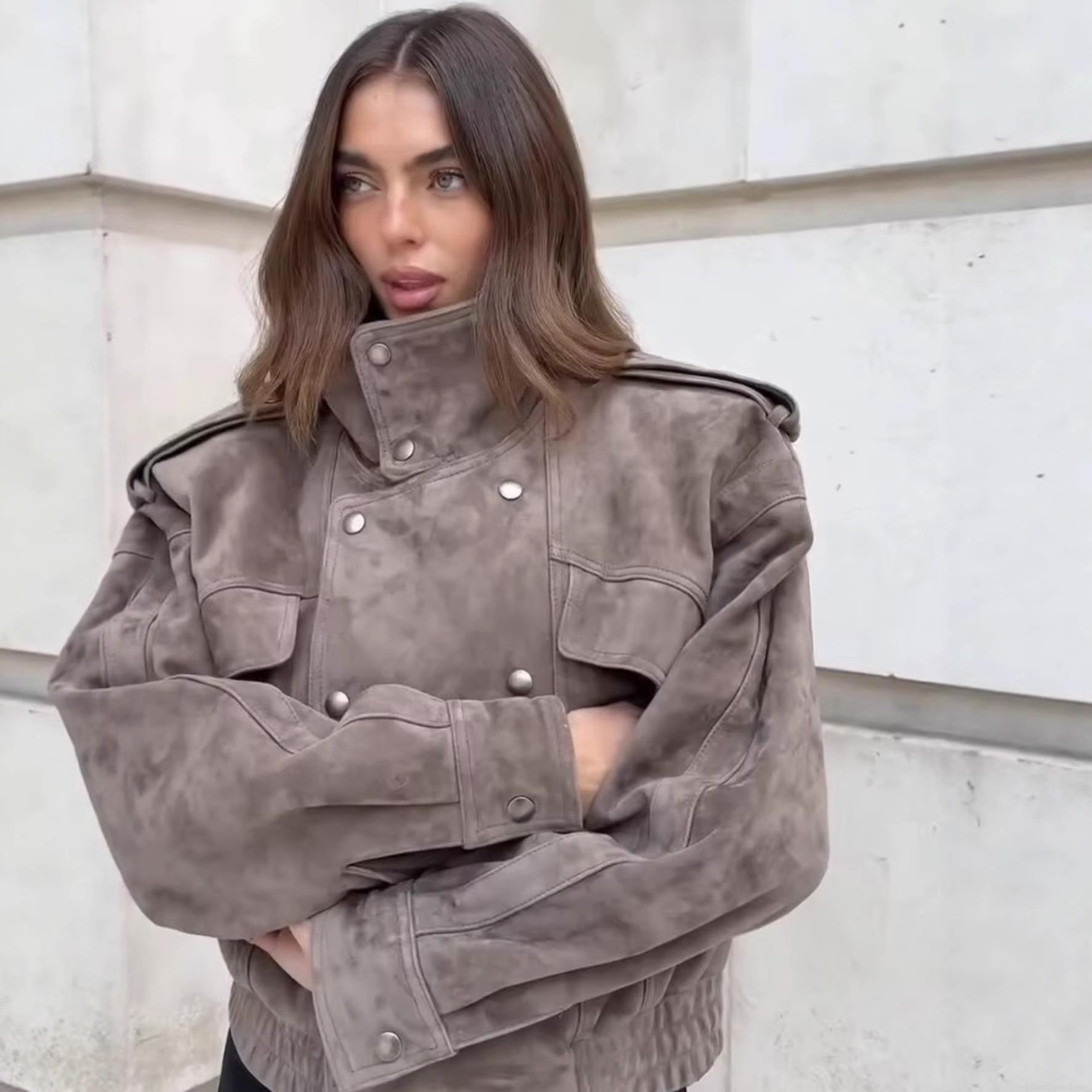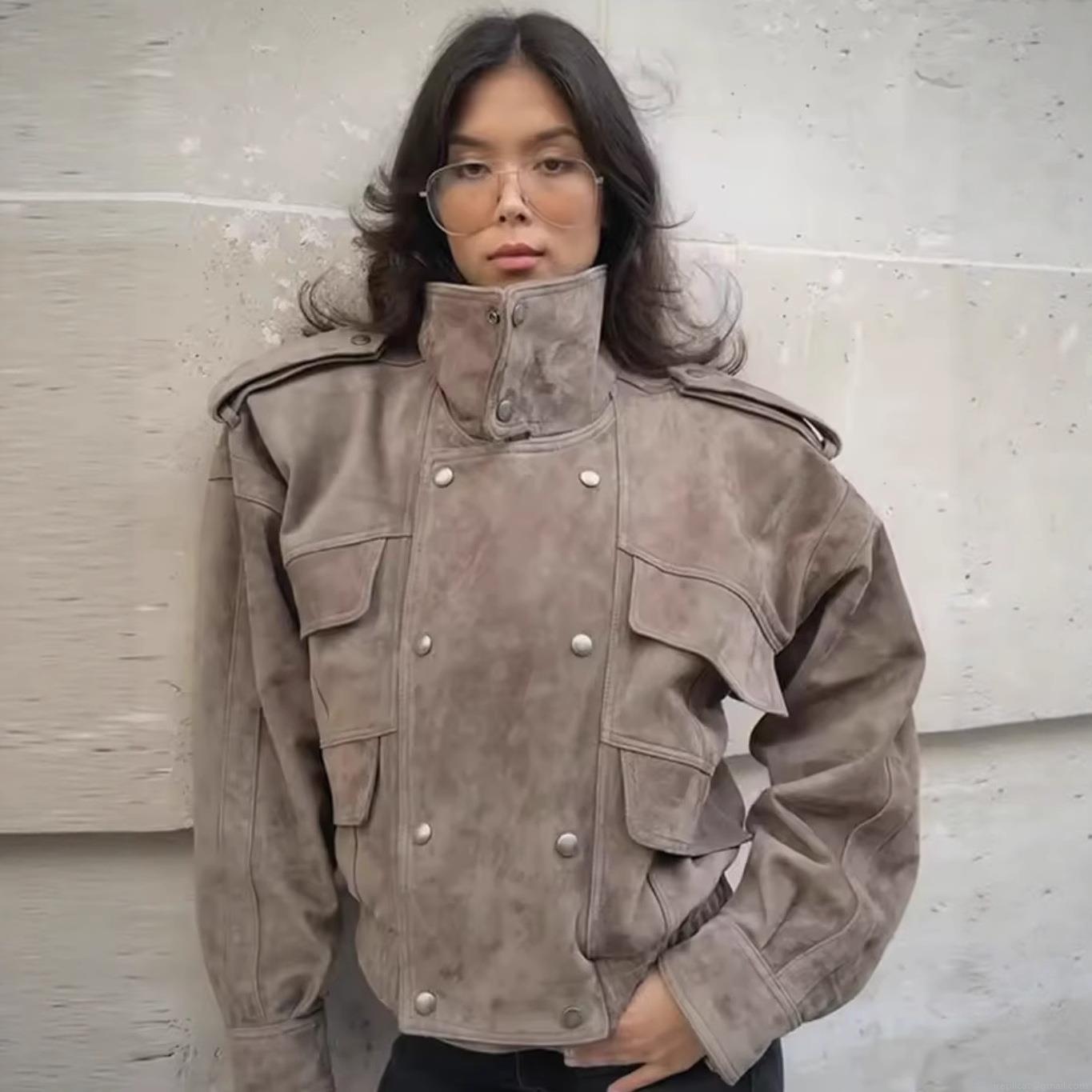 • Women's Double Breasted Suede Jacket Vintage Stand Collar Moto Jacket Short Faux Suede Coat With Pockets For Women Streetwear Autumn Outwear