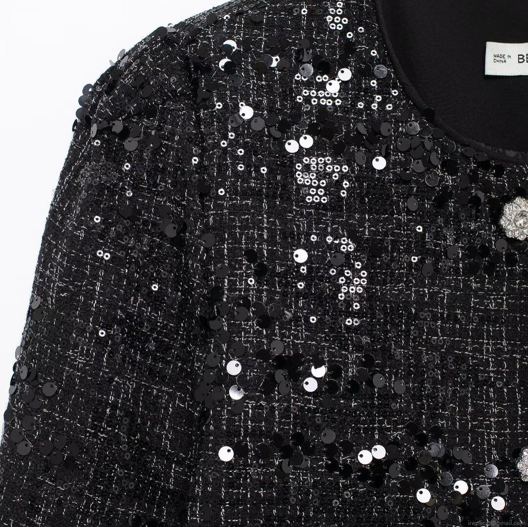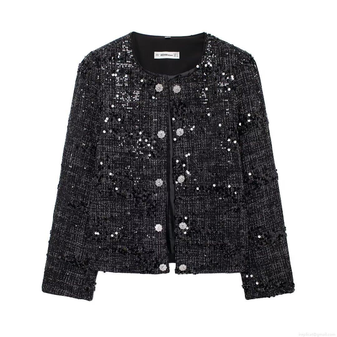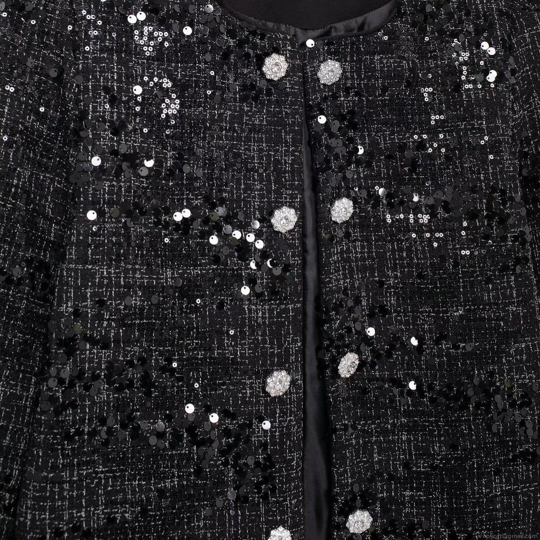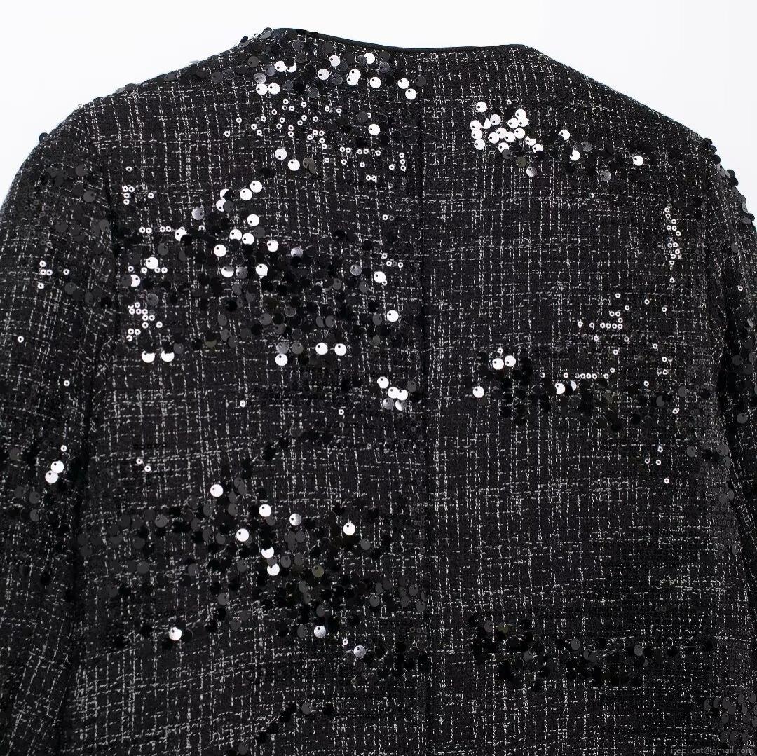 • Women's Elegant Black Sequin Tweed Jacket Round Neck Long Sleeve Short Coat Luxury Celebrity Style Outerwear With Flower Rhinestone Buttons