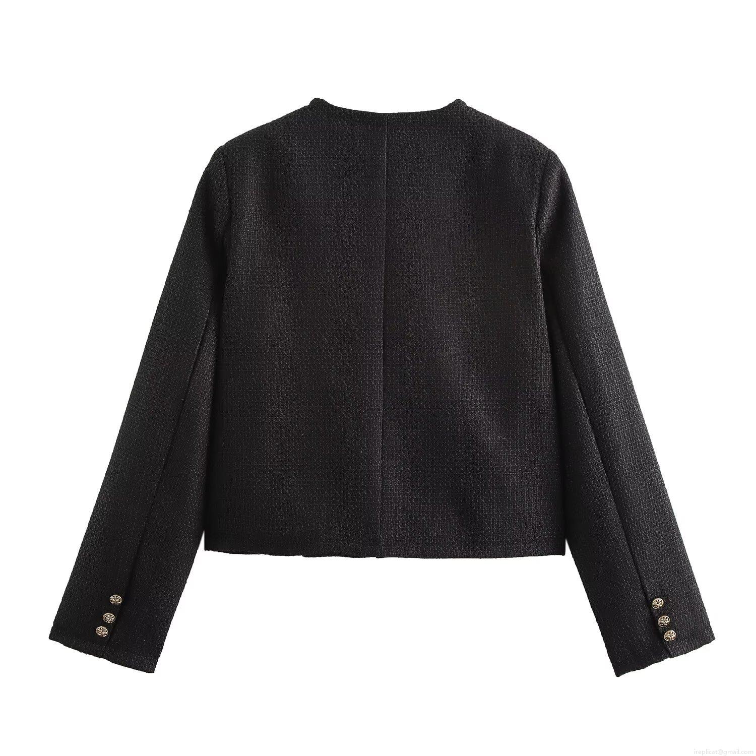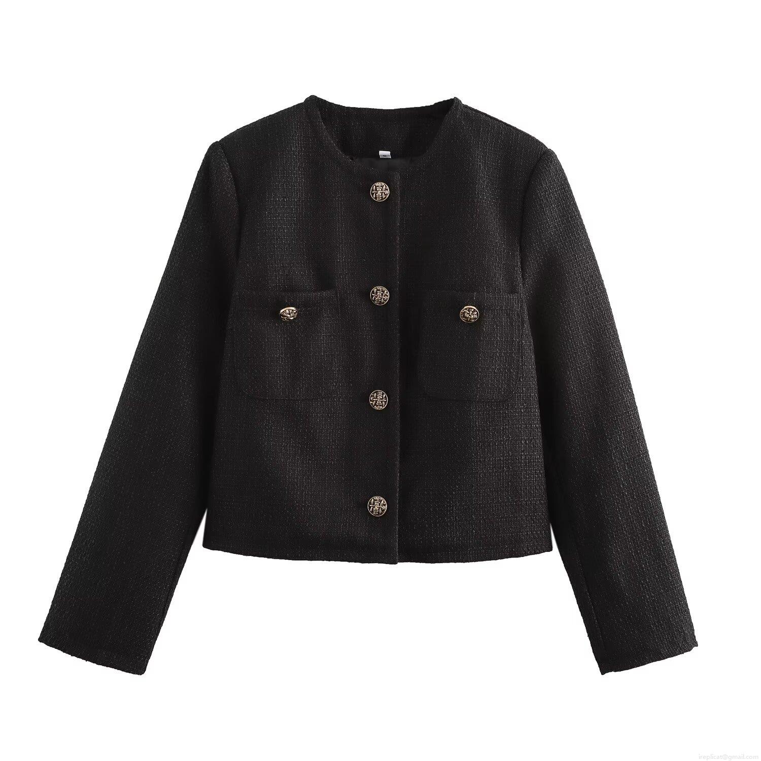 • Women's Elegant Black Tweed Jacket Vintage Round Neck Long Sleeve Short Outerwear With Gold Buttons For Daily Office Wear Lady Casual Coat
