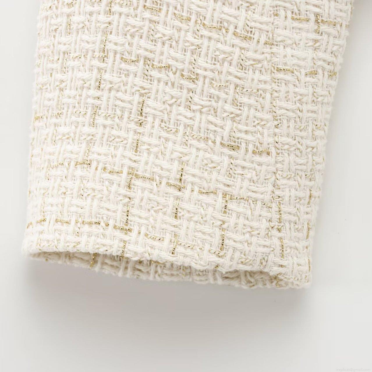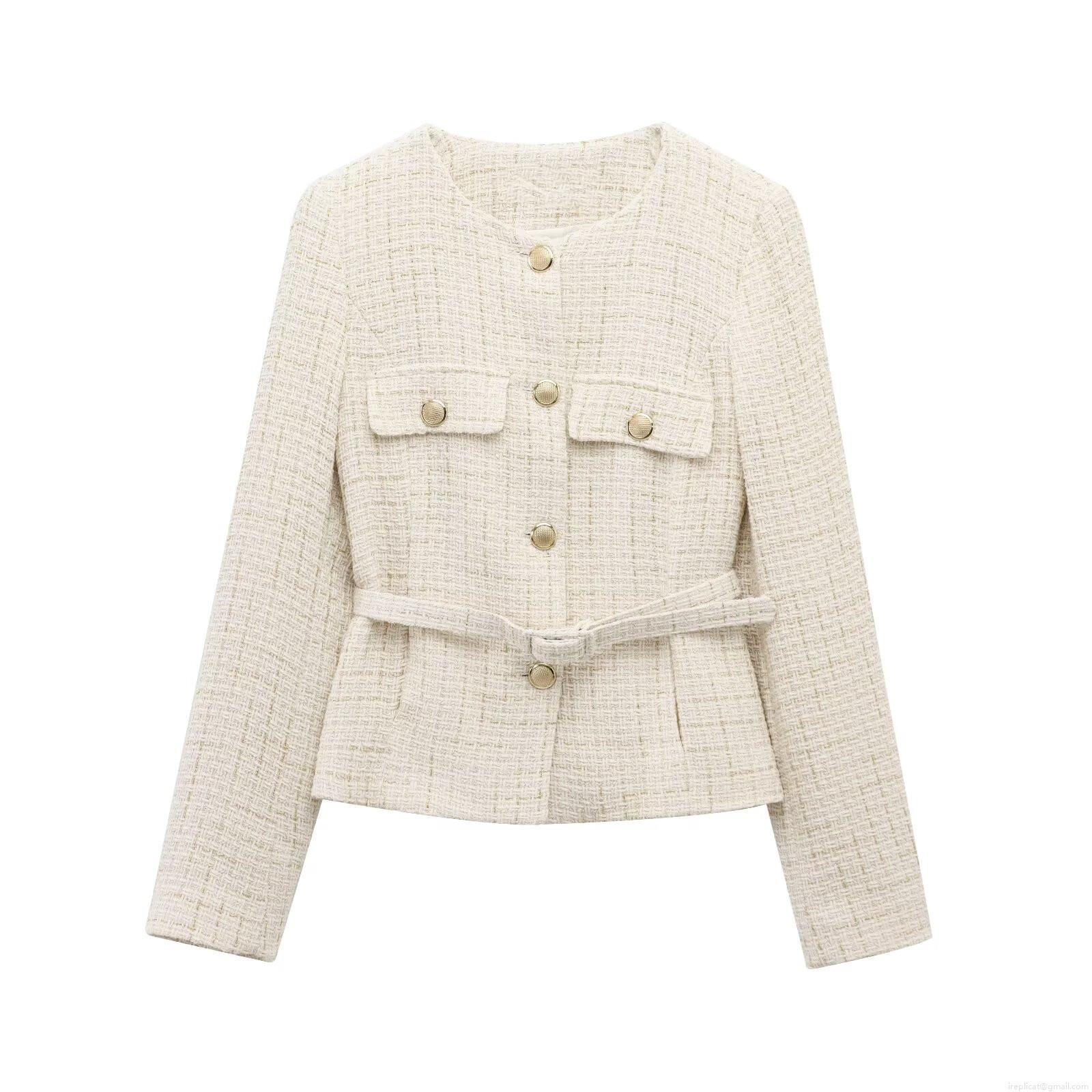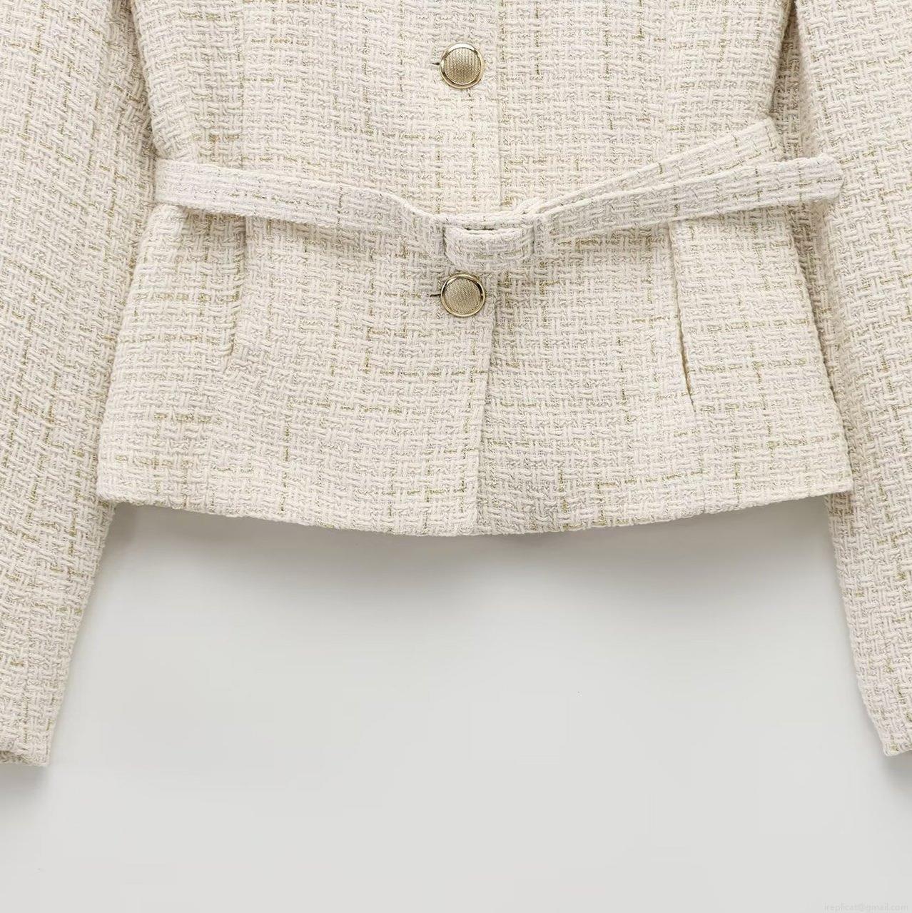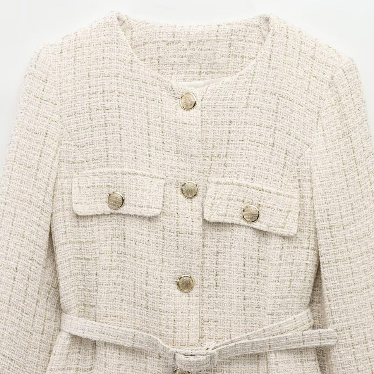 • Women's Elegant Cream Tweed Jacket With Belt Round Neck Long Sleeve Gold Button Office Commuter Chanel Style Short Outerwear Coat