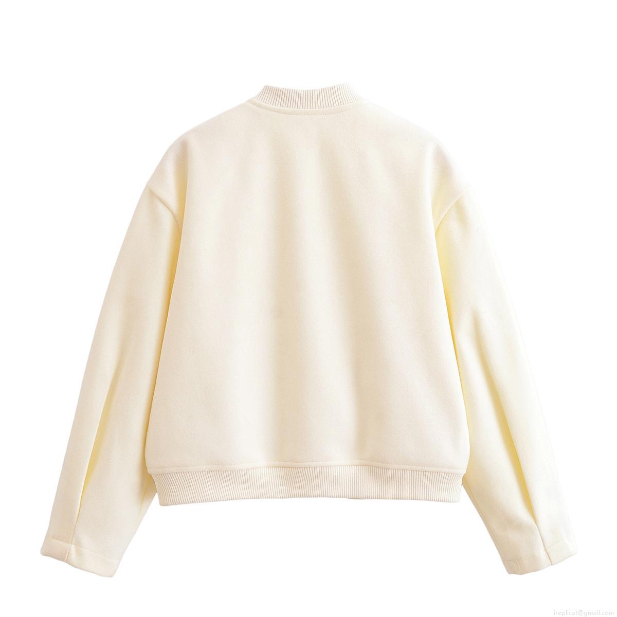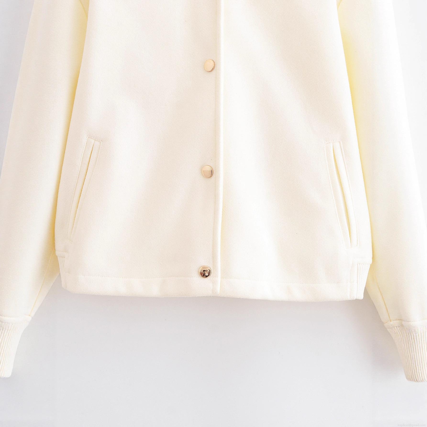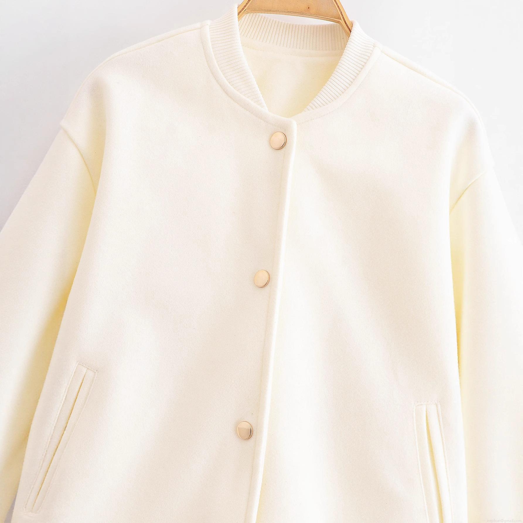 • Women's Elegant Cream Woolen Felt Bomber Jacket Gold Button Short Baseball Outwear Minimalist Long Sleeve Cropped Coat For Women Spring Autumn