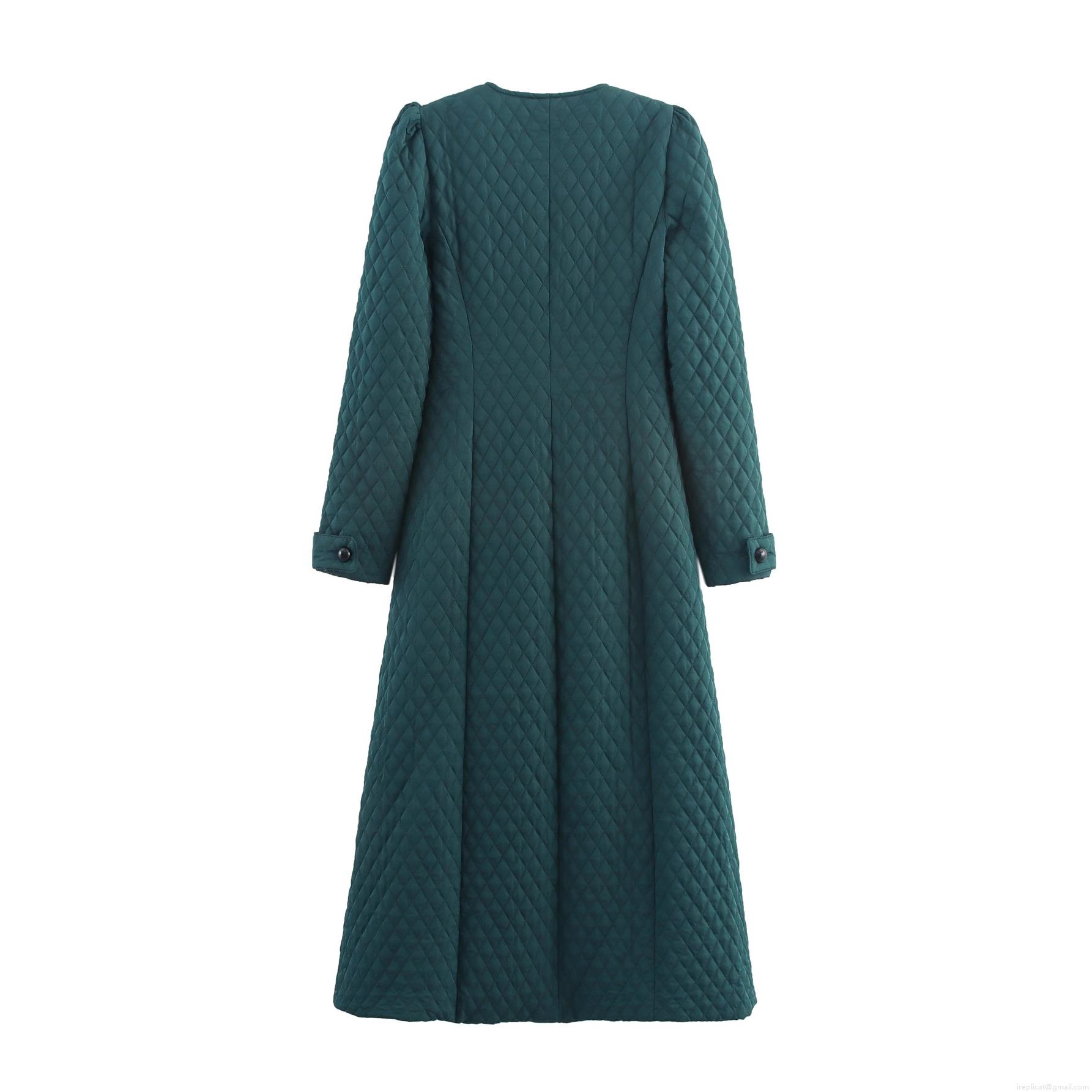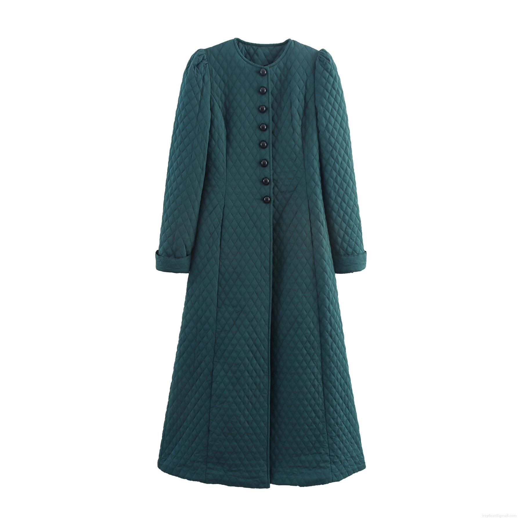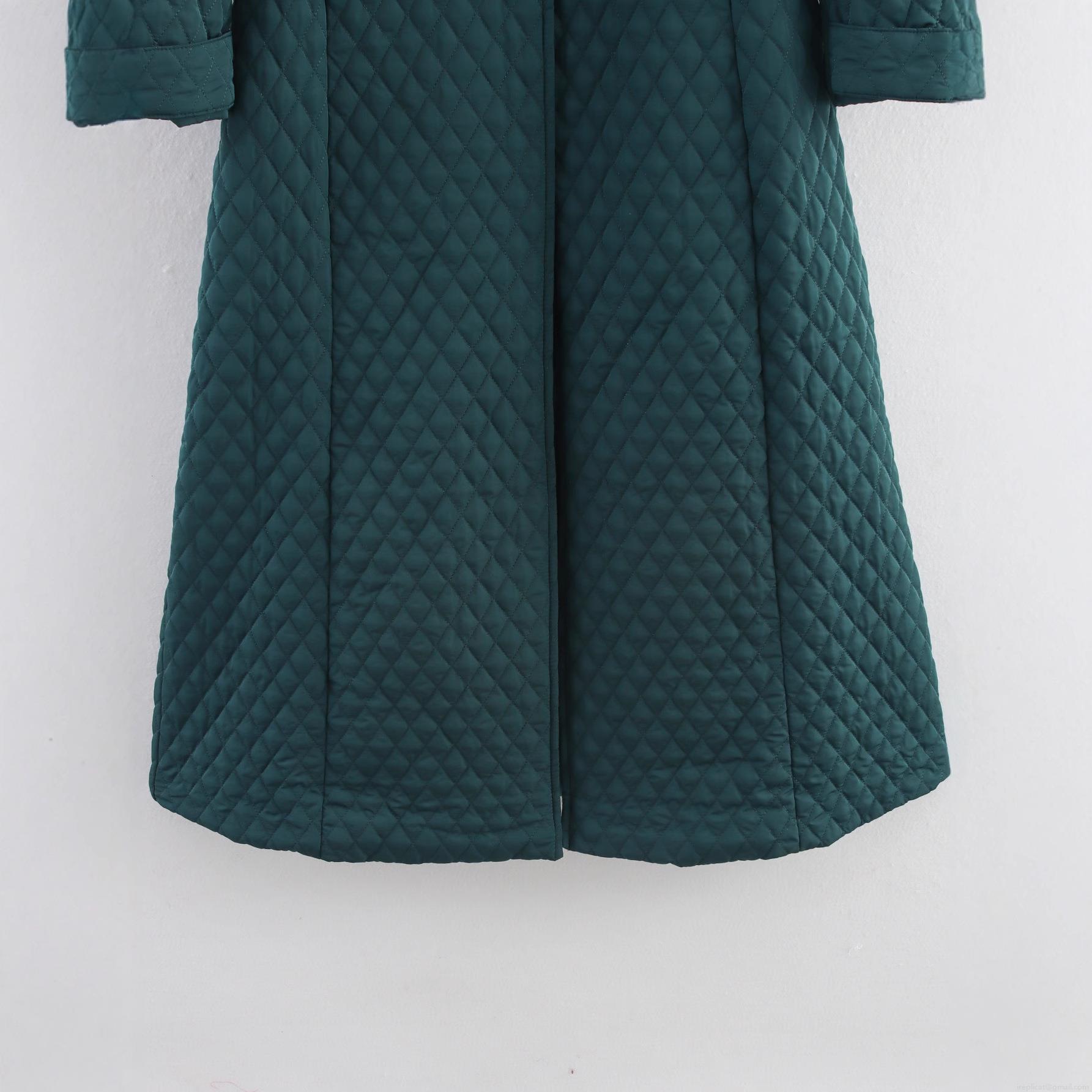• Women's Elegant Dark Green Quilted Long Coat Diamond Pattern Padded Jacket Polyester Round Neck Single Breasted Warm Outerwear Casual Ladies