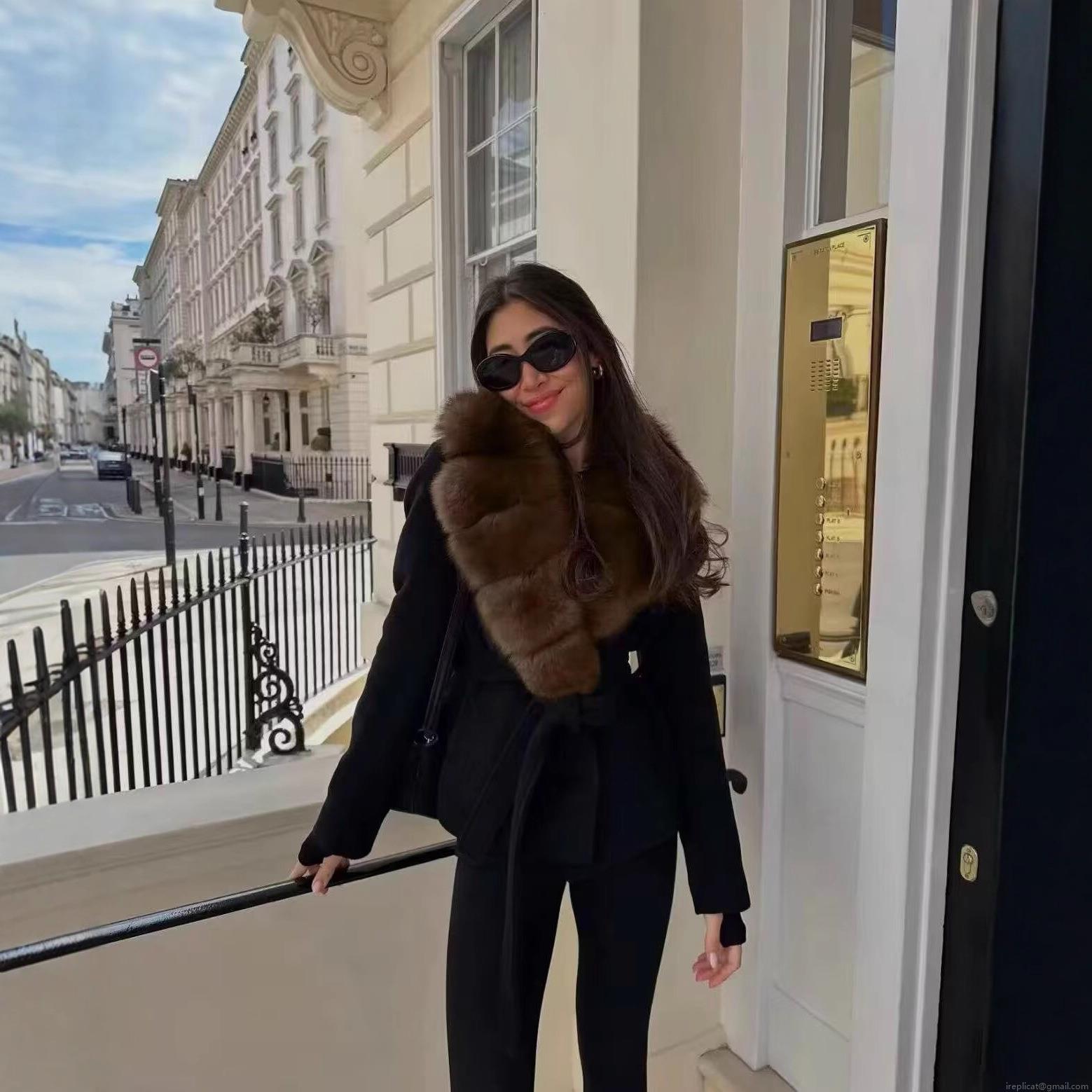 Women's Elegant Faux Fur Collar Suede Jacket Wool Blend Short Coat With Waist Tie Belt Street Fashion Lady Winter Outerwear