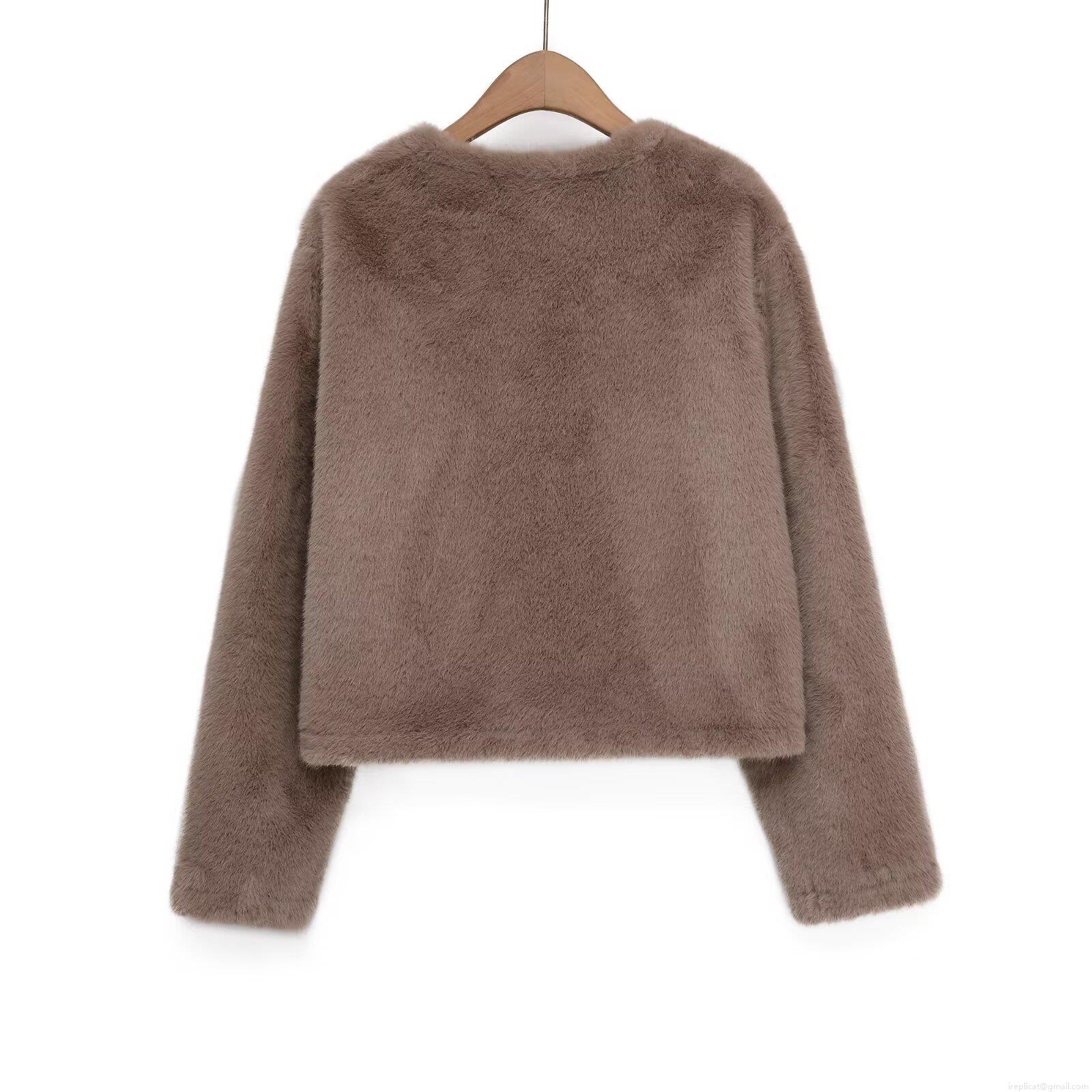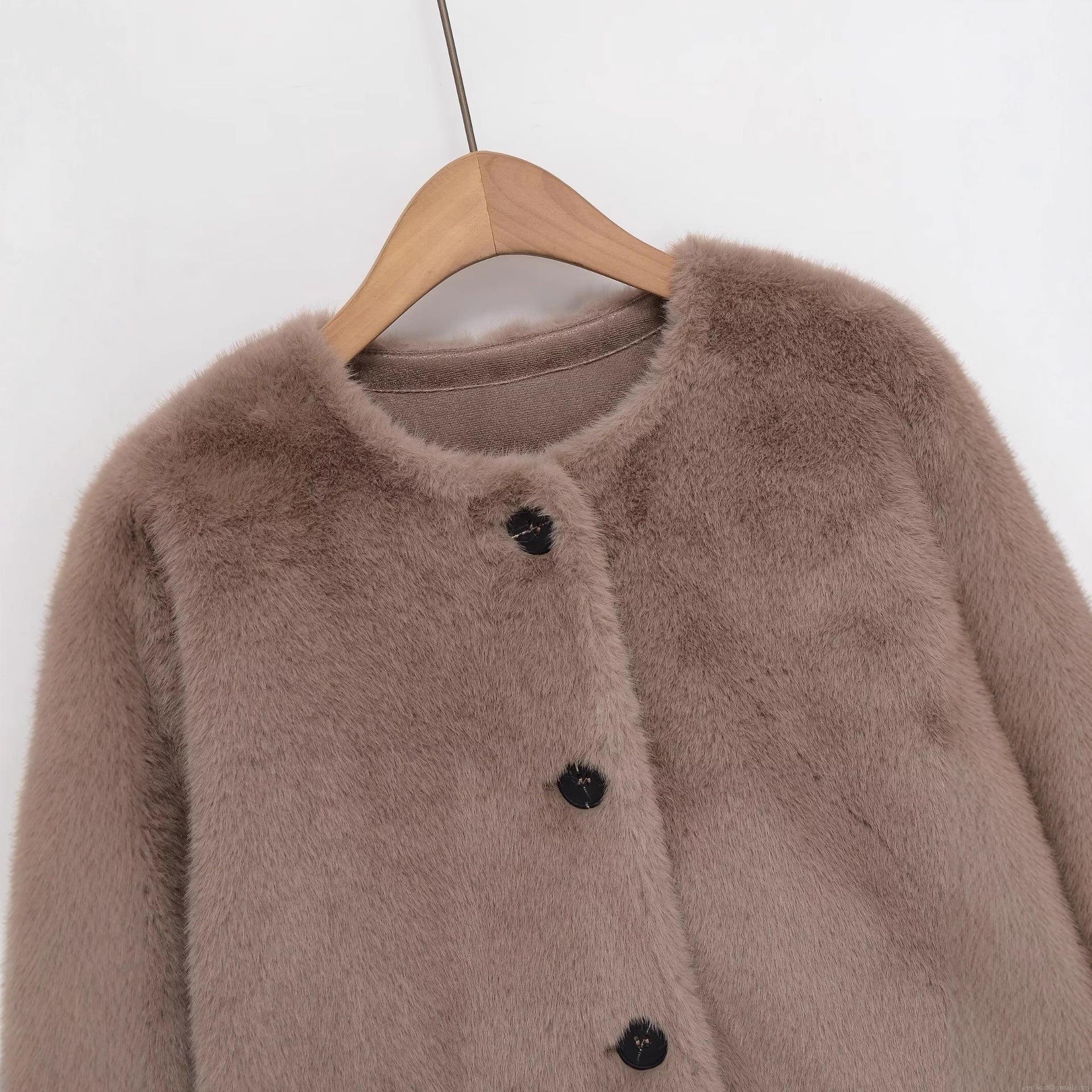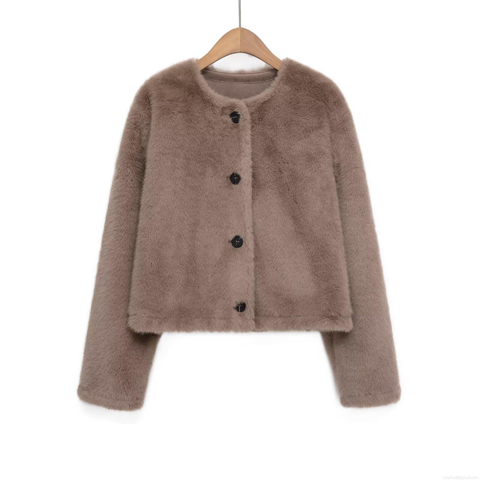 Women's Elegant Faux Fur Jacket Single Breasted Round Neck Crop Coat Autumn Winter Warm European Streetwear Solid Color Plush Outwear