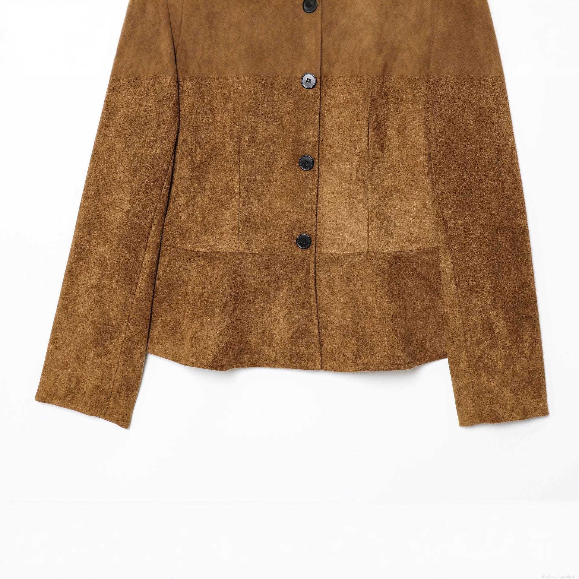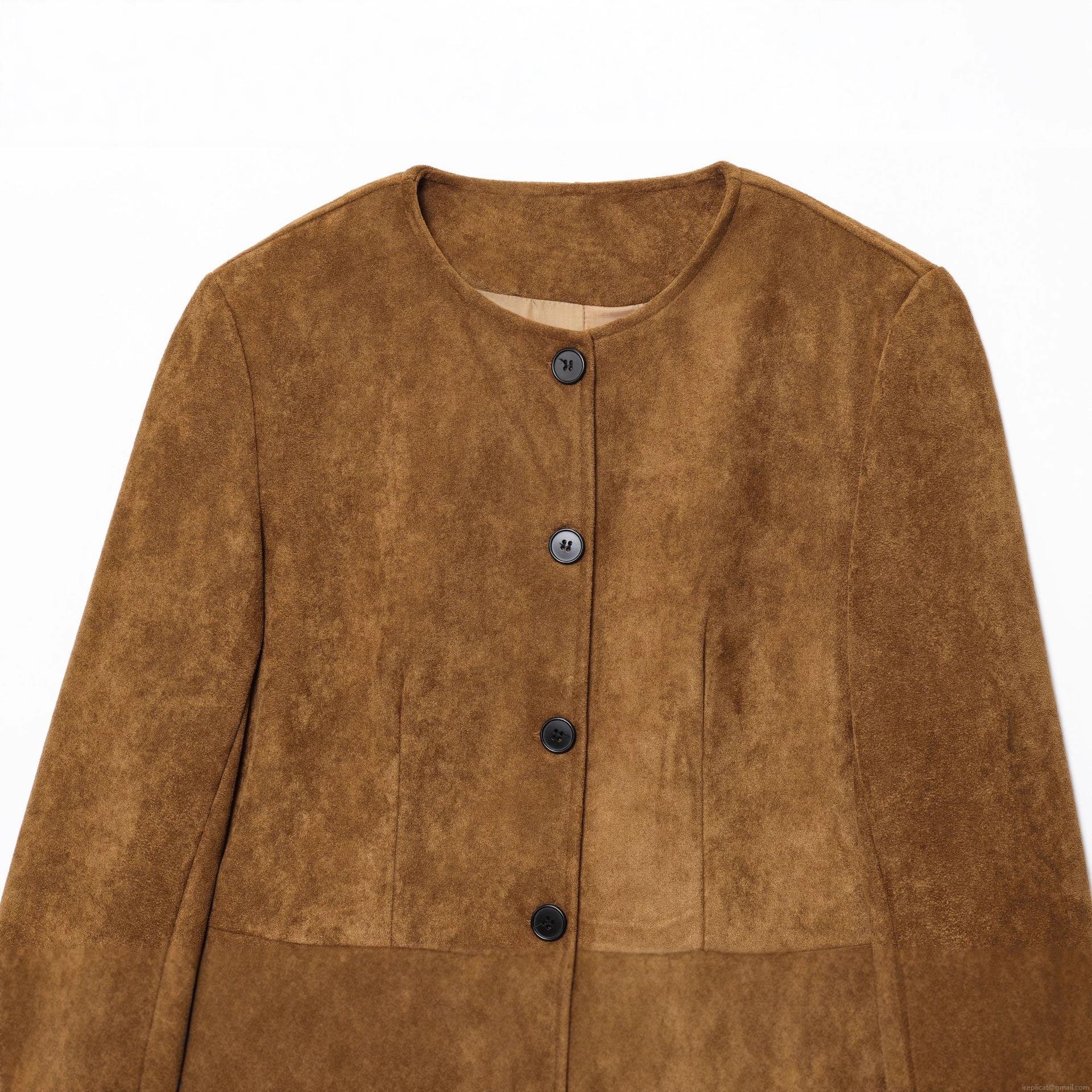 • Women's Elegant Faux Suede Jacket Round Neck Single Breasted Button Down Long Sleeve Short Coat Retro Casual Polyester Outerwear For Lady