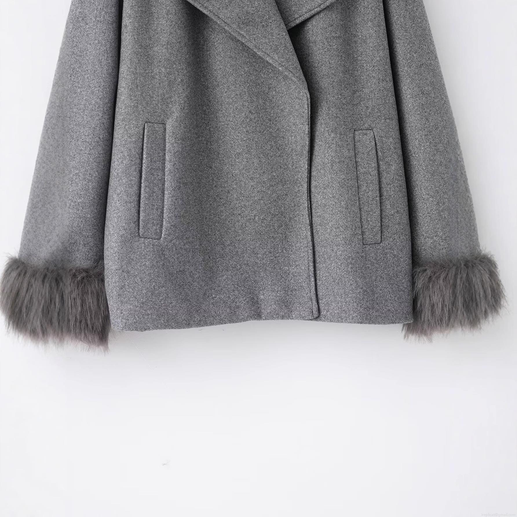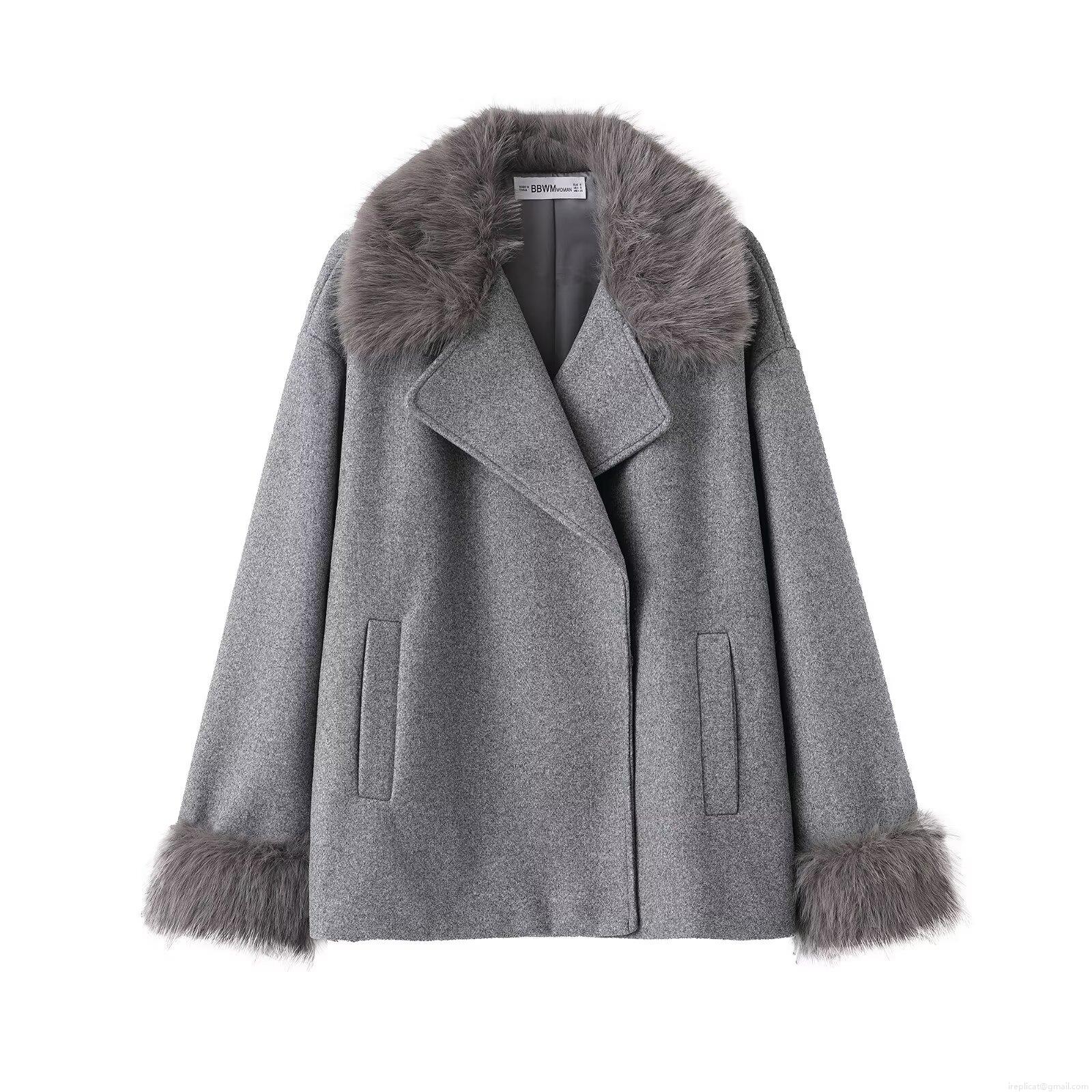• Women's Elegant Grey Faux Fur Trim Woolen Look Short Coat Fashion Lapel Zipper Long Sleeve Jacket For Autumn Winter Daily Lady Outerwear