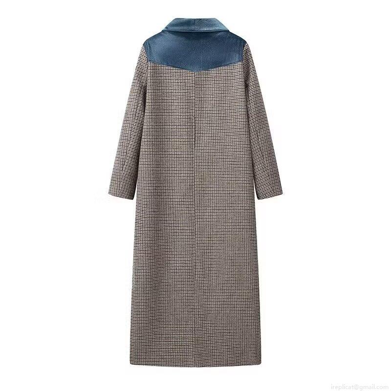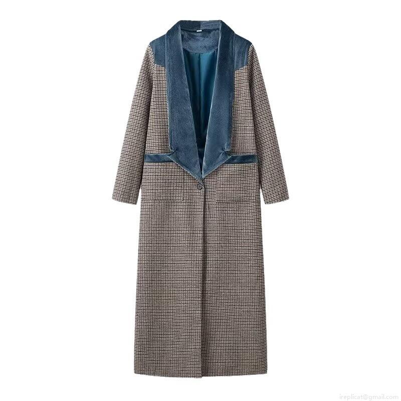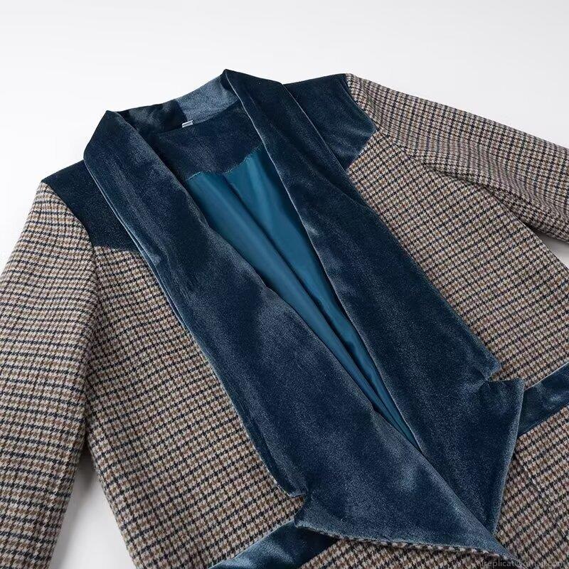 • Women's Elegant Houndstooth Plaid Long Woolen Coat With Teal Blue Velvet Patchwork Lapel Single Breasted Warm Retro Socialite Style Long Sleeve Outerwear Jacket