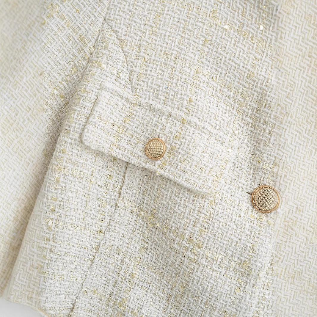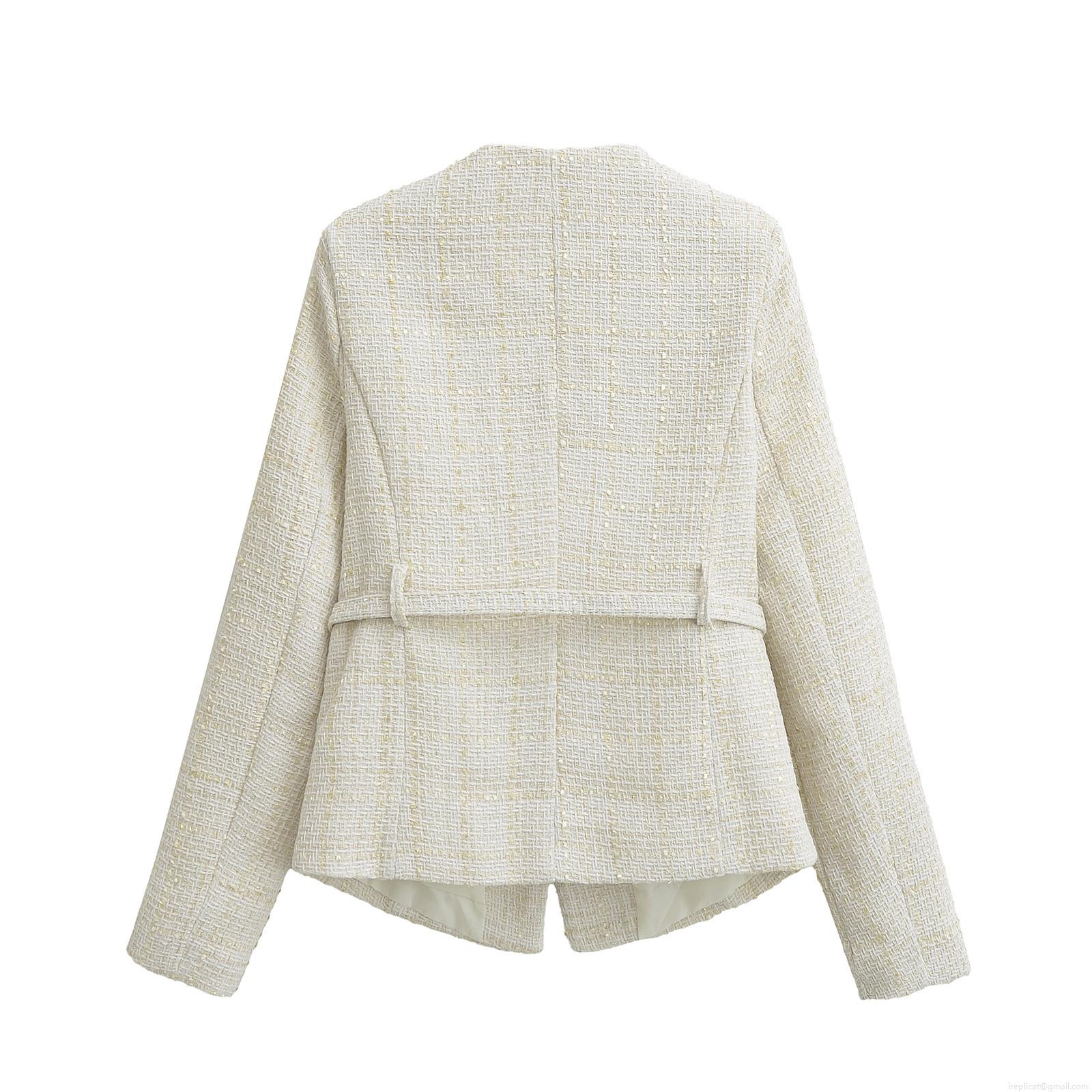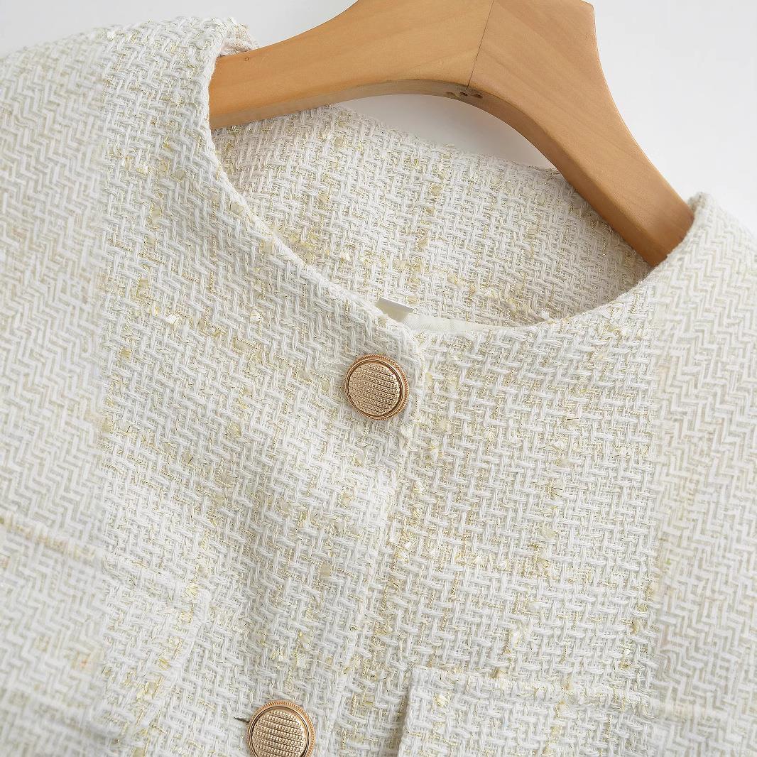 • Women's Elegant Ivory Tweed Jacket With Belt Gold Embossed Buttons Round Neck Long Sleeve Classic Cream Short Coat For Office Daily Autumn Winter Outerwear