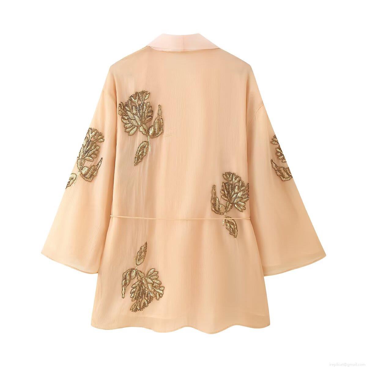 Women's Elegant Kimono Jacket Chiffon Silk Blend Embroidered Beaded Wrap Top With Gold Floral Sequin Tie-Up Closure Short Outerwear For Party Evening
