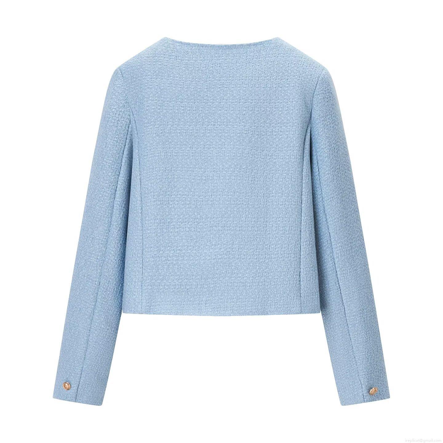 • Women's Elegant Light Blue Tweed Jacket Round Neck Gold Button Long Sleeve Cropped Blazer Coat For Autumn Winter Daily Office Wear Street Style