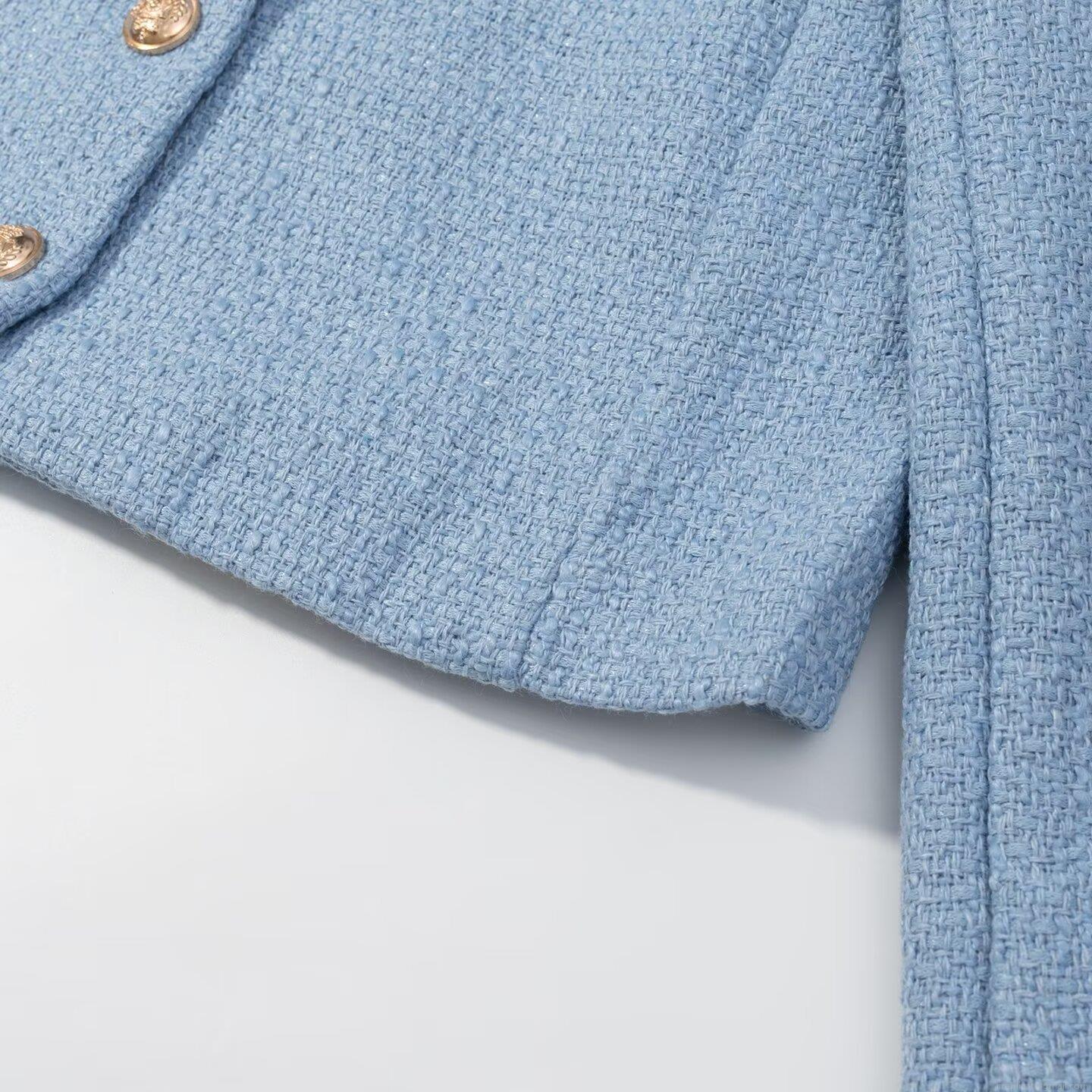Women's Elegant Light Blue Tweed Jacket Round Neck Gold Button Long Sleeve Cropped Blazer Coat For Autumn Winter Daily Office Wear Street Style