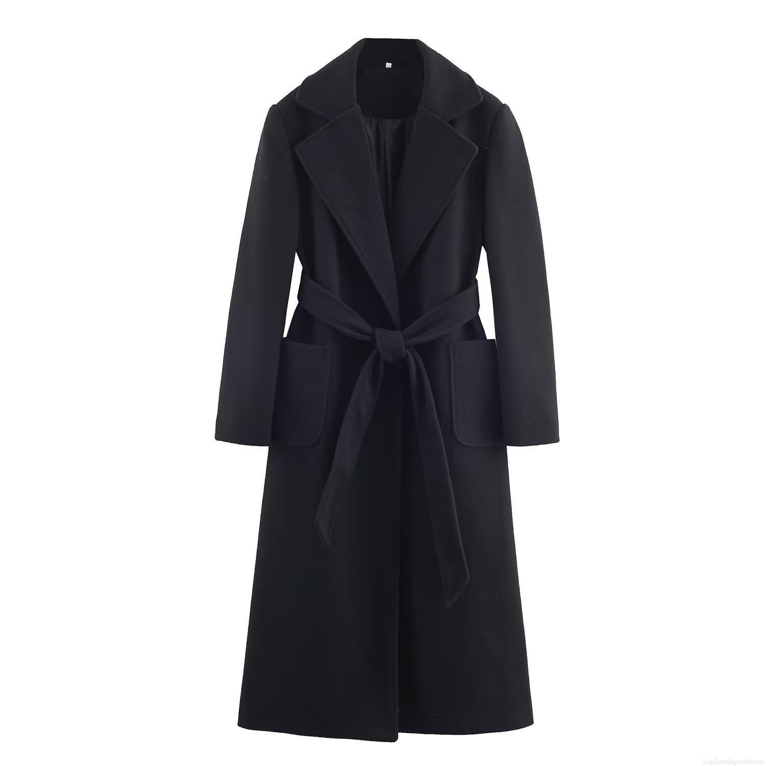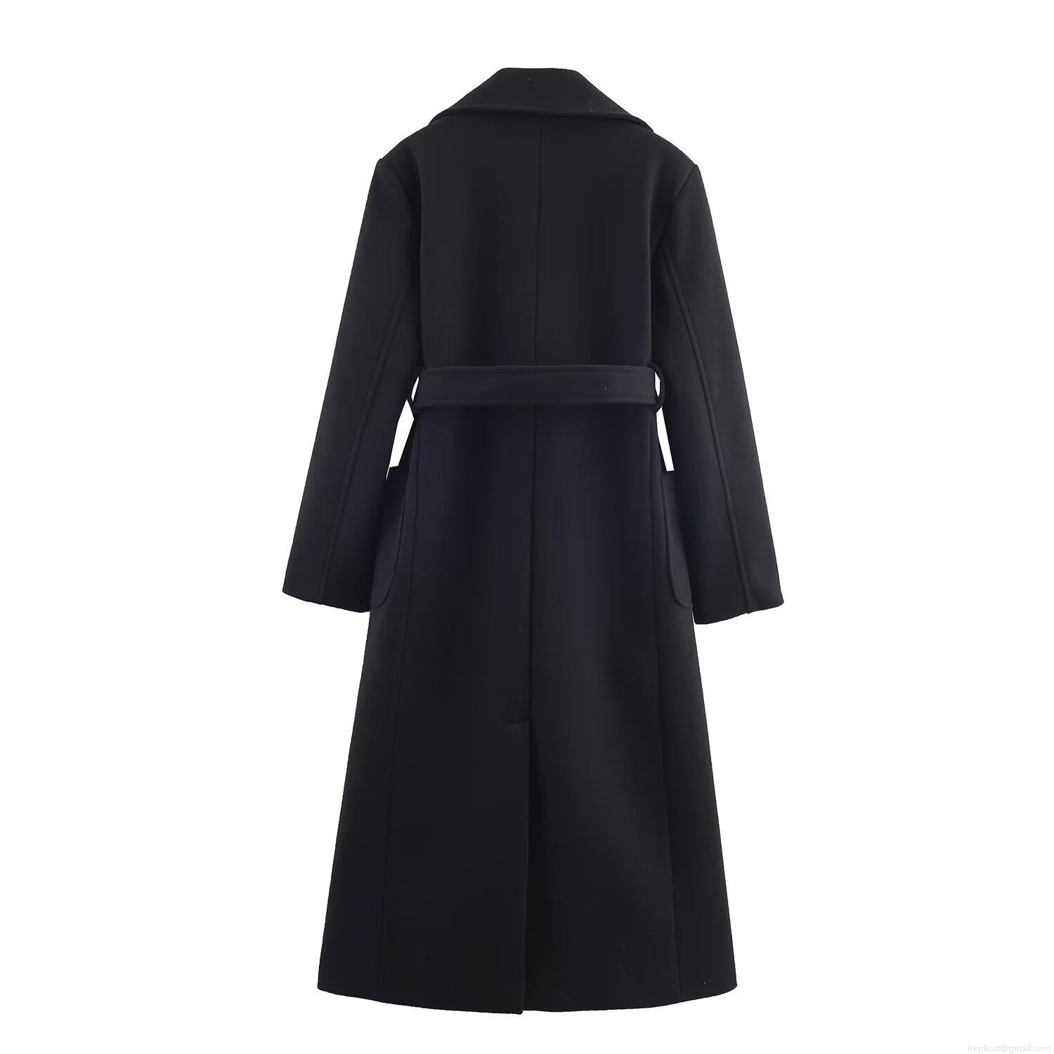 Women's Elegant Long Wool Blend Coat Solid Black Lapel Overcoat With Belt Autumn Winter Office Lady Commuting Jacket