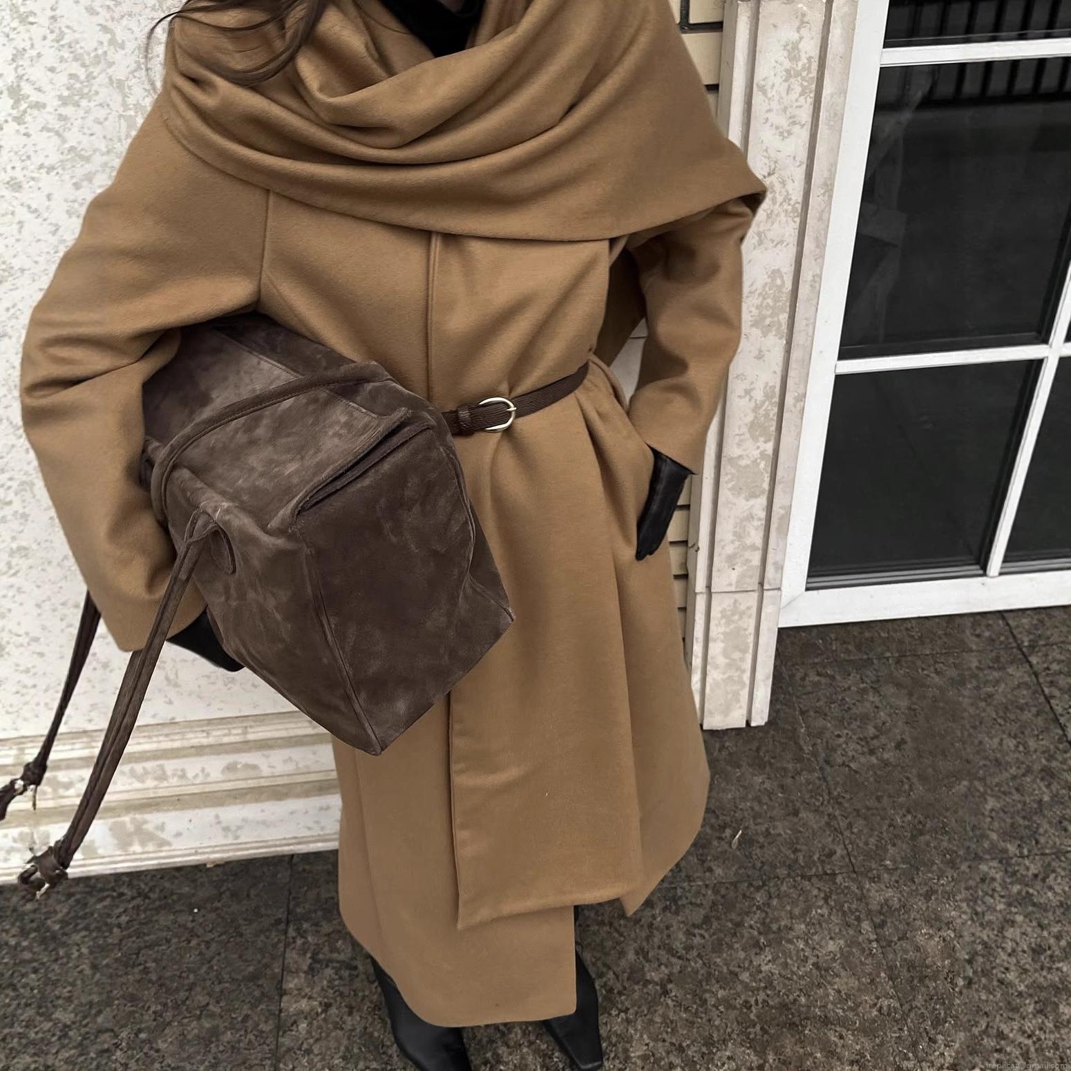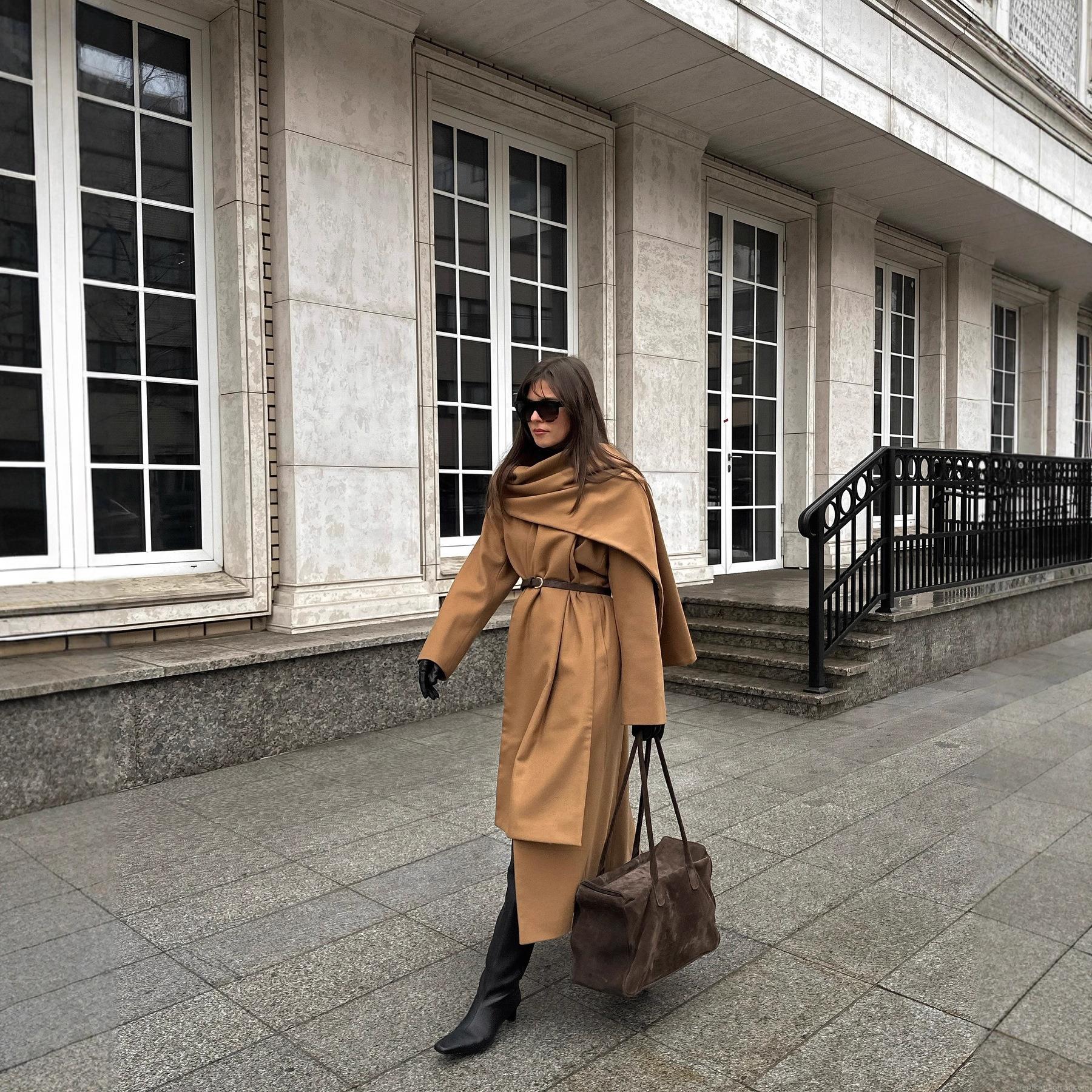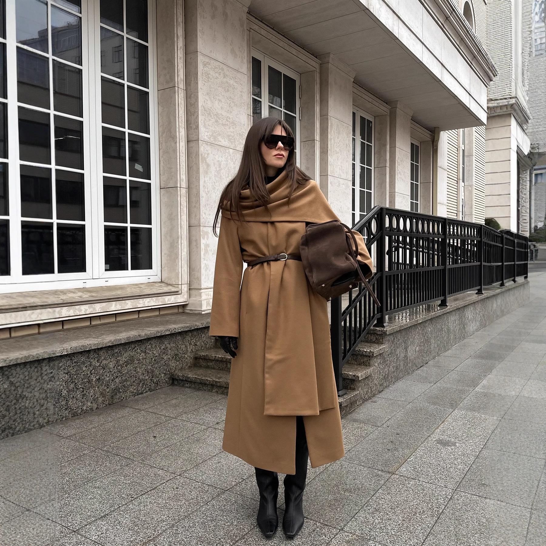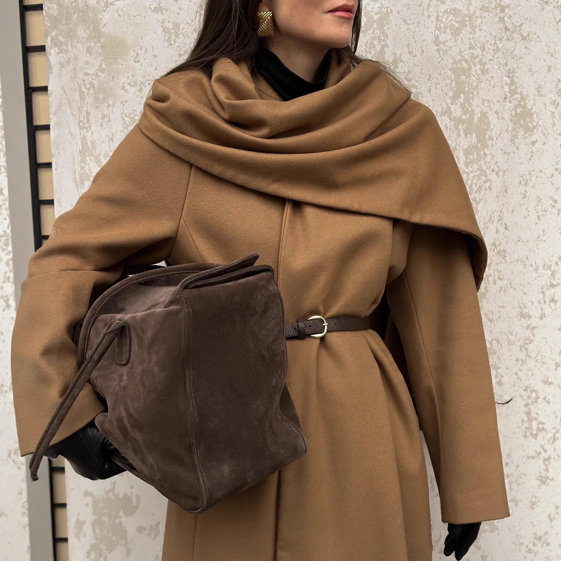 Women's Elegant Long Wool Blend Coat With Integrated Scarf Waist Tie Soft Autumn Winter Outerwear Jacket For Ladies Office Streetwear Camel