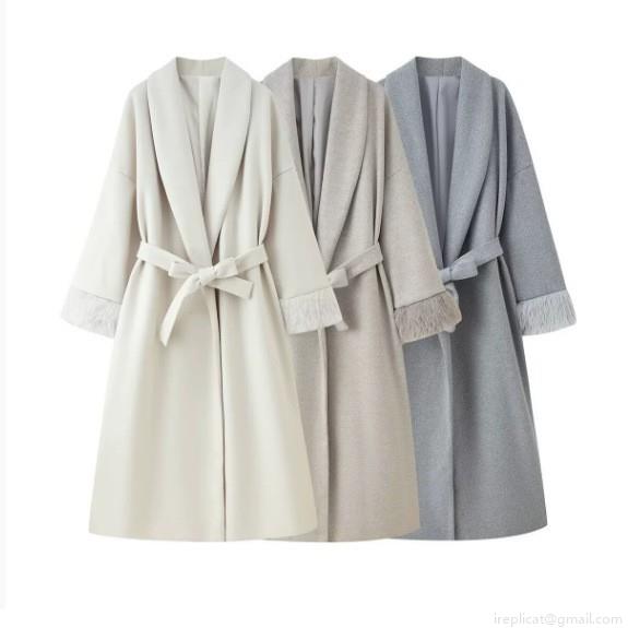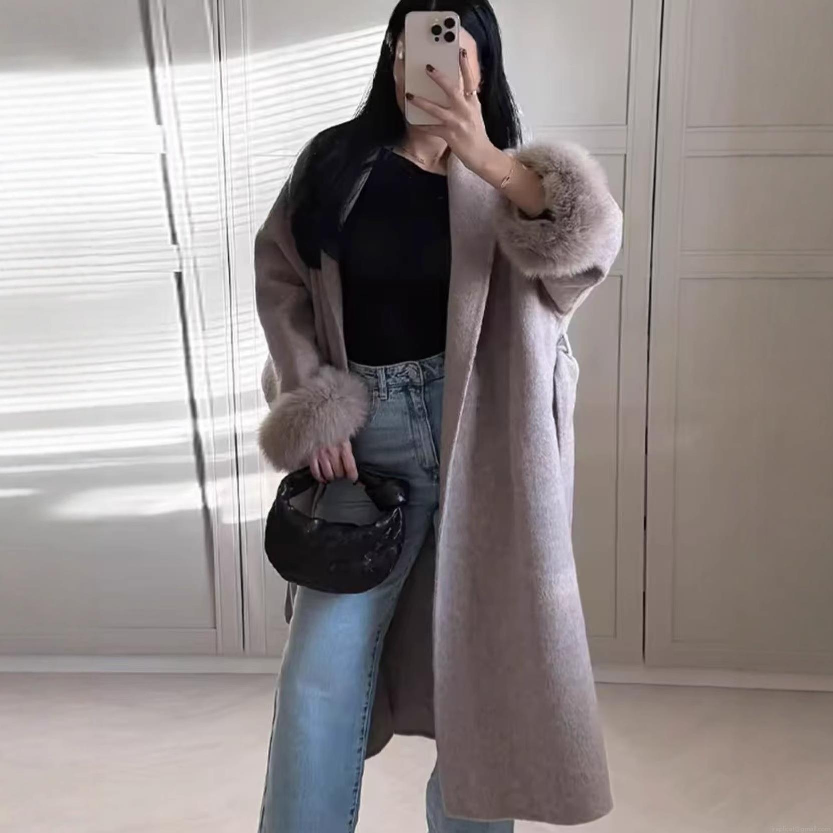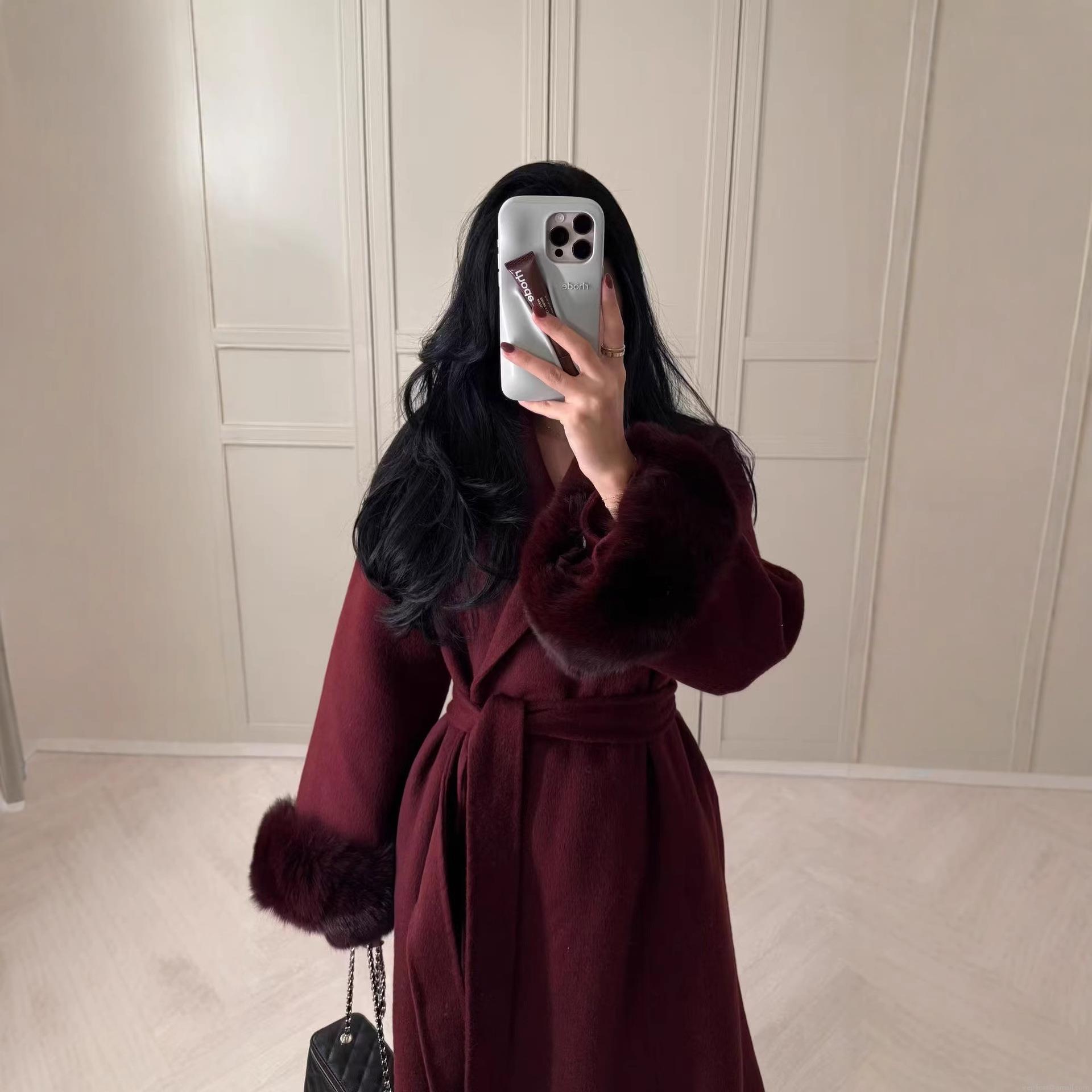 • Women's Elegant Long Woolen Coat With Faux Fur Cuffs Belted Single Breasted Polyester Overcoat For Autumn Winter Fashion Streetwear