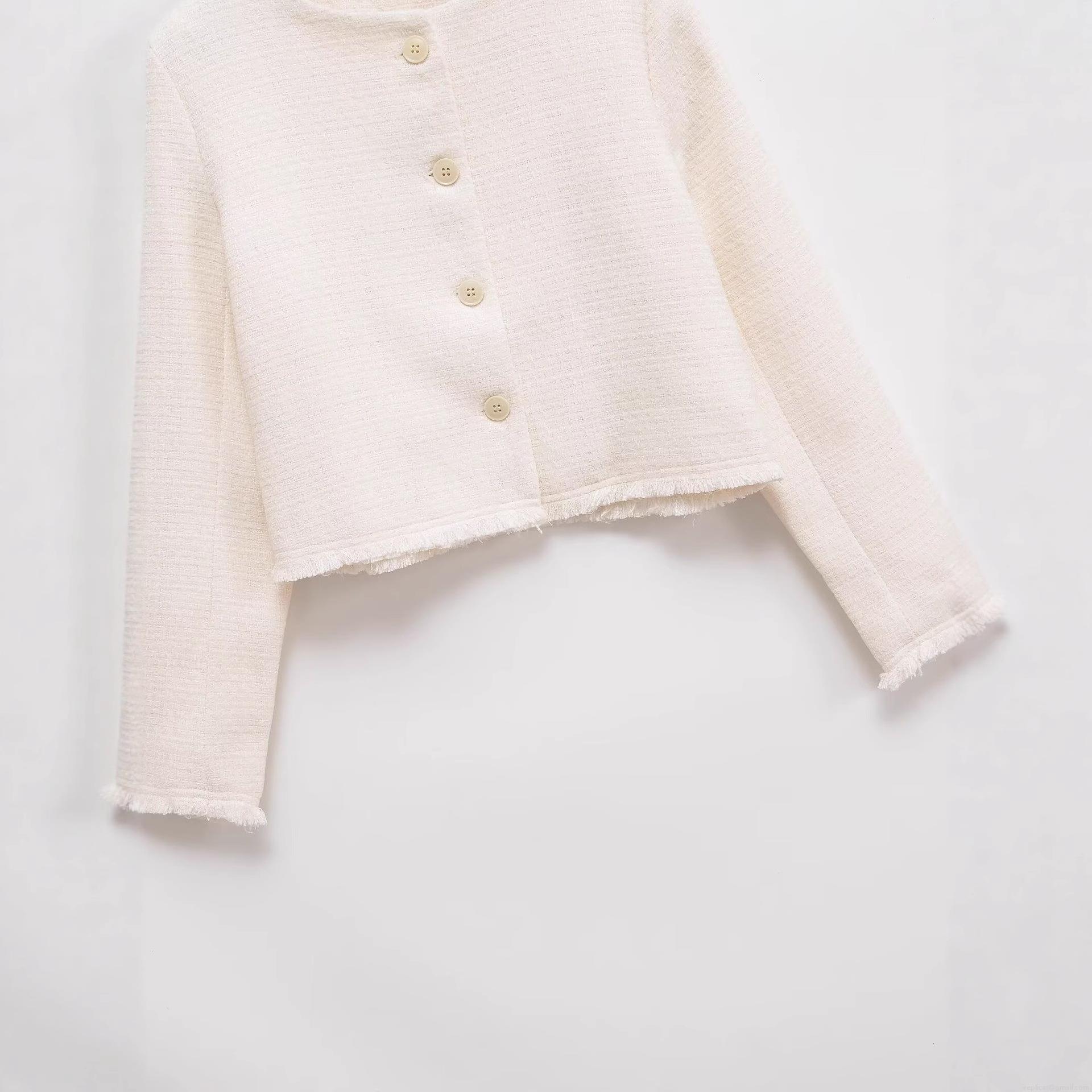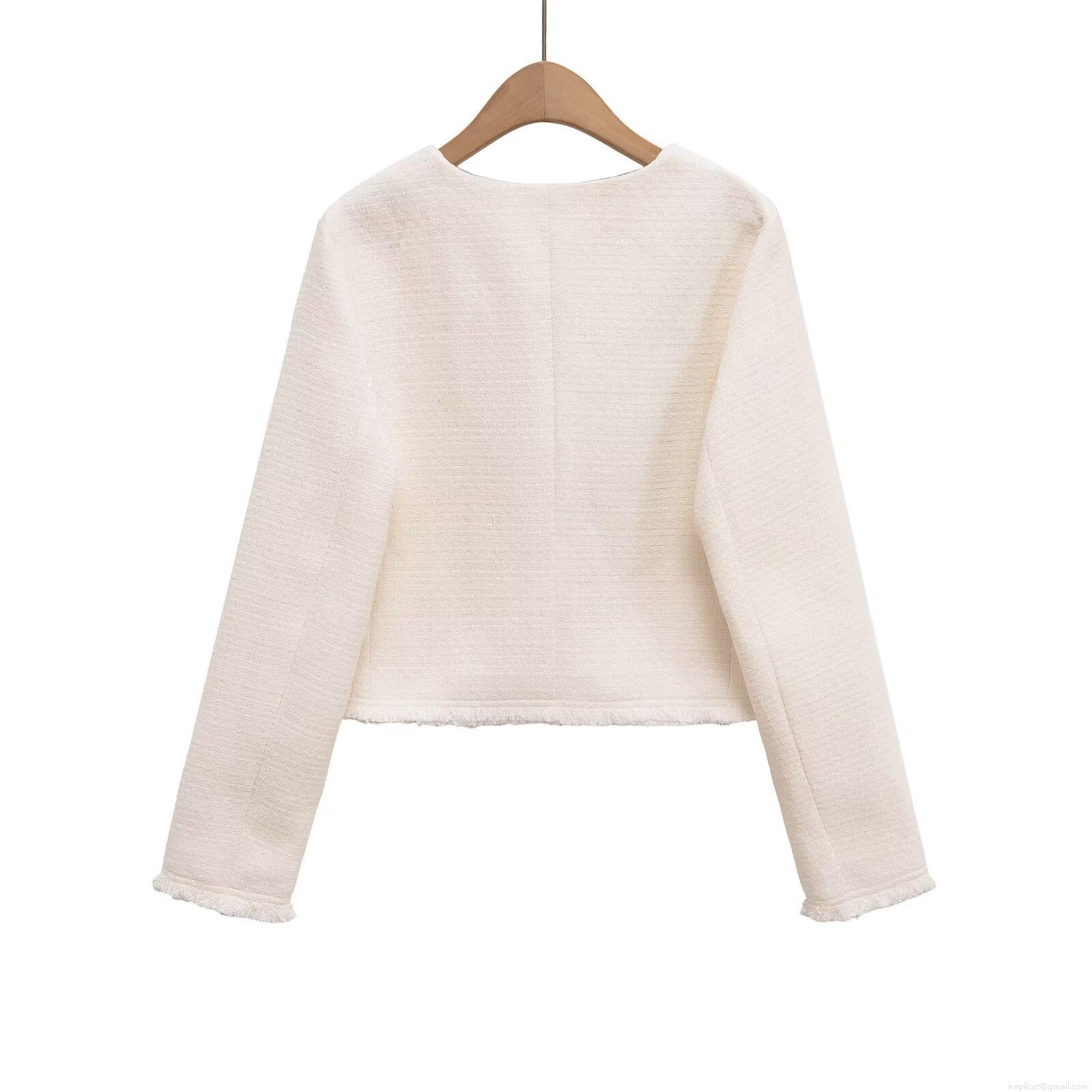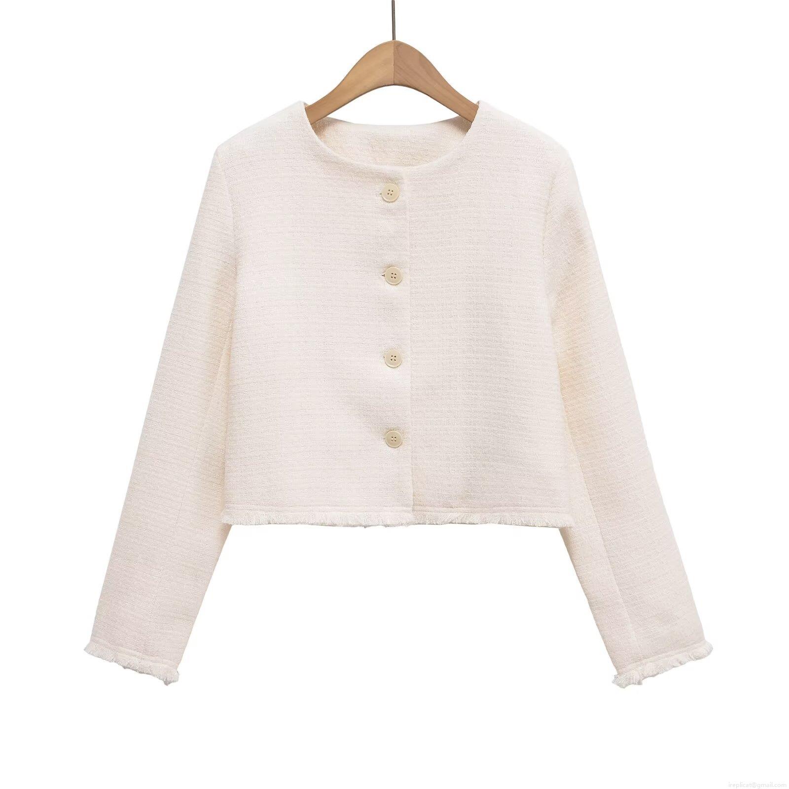 • Women's Elegant Short Tweed Jacket Round Neck Single Breasted Fringed Trim Outwear Long Sleeve Cropped Coat For Office Party Socialite Style