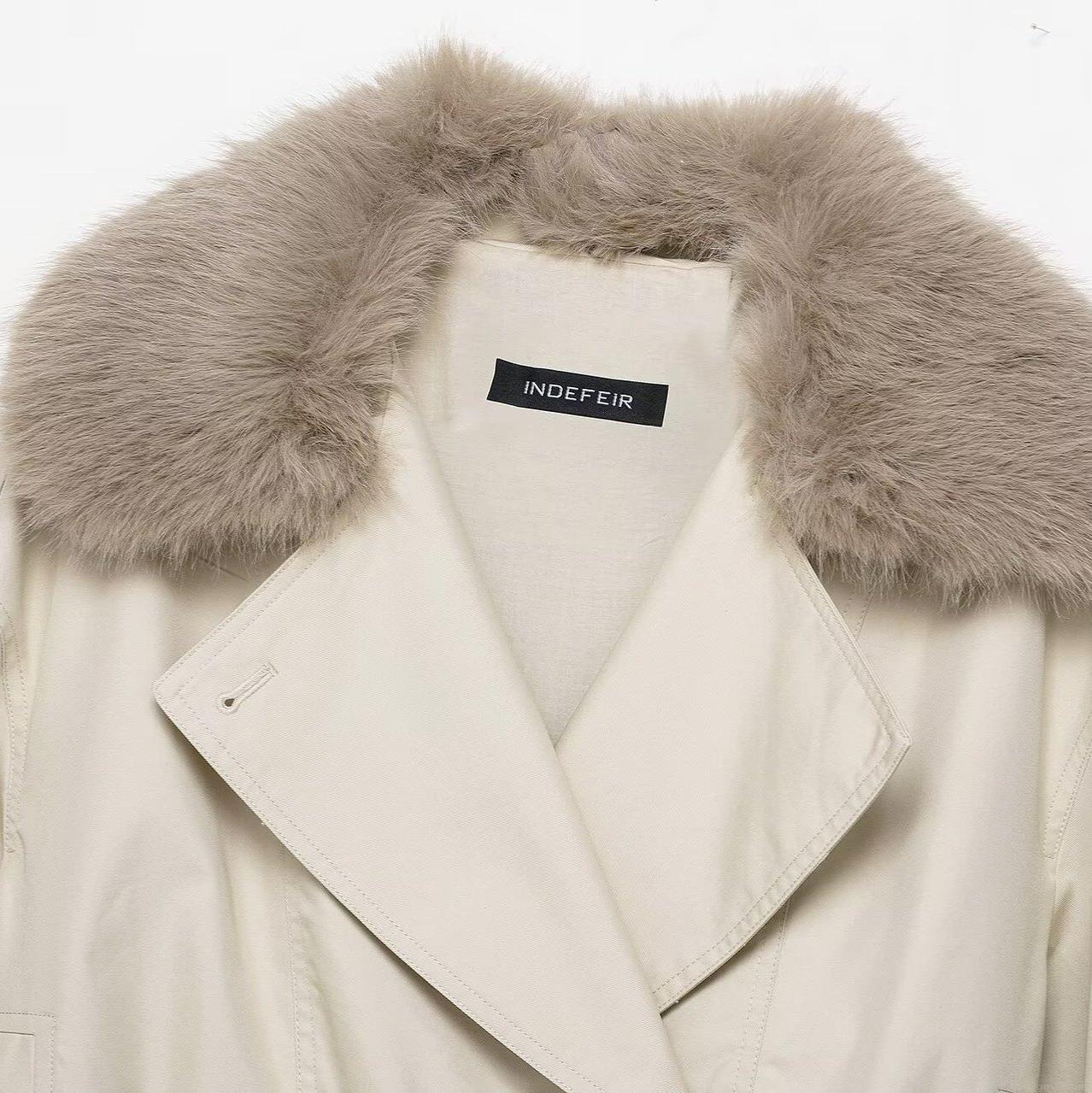 Women's Elegant Short Waterproof Trench Coat With Faux Fur Collar Double Breasted Suede Jacket Solid Color Casual Windbreaker For Lady