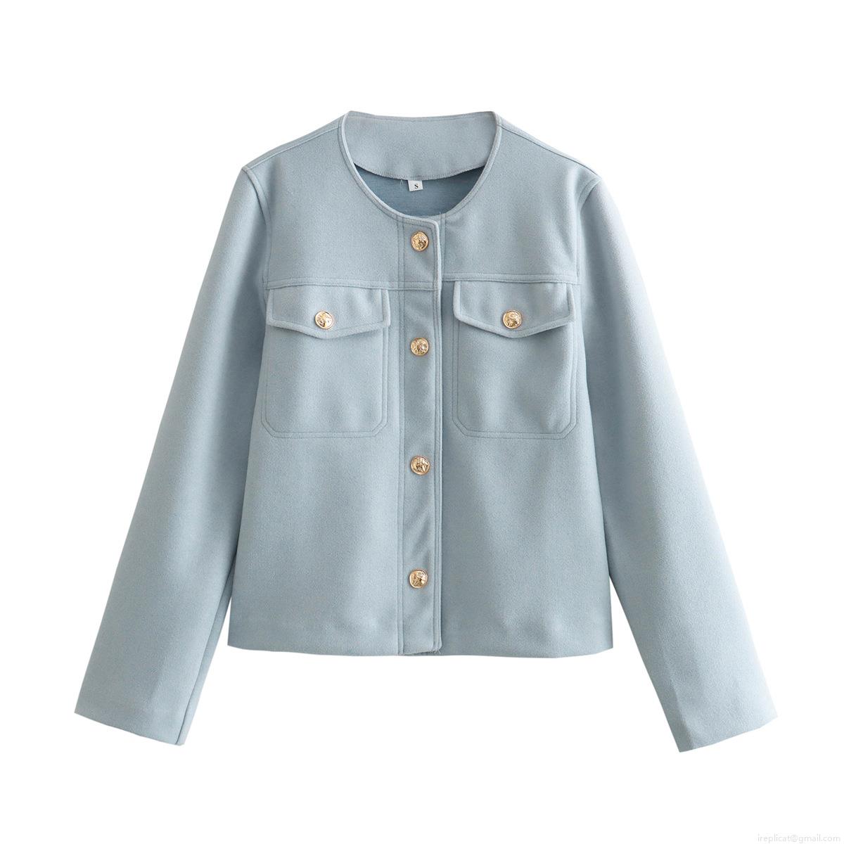 • Women's Elegant Short Woven Outerwear Round Neck Long Sleeve Cardigan Jacket With Gold Buttons And Pockets For Office Daily Chic Ladies