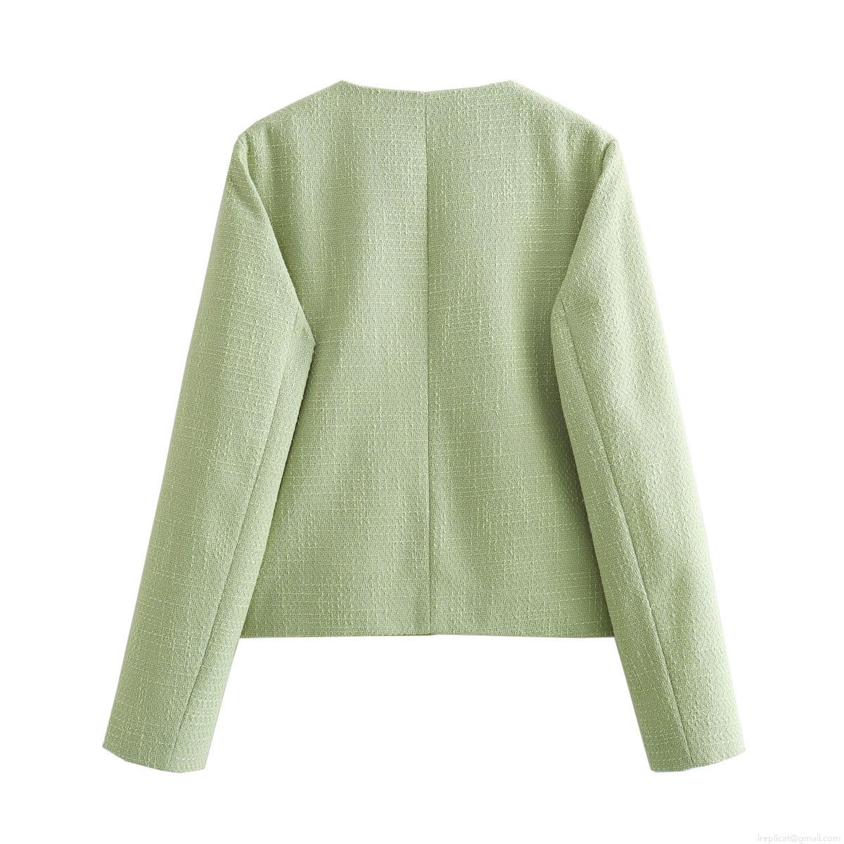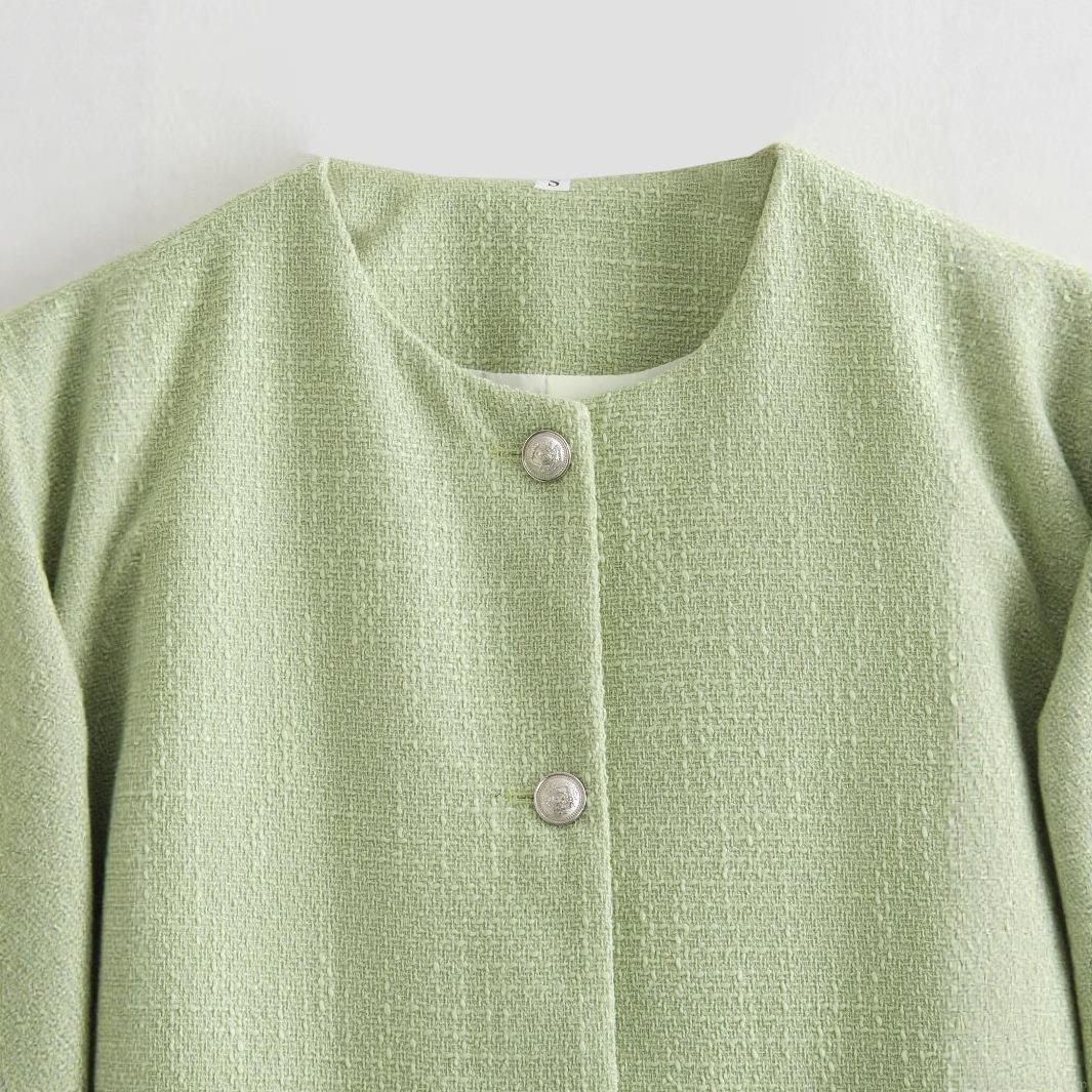 • Women's Elegant Tweed Jacket Short Crop Coat Light Green Crew Neck Long Sleeve Single Breasted Outerwear With Metal Buttons For Daily Work Lady Autumn Spring Fashion Jacket